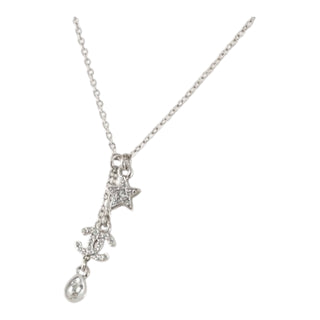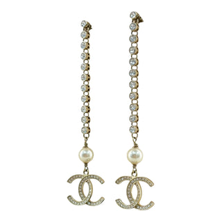 Chanel Silver Tone Crystal CC Faux Pearl Stud & Clear Teardrop Drop Earrings