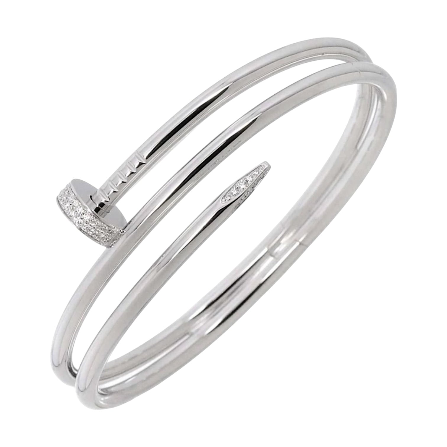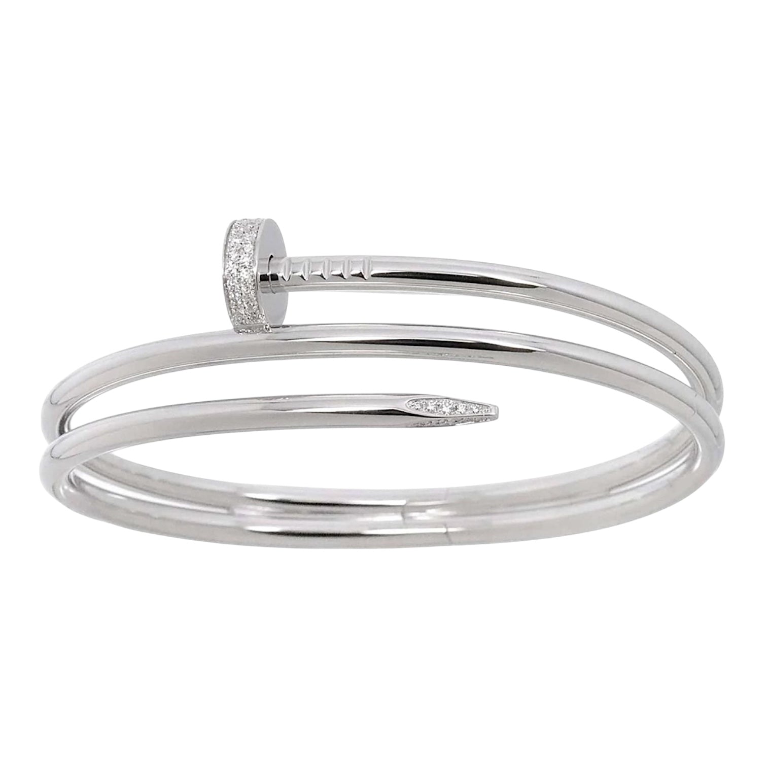 This stunning Cartier Juste Un Clou bracelet reimagines the elegance of a simple nail into a symbol of bold sophistication. Crafted in 18k white gold, the double wrap design coils gracefully around the wrist, accented with a diamond-paved head and tip for a touch of refined brilliance. A modern icon of rebellious luxury, this piece perfectly embodies Cartier’s blend of innovation and timeless craftsmanship.