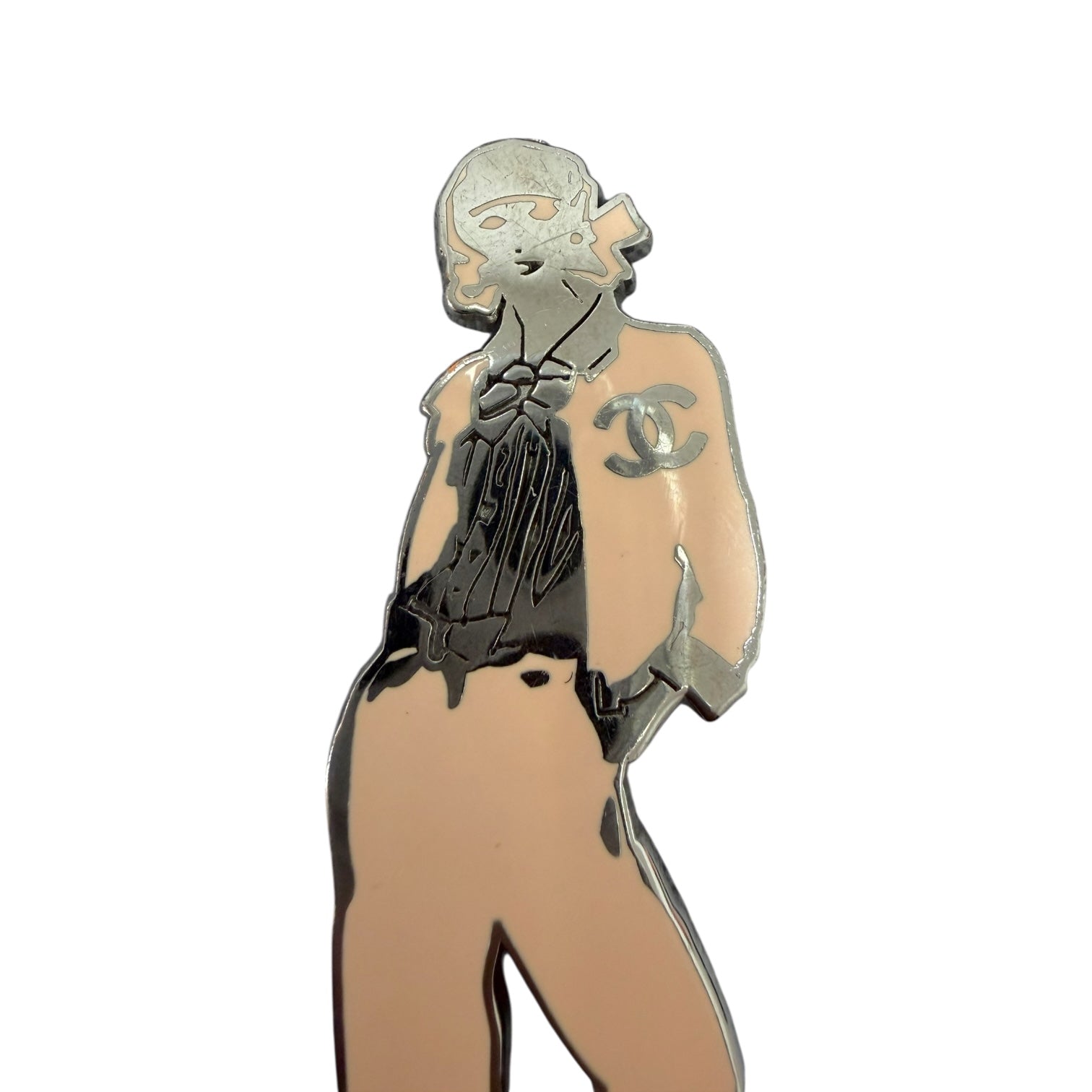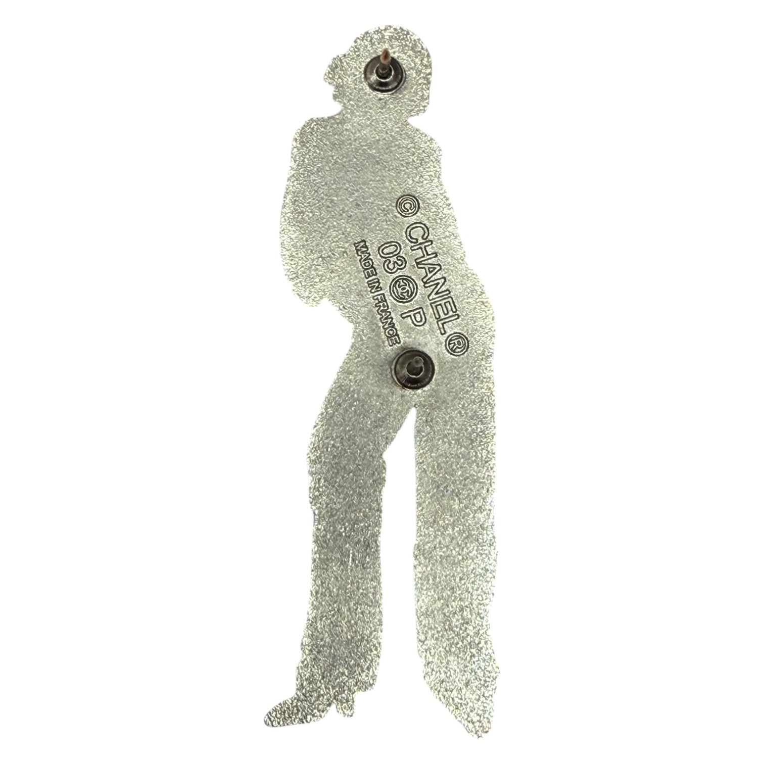 A refined and artistic Chanel brooch featuring Mademoiselle Coco in a sleek silver-tone enamel silhouette. Designed with her classic poised stance and signature Chanel styling, this piece embodies the elegance and heritage of the house. Finished with a secure pin fastening and Chanel hallmark on the reverse, it’s perfect for adding a touch of Parisian charm to jackets, knitwear, and bags.