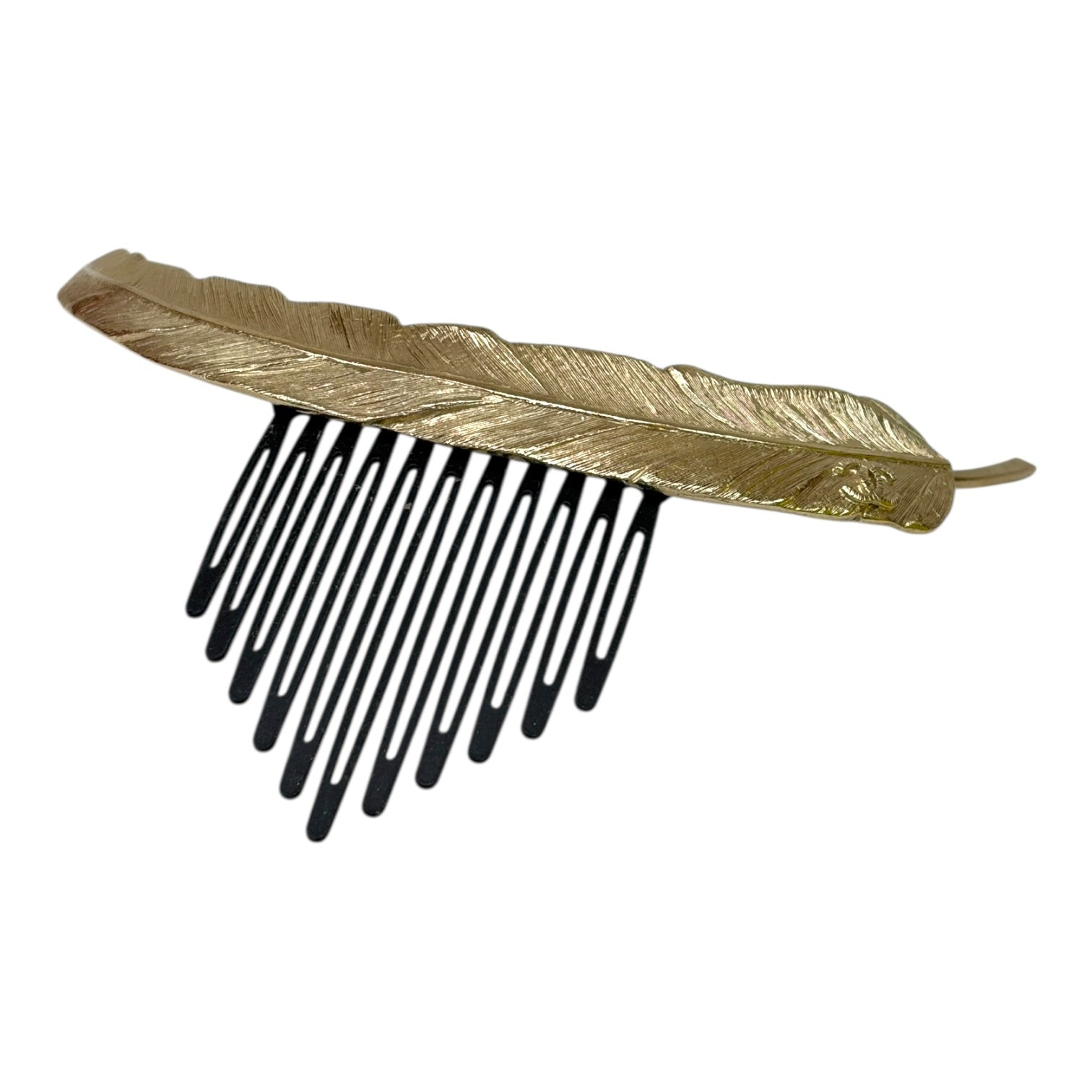 An elegant and statement-making piece, this Chanel Feather Hair Comb Accessory reflects the Maison’s flair for refined yet dramatic accessories. Designed to elevate evening and occasion styling, the hair comb features a singular gold feather, creating graceful movement and texture.The accessory is crafted with a secure comb base, allowing it to be easily placed into an updo, chignon, or swept-back hairstyle.