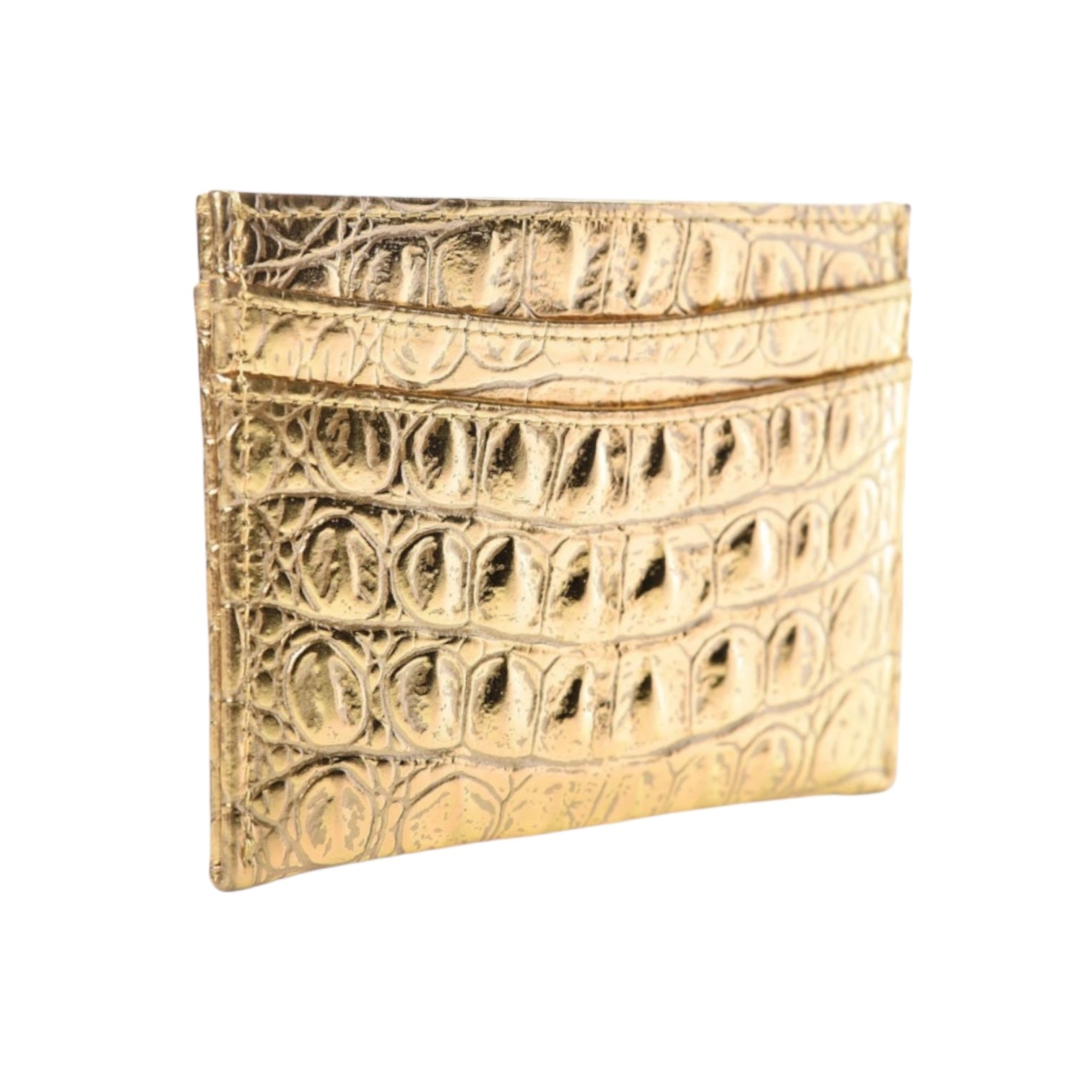 A chic Chanel card holder crafted in gold metallic calfskin with an elegant crocodile-embossed finish. Designed with multiple card slots and subtle signature detailing, it offers a compact yet luxurious accessory with a striking, refined sheen.