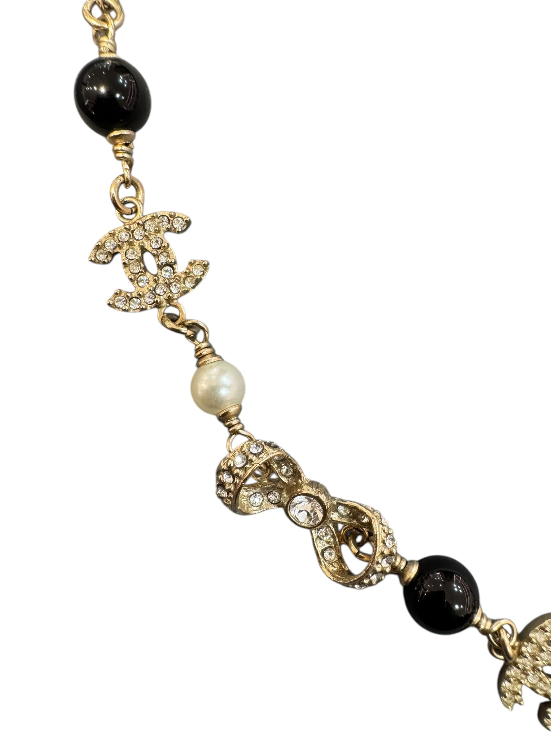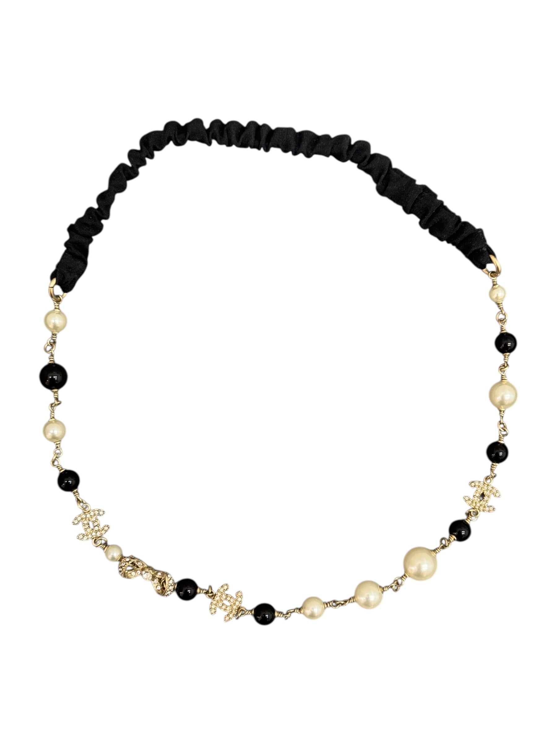 Material: Resin pearls, Black beads, Gold-tone metal, Crystal-studded Chanel logos, Elastic fabric band
