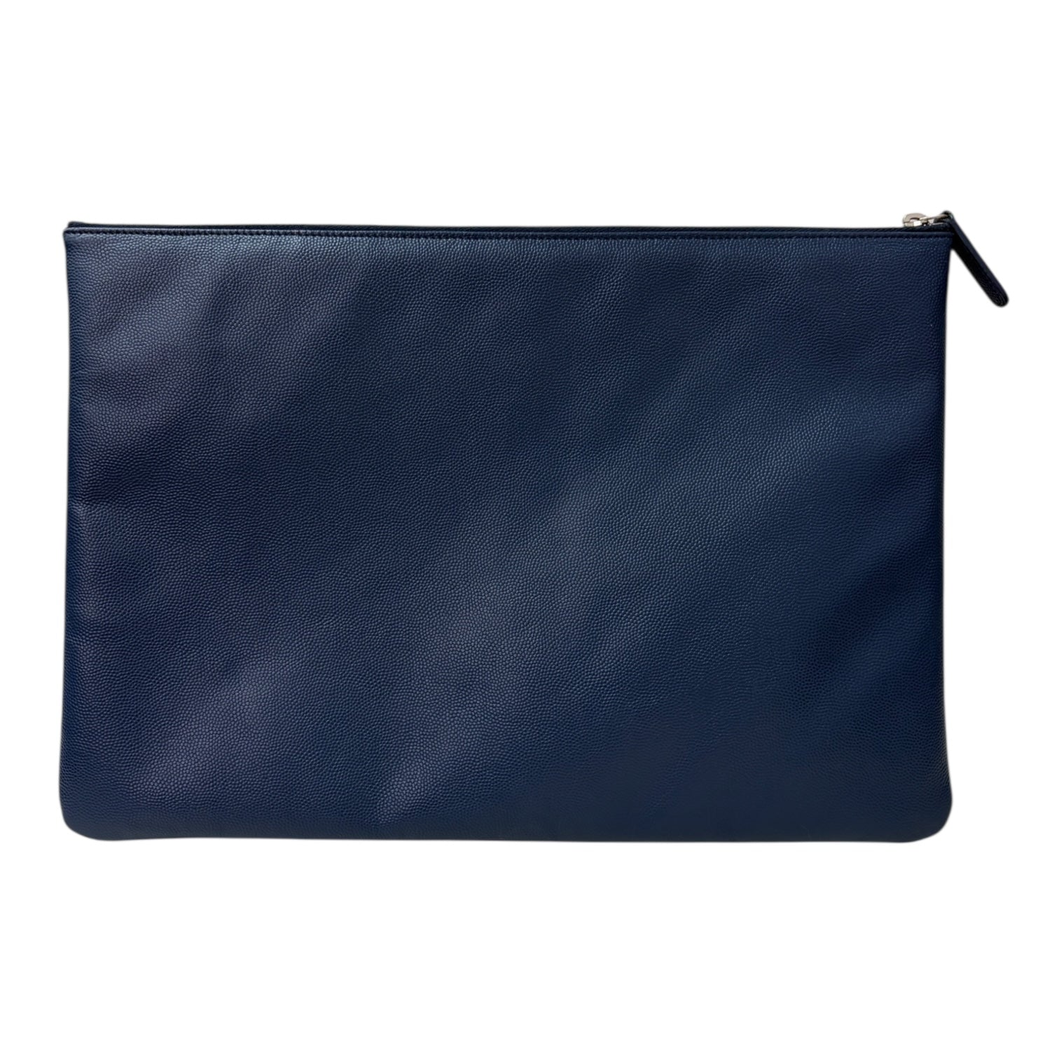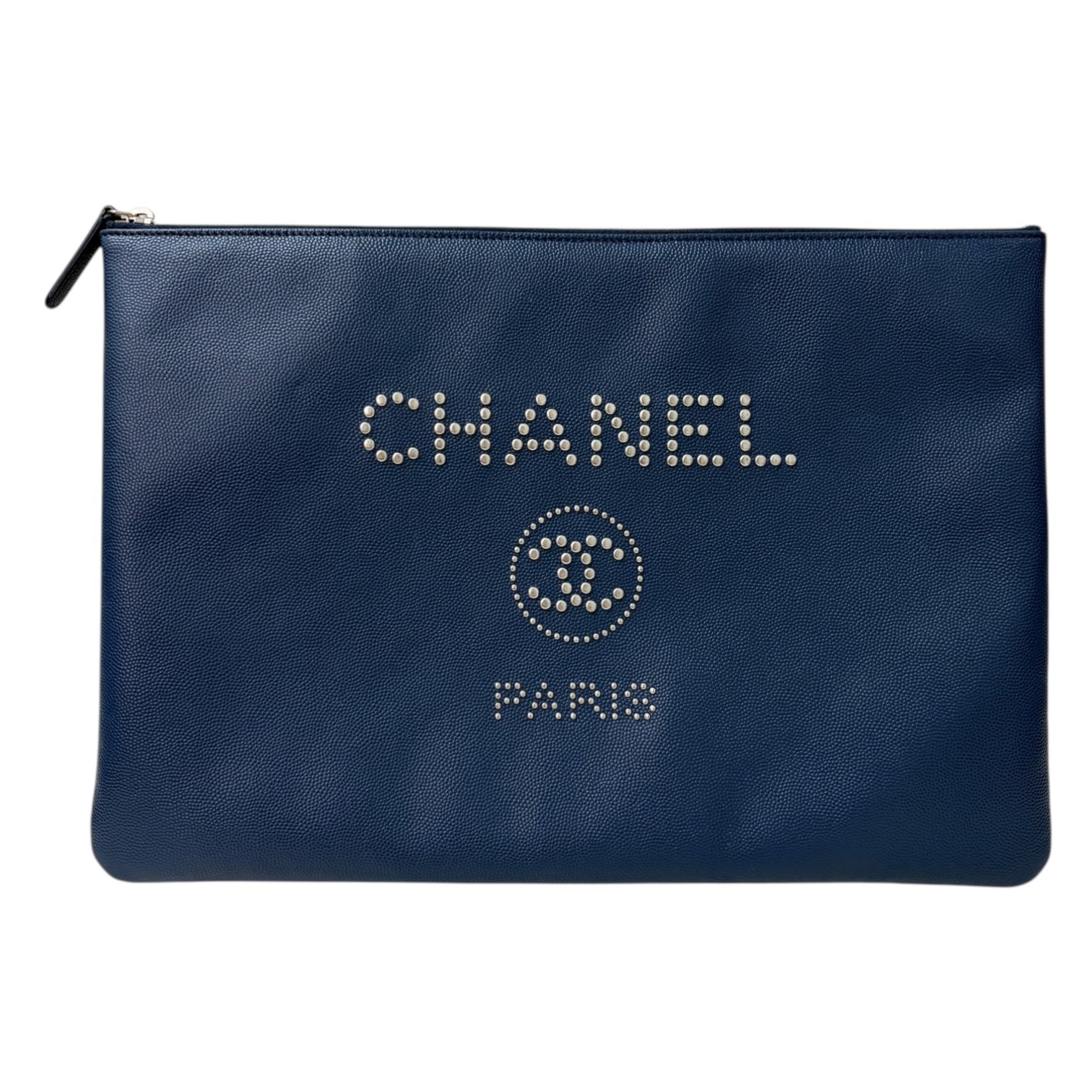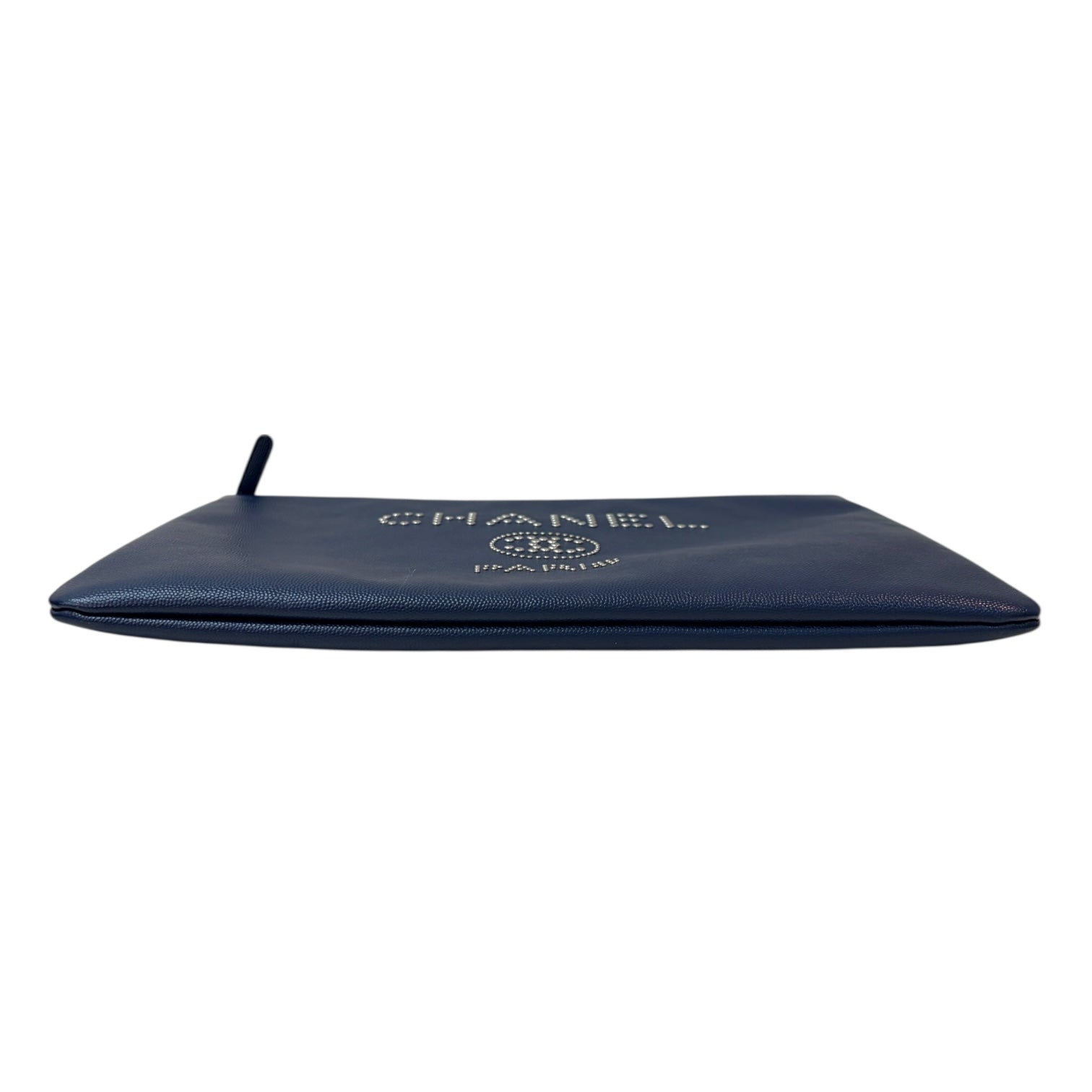 Crafted from supple navy blue calfskin leather, this sleek Chanel clutch features the CHANEL PARIS logo beautifully detailed with silver-tone stud embellishments. The minimalist silhouette with a zip-top closure makes it both stylish and functional — ideal for carrying essentials or using as a statement accessory. A refined piece that exudes modern Chanel elegance with a subtle edge.