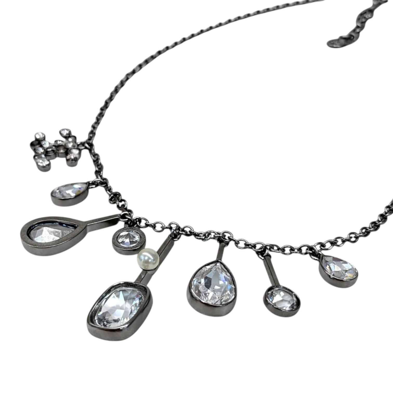 An elegant expression of refined glamour, this Chanel necklace is crafted in a polished silver-tone finish and adorned with delicate crystal-set charms. Designed to catch the light with every movement, it adds a subtle sparkle and timeless sophistication to both day and evening ensembles.