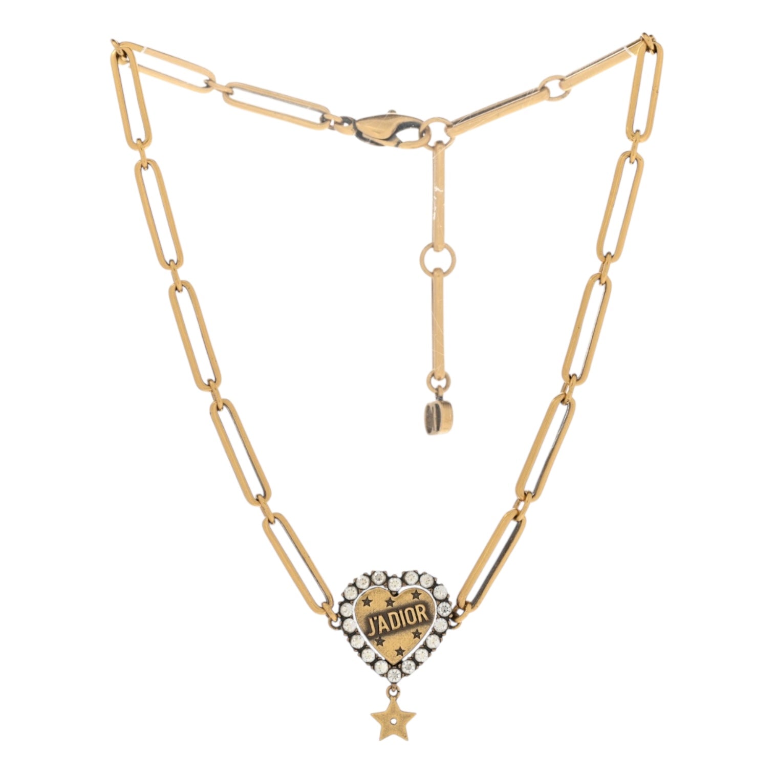 Add a touch of vintage glamour to your collection with this Christian Dior J’Adior choker necklace, crafted in aged gold-finish metal. The centerpiece features a bold heart pendant engraved with 'J’Adior', framed by dazzling clear crystals and accented with delicate star motifs. A dangling star charm adds playful movement, while the chunky chain links bring an edgy yet refined touch. Perfect for elevating both day and evening looks, this statement necklace embodies Dior’s modern romantic aesthetic.