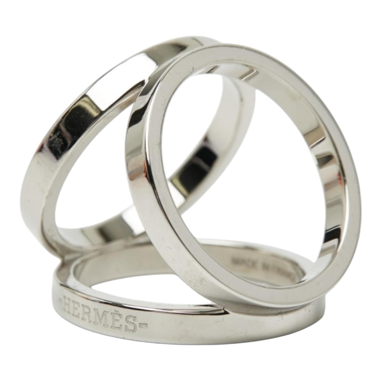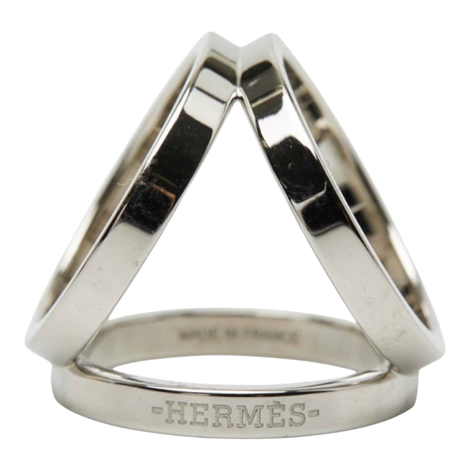 Sleek Hermès Trio scarf ring crafted in polished palladium-plated metal with a sculptural triangular design and engraved Hermès signature. An elegant and practical accessory for styling silk scarves, adding a refined finishing touch to both classic and contemporary looks.