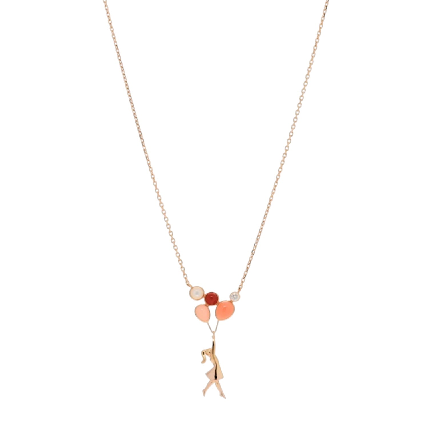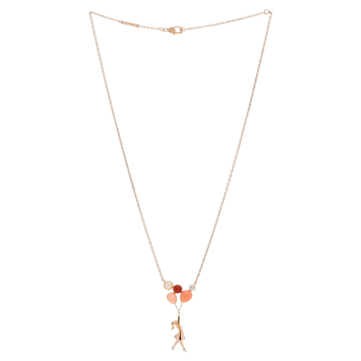 An enchanting Van Cleef & Arpels “Mercredi à Paris” necklace, meticulously crafted in 18K rose gold. This whimsical design depicts a girl carried by balloons — a signature poetic motif from the Contes d’Hiver collection — symbolizing freedom and imagination. The balloons are beautifully composed of coral, mother-of-pearl, and carnelian, accented by a brilliant-cut diamond for a touch of sparkle. Suspended on a delicate rose gold chain, this creation captures the maison’s romantic artistry and Parisian charm, making it a rare collector’s piece of wearable poetry.