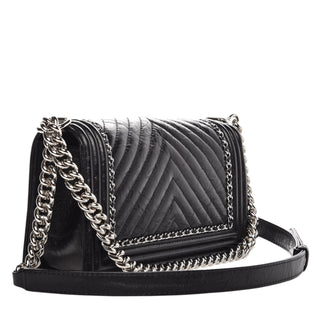 Chanel Black Aged Calfskin Chain V-Stitch Chevron Shoulder Medium Boy Bag