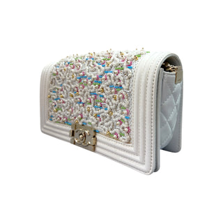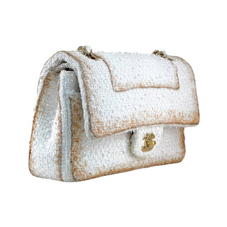 Chanel White Tweed Double Flap Bag With Gold Glitter Trim Detailing