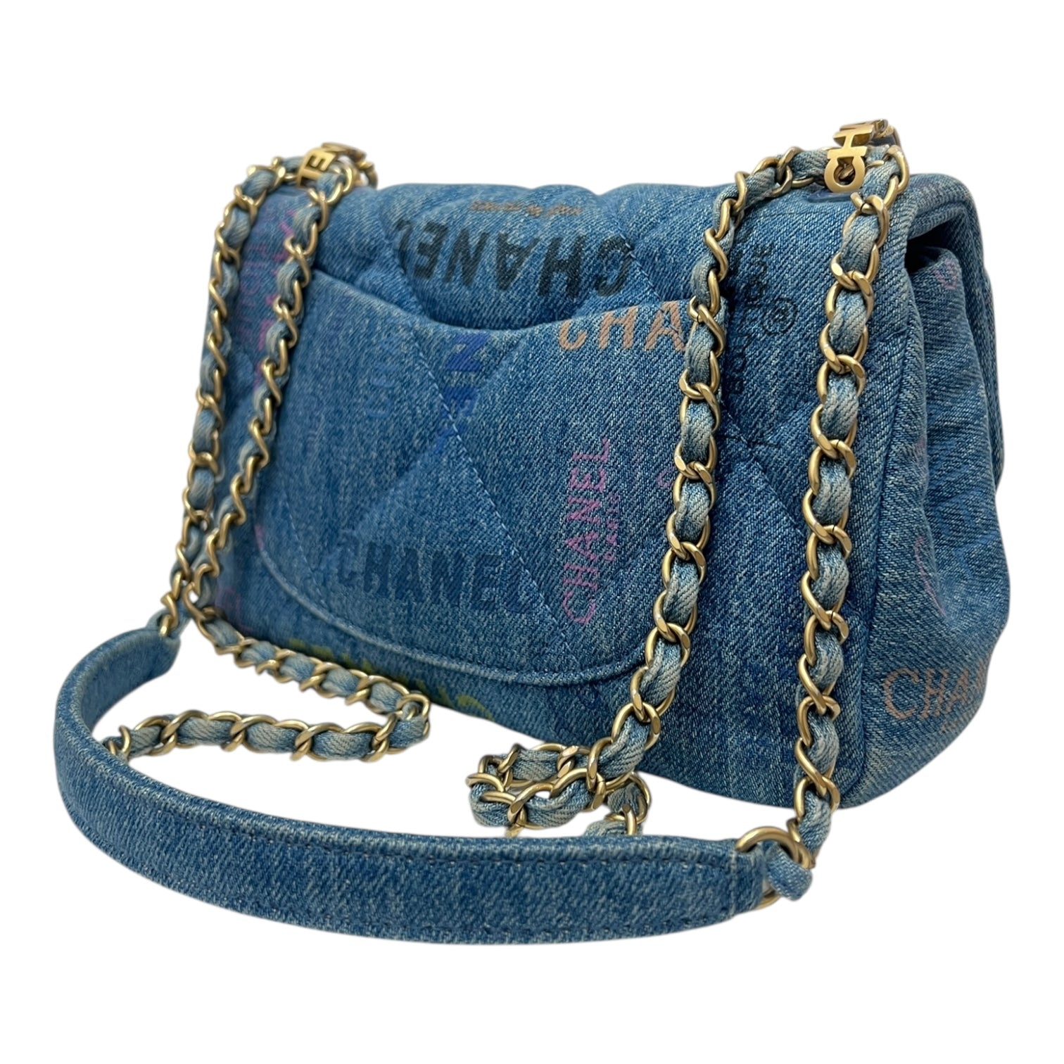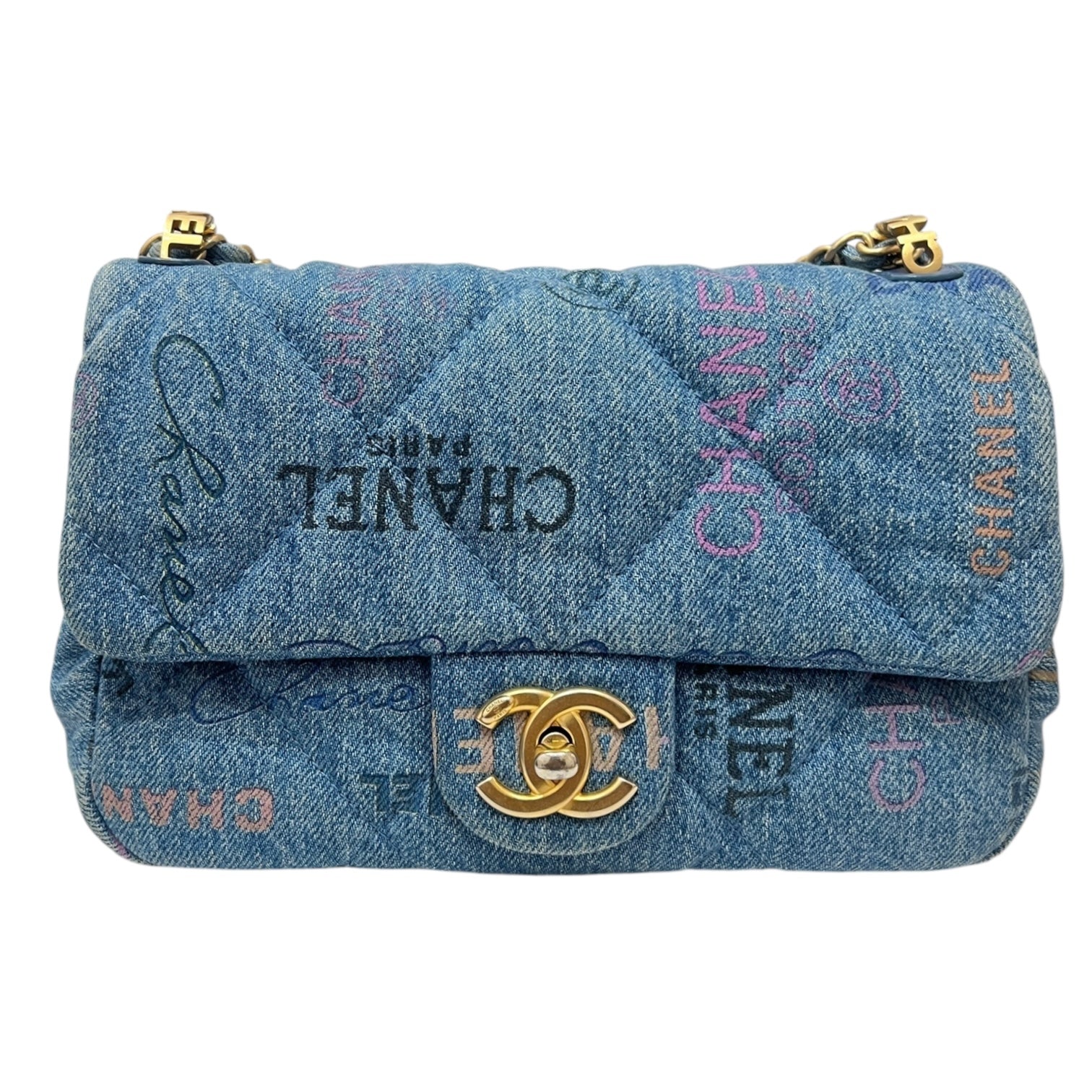 Playful yet timeless, this Chanel Mini Rectangular Flap is crafted from quilted blue denim, featuring multicoloured “Chanel” logo lettering throughout for a bold, street-chic aesthetic. Finished with the signature CC turn-lock in gold-tone hardware and a leather-woven chain strap, it offers versatile styling options—worn crossbody or on the shoulder. Compact and stylish, this rare piece captures the spirit of casual luxury, making it a standout addition to any Chanel collection.
