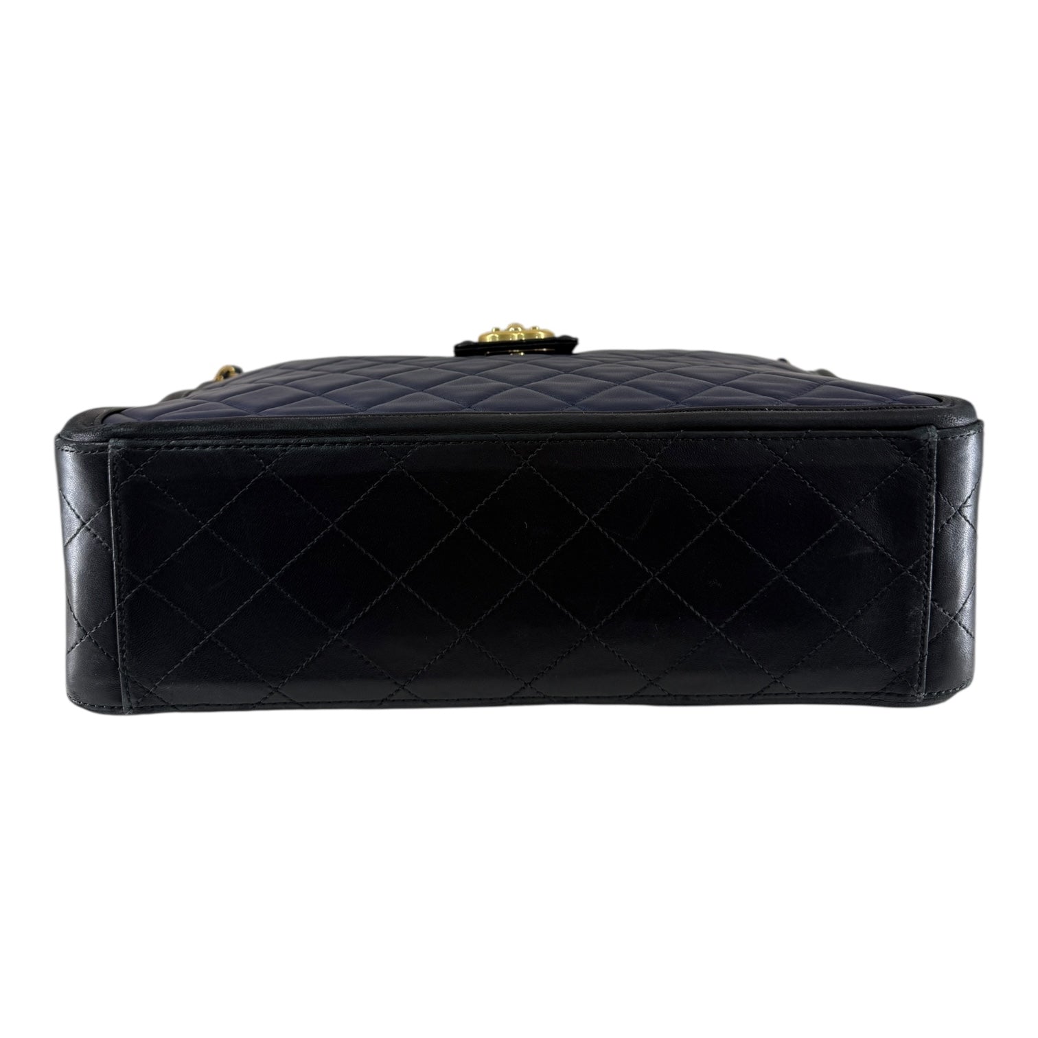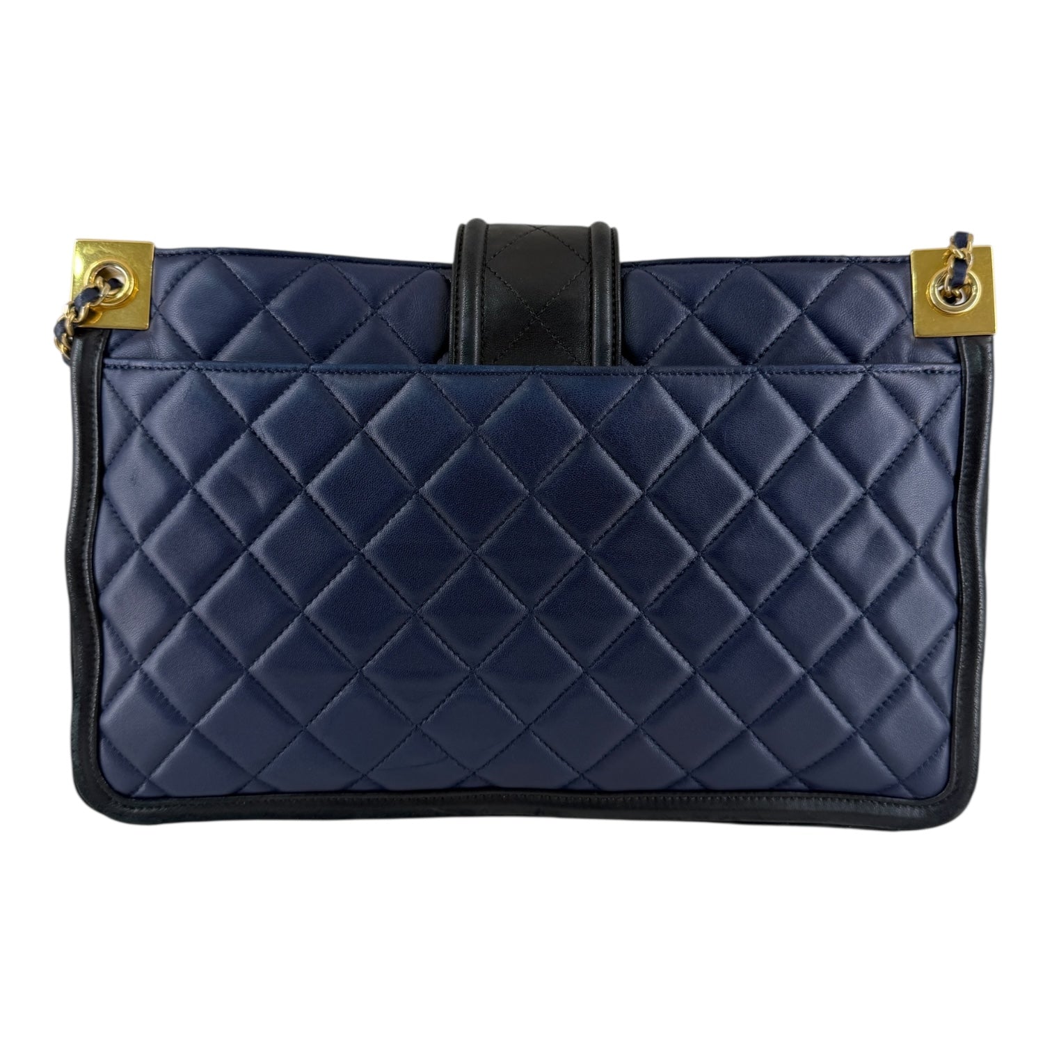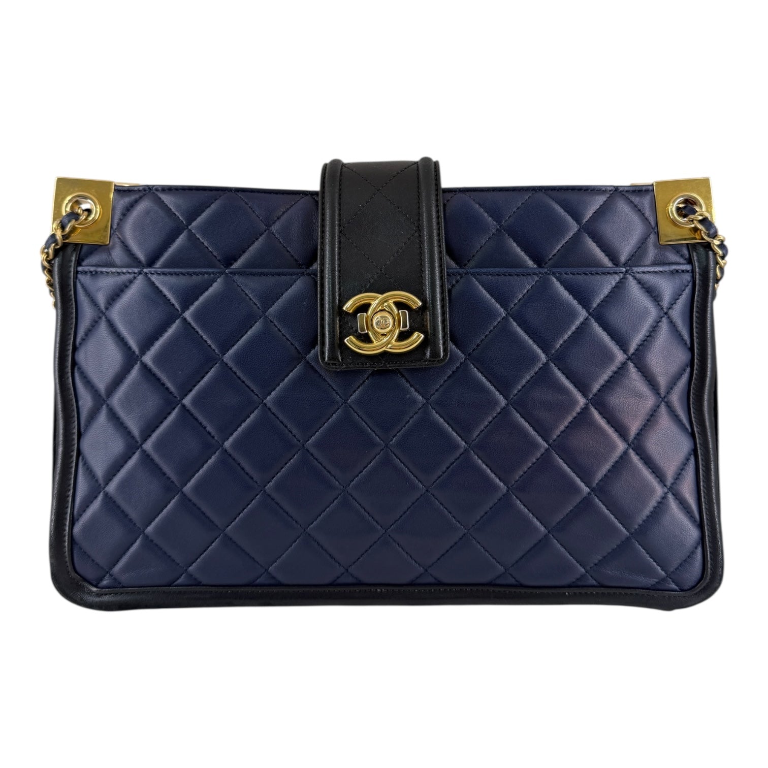A timeless Chanel quilted flap bag crafted in smooth navy leather with elegant black leather trim and signature gold-tone CC turn-lock hardware. Featuring the iconic diamond quilting, leather-interwoven chain strap, and structured silhouette, this classic piece is perfect for both day and evening wear. A sophisticated investment bag from Chanel with enduring style and versatility.