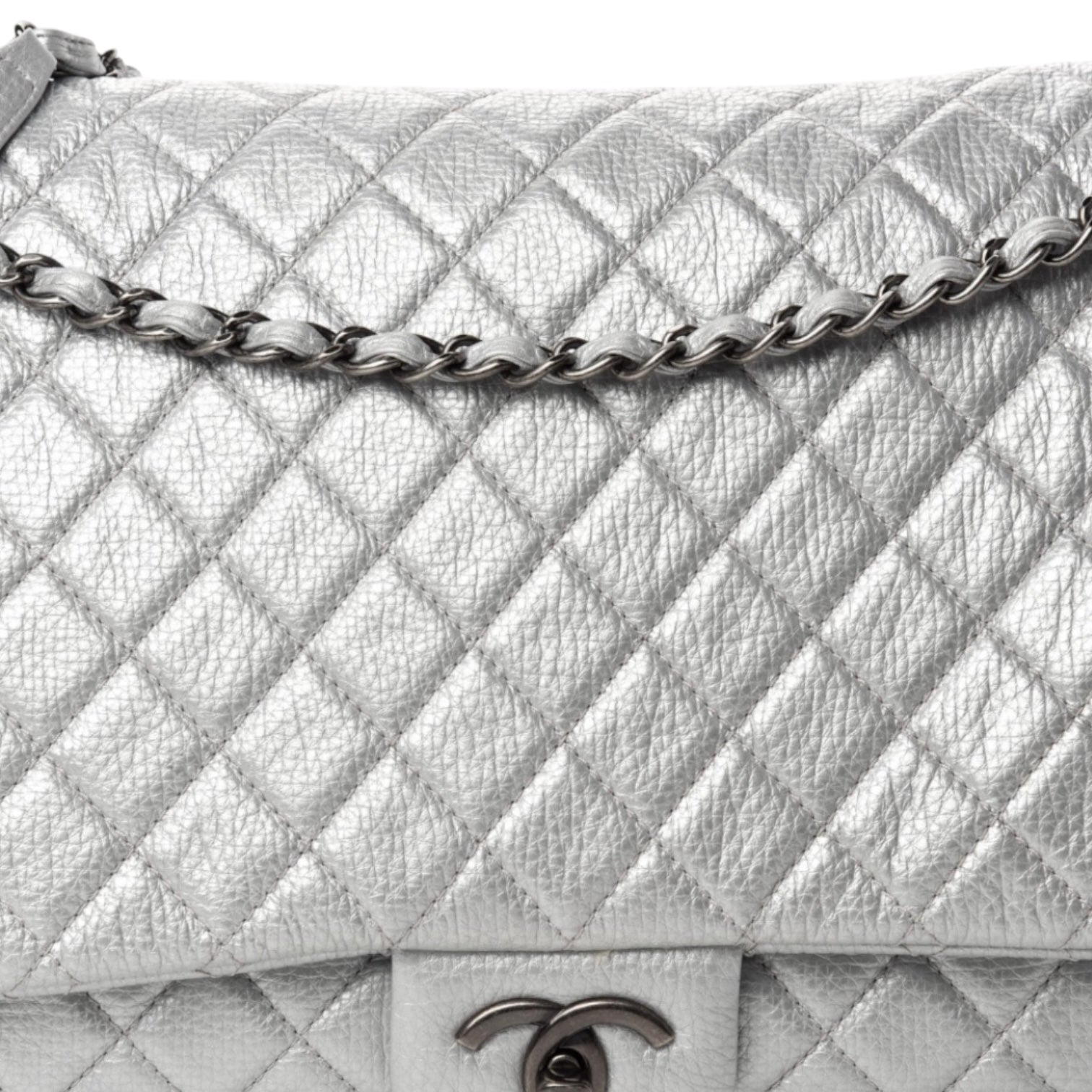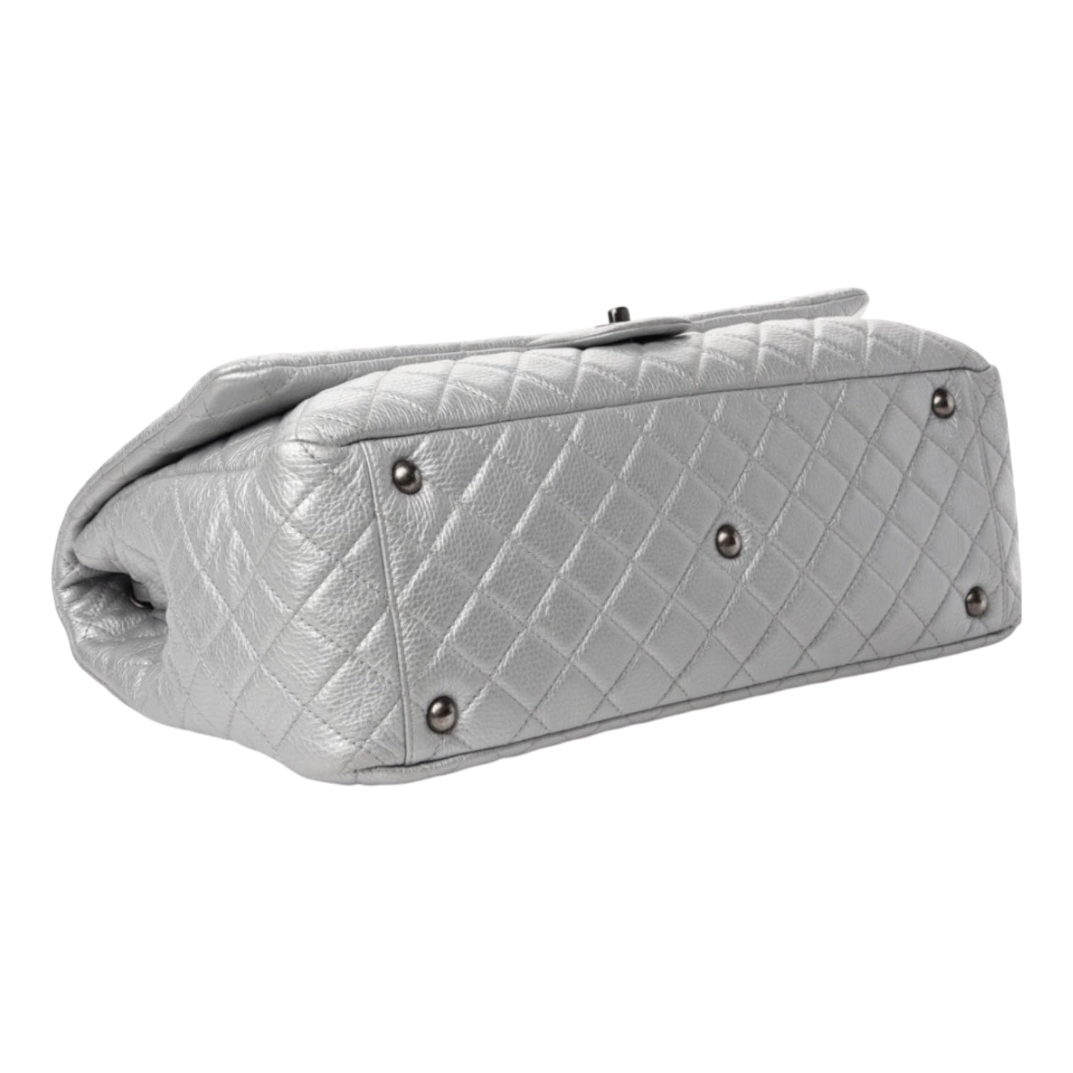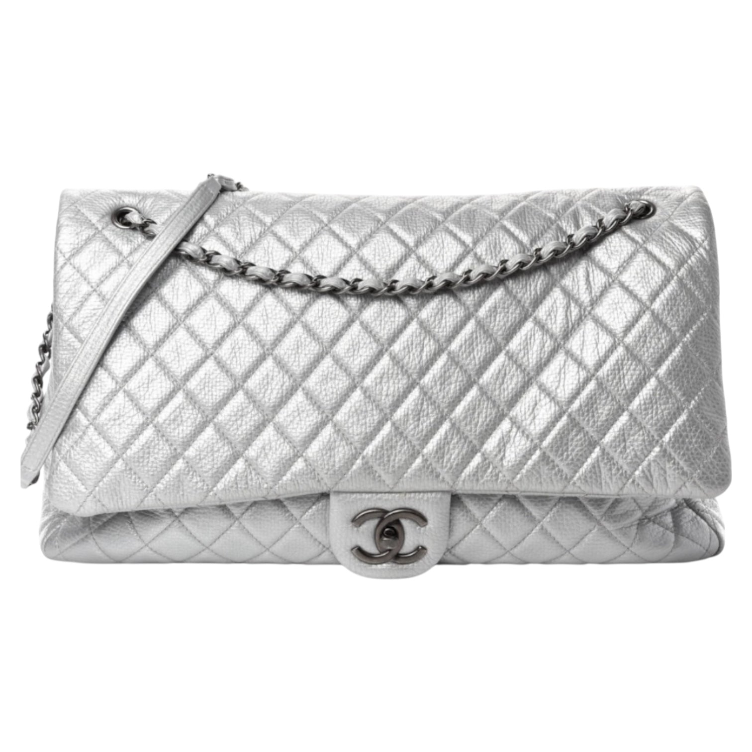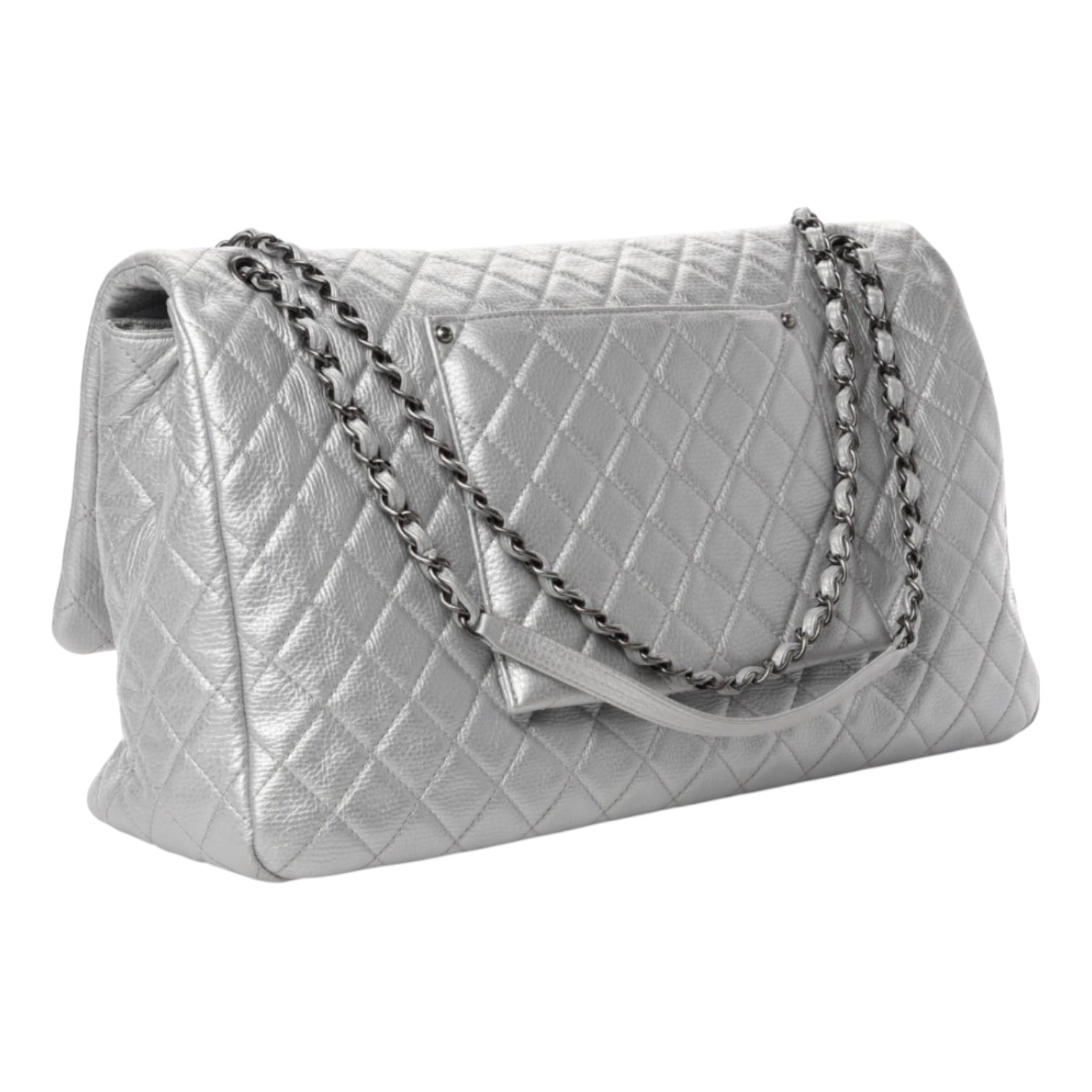 A striking and spacious statement piece, this Chanel XXL Travel Flap Bag is crafted from silver metallic calfskin with signature diamond quilting and oversized proportions. Finished with silver-tone hardware and the iconic CC turn-lock, it offers a bold modern look while remaining unmistakably Chanel. Designed for travel or elevated everyday use, the roomy interior makes it both practical and luxurious.