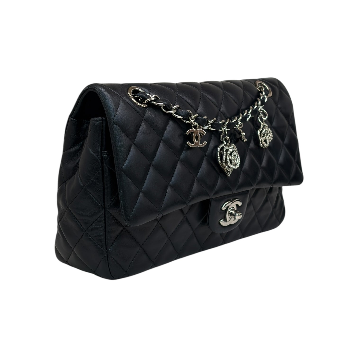 A romantic twist on a classic, this Chanel Medium Flap Bag is crafted from supple black quilted lambskin and adorned with sparkling Valentine’s crystal charms — including hearts, camellias, and the iconic CC logo — draped elegantly across the front chain. Finished with silver-tone hardware and the signature CC turn-lock closure, this piece captures timeless Chanel elegance with a playful, feminine edge. Perfect for adding a touch of glamour to any day or evening look.