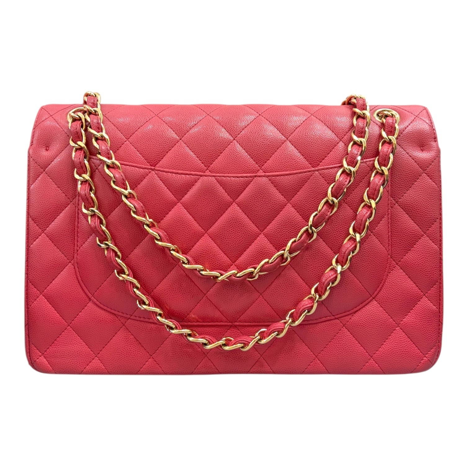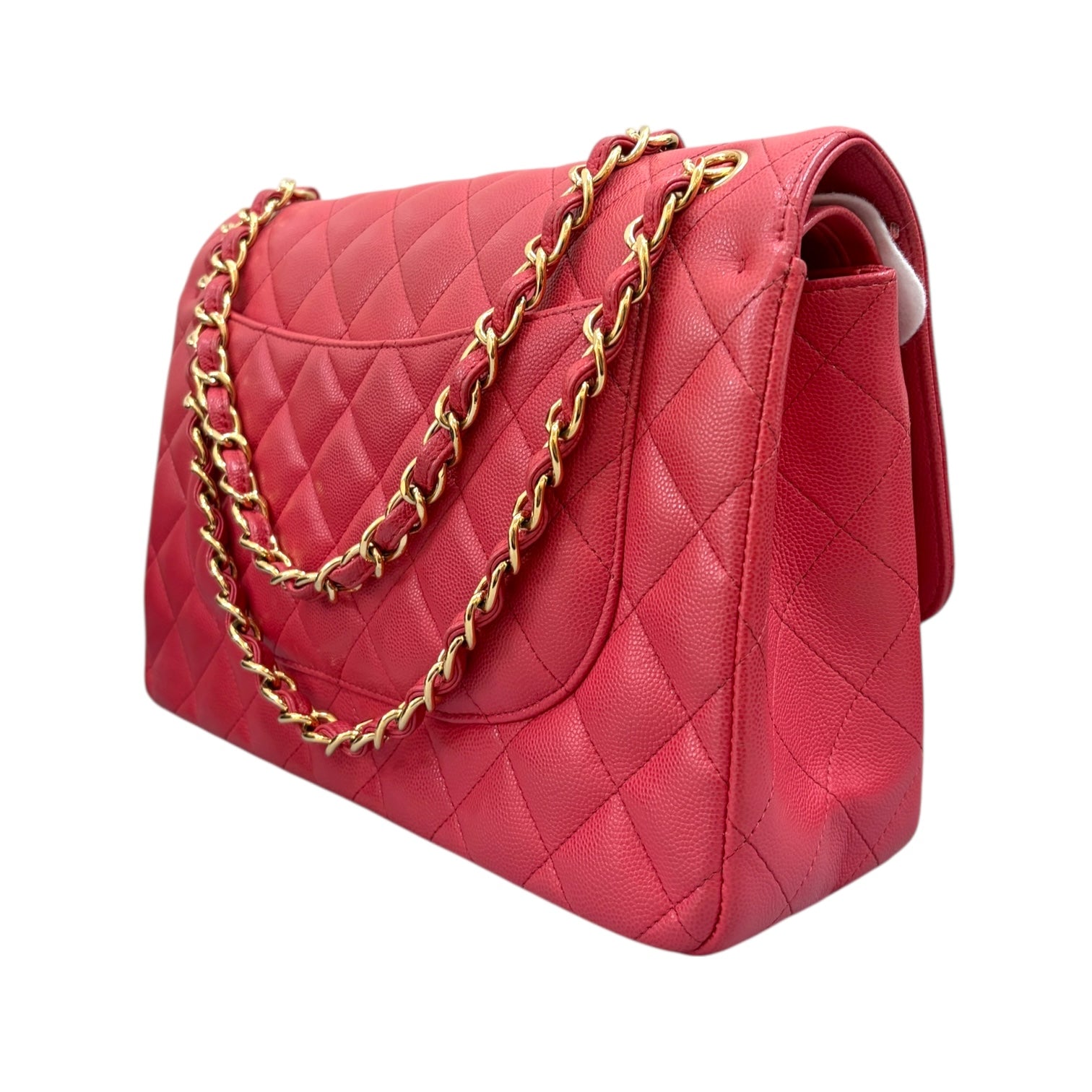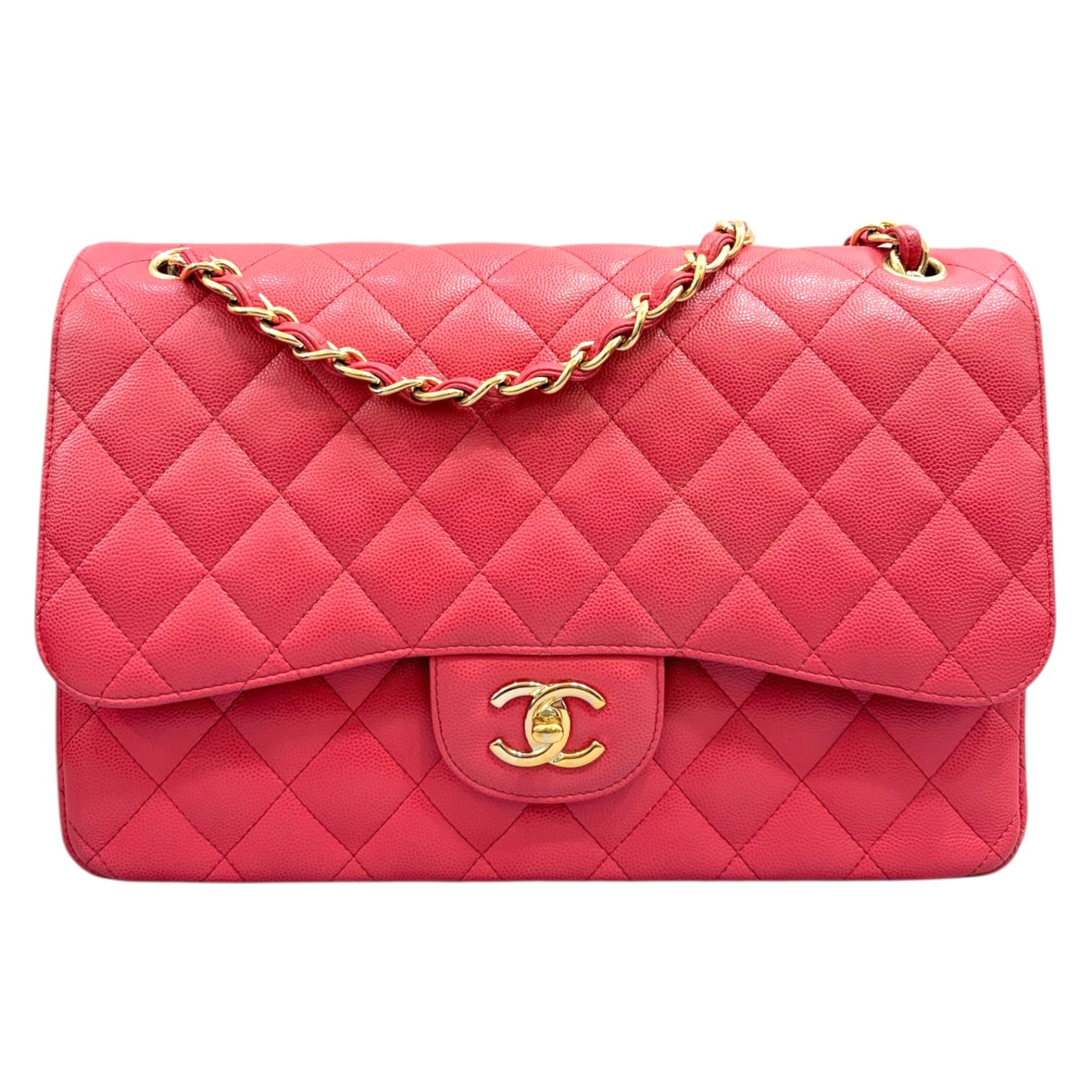 This stunning Chanel Jumbo Double Flap Bag is crafted from durable caviar leather in a vibrant coral pink hue. The classic diamond quilting is complemented by the signature interlocking CC turn-lock closure and a leather-woven gold chain strap that can be worn on the shoulder or crossbody. Featuring a double flap interior for added security and timeless structure, this elegant piece perfectly balances sophistication with a pop of modern color — an exquisite statement for both day and evening wear.