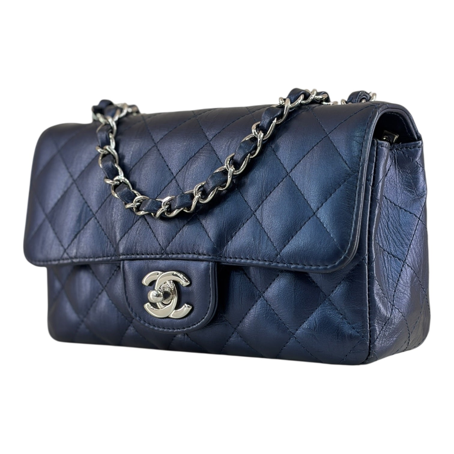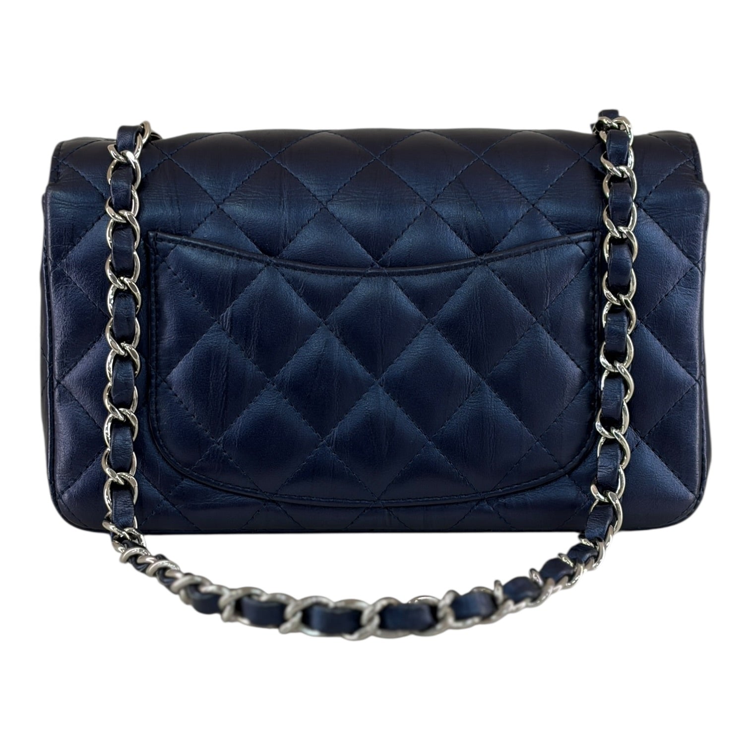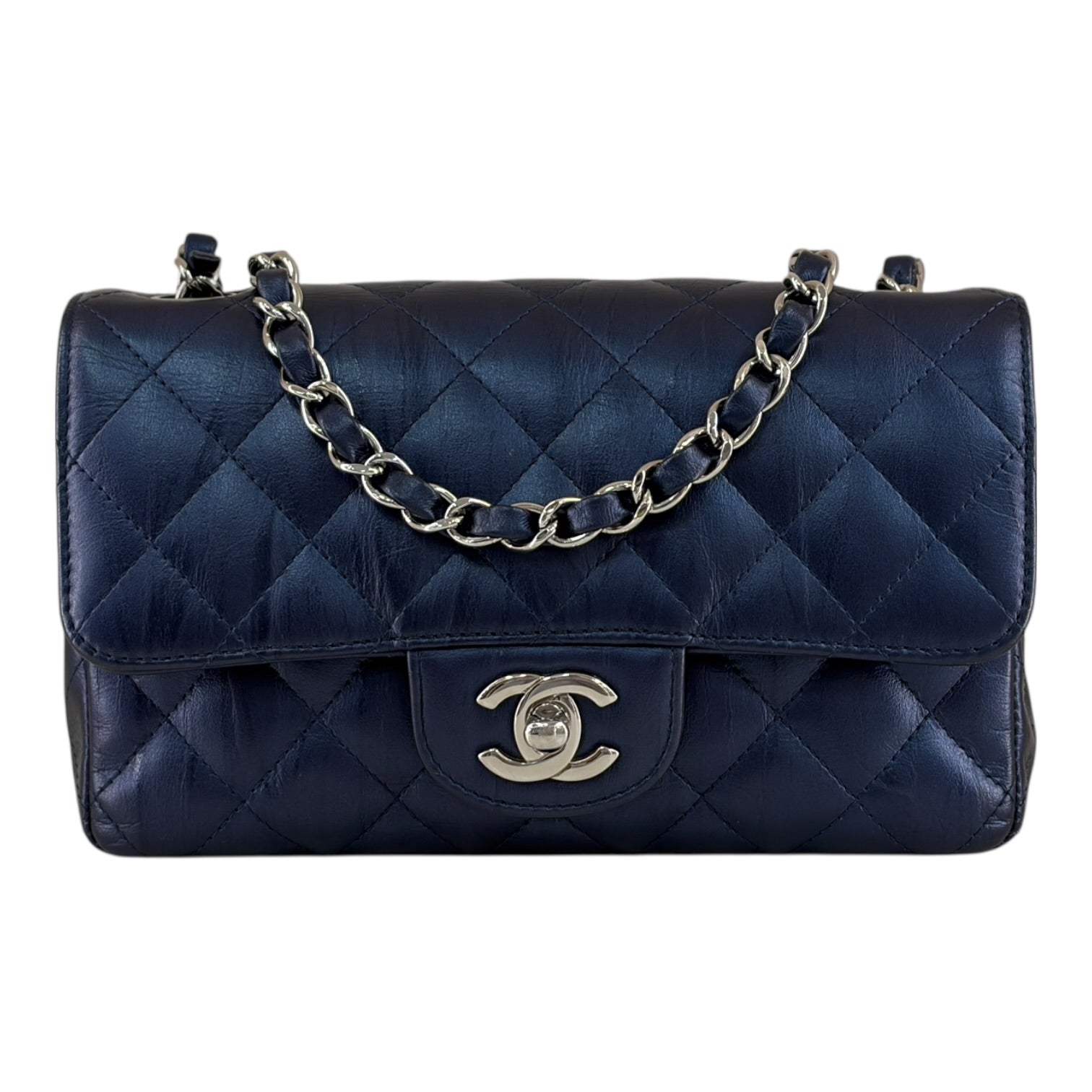A timeless and highly sought-after Chanel piece, this Mini Rectangular Classic Flap bag is crafted from luxurious quilted lambskin leather in an elegant navy blue tone. The iconic diamond quilting enhances the soft texture of the leather while maintaining the structured silhouette that defines Chanel’s most recognisable handbag design.