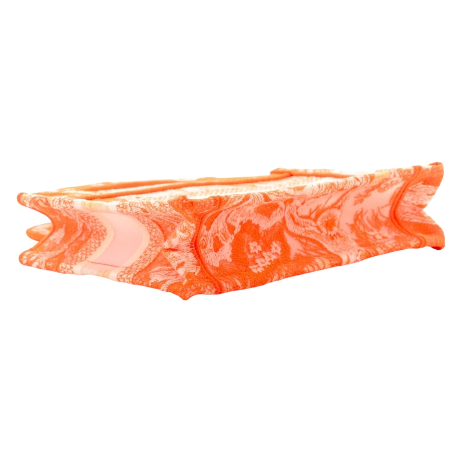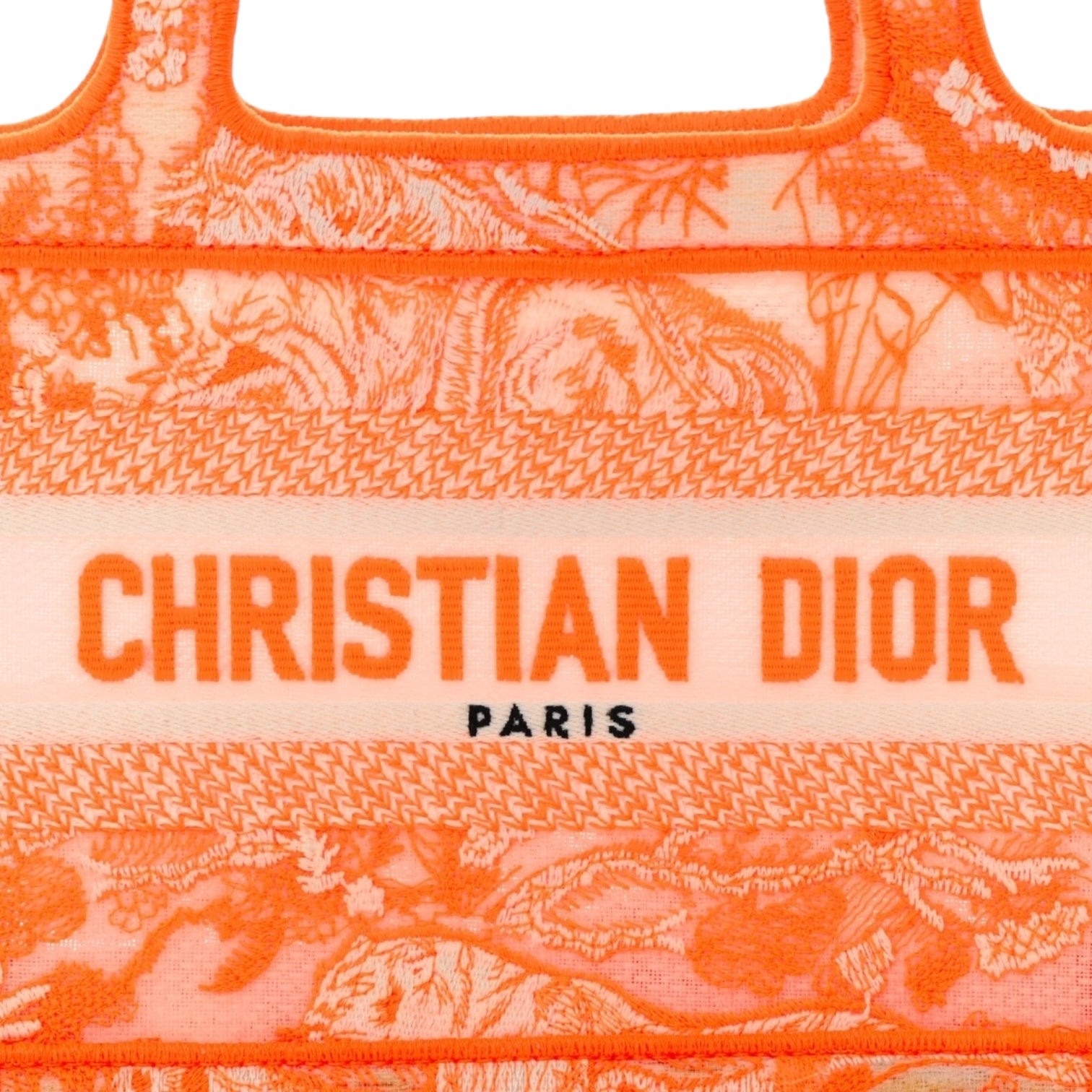 A standout piece from Dior’s iconic Book Tote collection, this Mini Book Tote is crafted in vibrant orange embroidered canvas, featuring the signature Toile de Jouy motif—a tribute to Dior’s heritage prints. The front is adorned with the classic “CHRISTIAN DIOR PARIS” logo embroidery, framed by intricate, tonal animal and botanical patterns. Lightweight yet structured, this compact version is perfectly sized for daily essentials, offering a bold pop of color with effortless elegance.