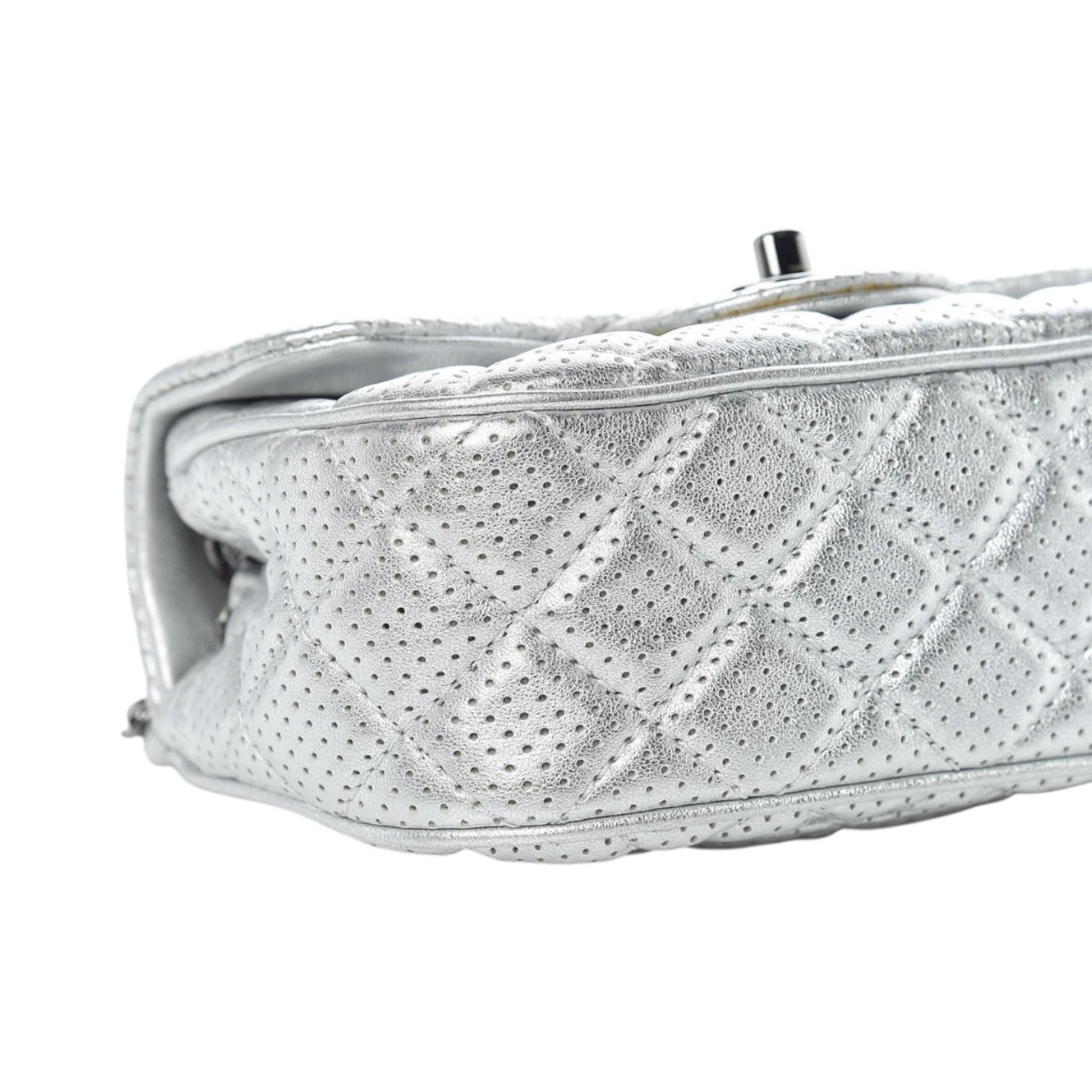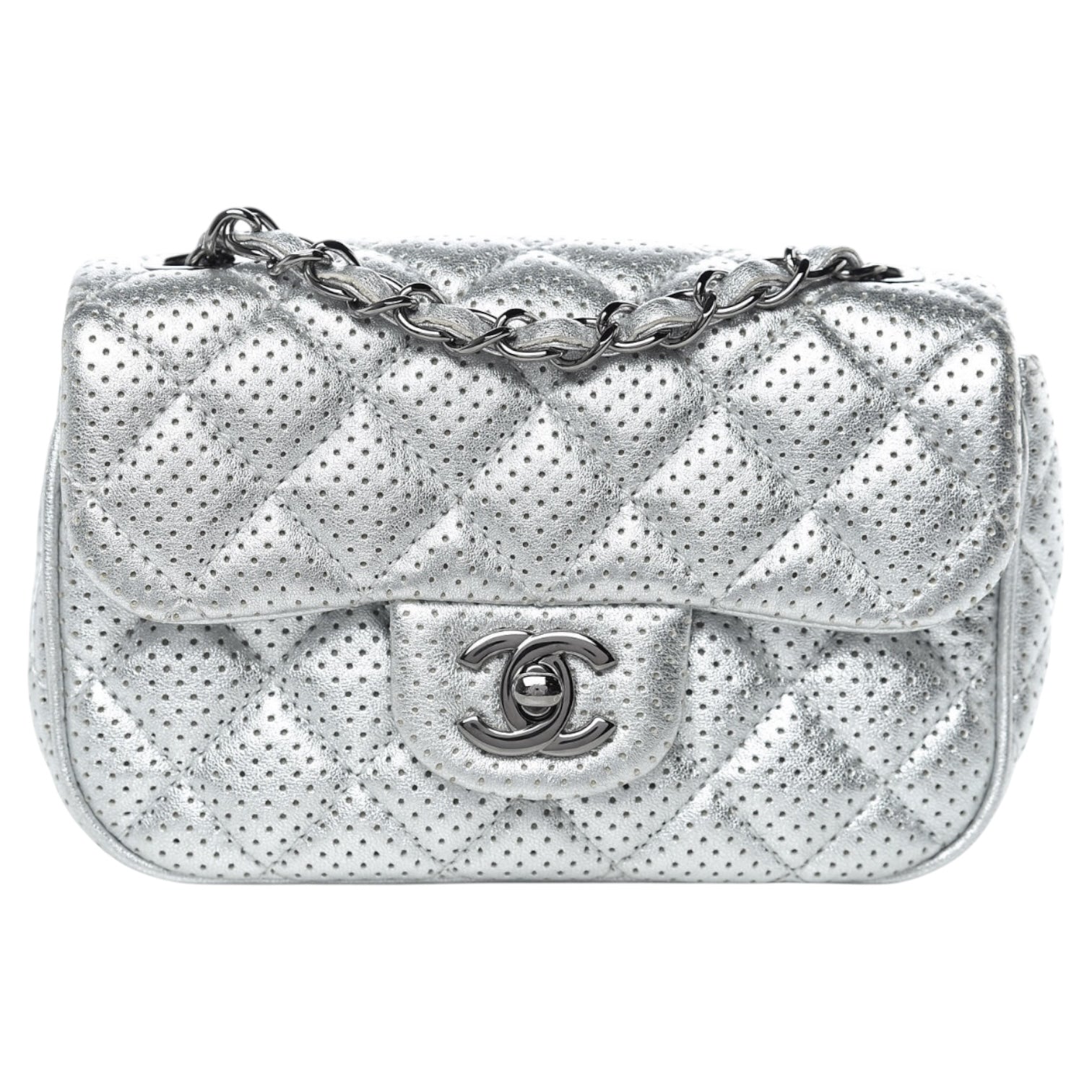 A rare and modern twist on the classic Mini Flap, this Chanel Rectangular bag is crafted from metallic silver lambskin with all-over perforated detailing. The iconic diamond quilting adds dimension, while the signature CC turn-lock closure and silver-tone leather-woven chain strap complete the look. Compact yet statement-making, this bag is perfect for evening outings or as a standout piece in any Chanel collection, blending futuristic shine with timeless elegance.