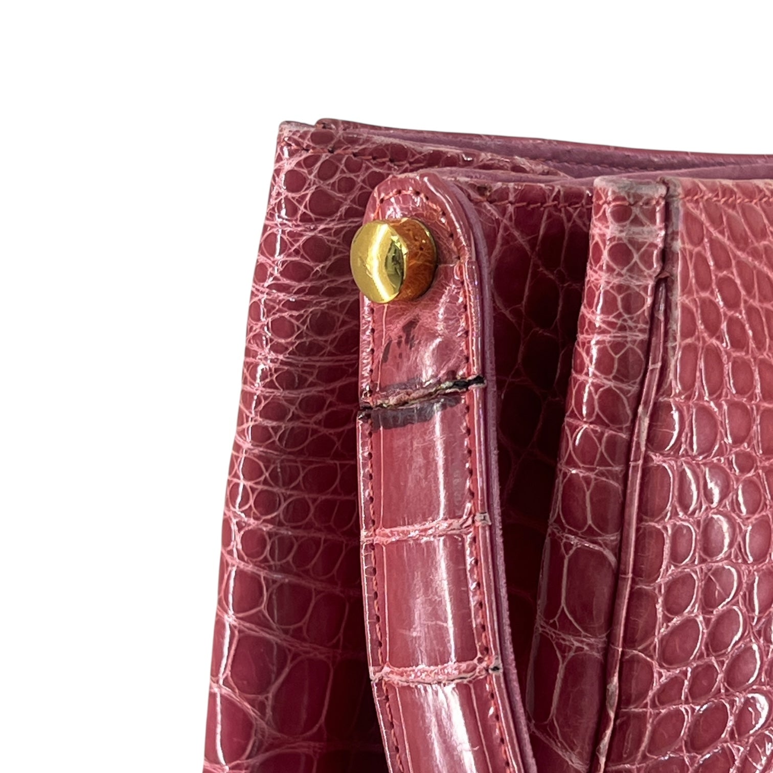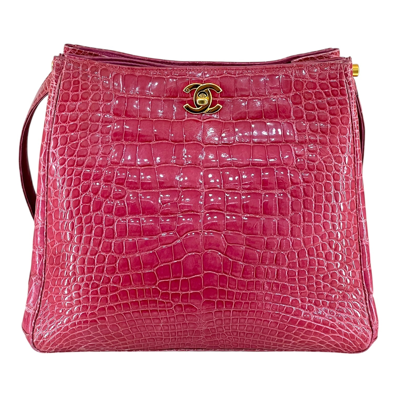 An exquisite collector’s piece, this vintage Chanel Kelly Shoulder Bag is masterfully crafted from glossy pink crocodile leather, showcasing the brand’s rare and luxurious exotic craftsmanship. The structured silhouette features clean lines, a softly curved top handle, and the signature gold-tone CC turn-lock clasp that embodies Chanel’s timeless sophistication.