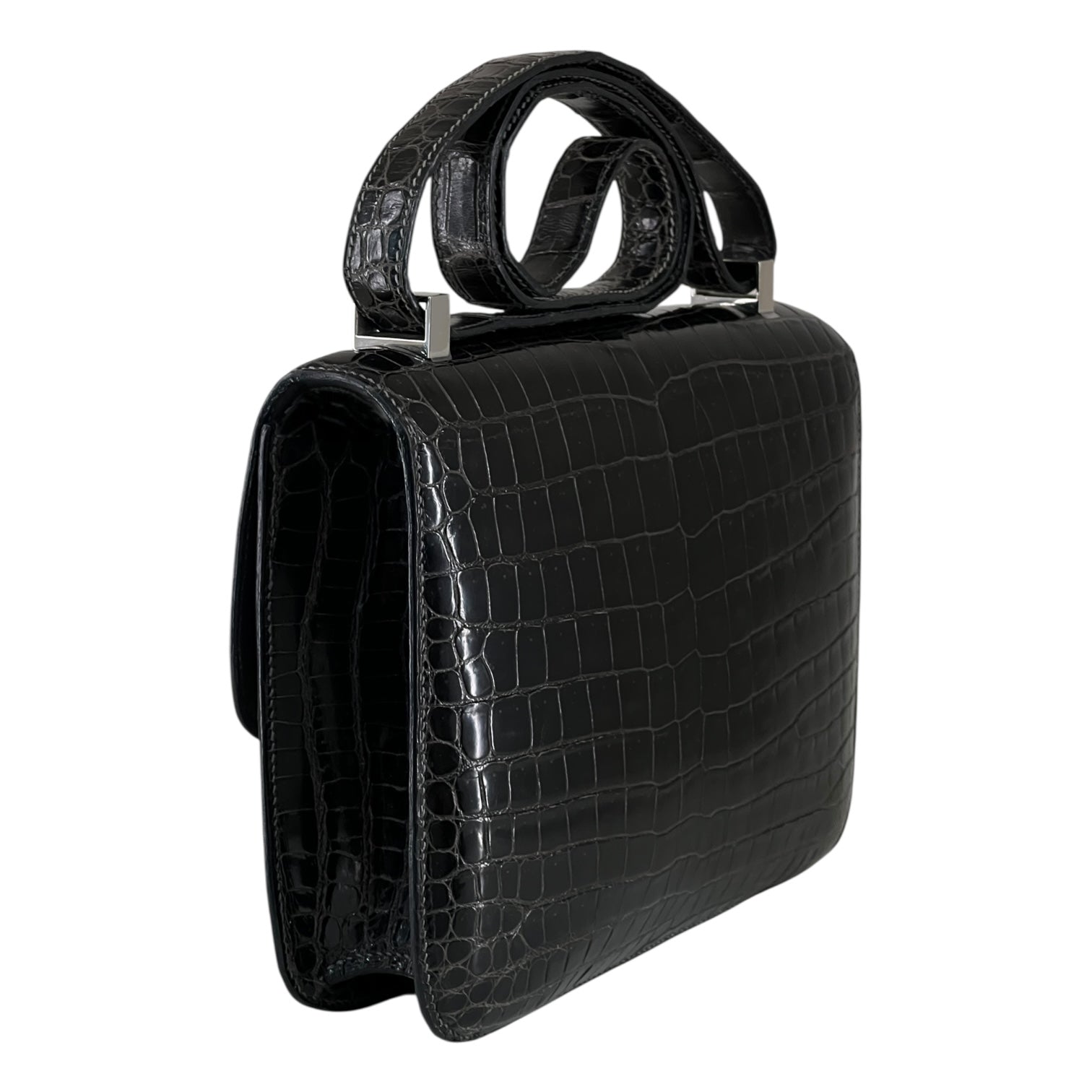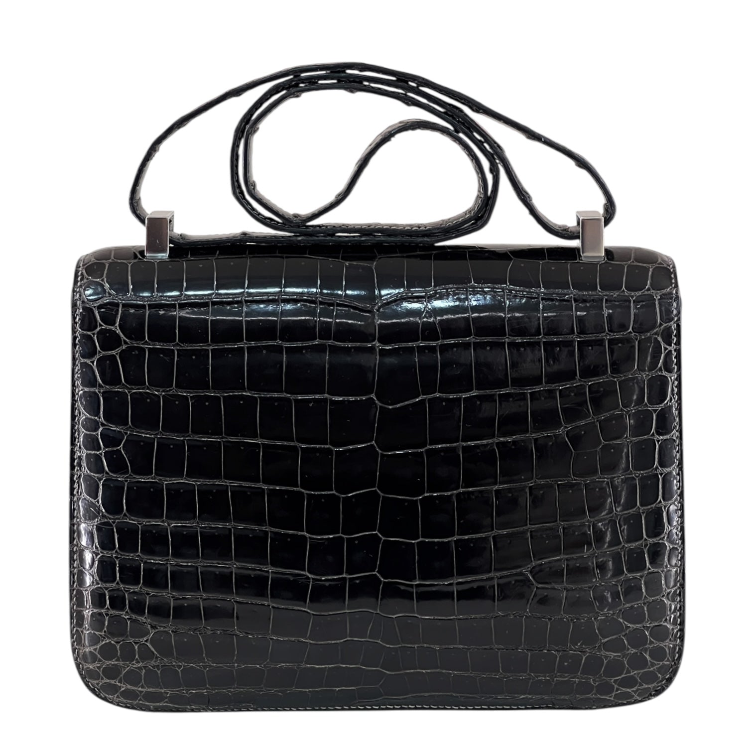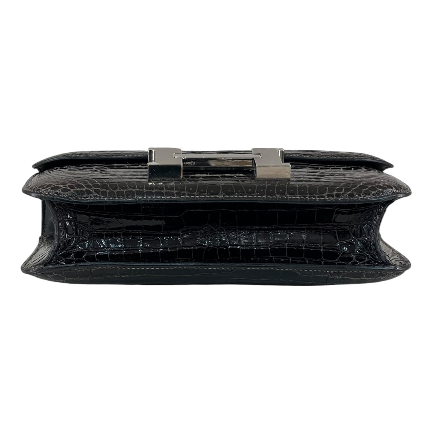 An icon of timeless elegance, this Hermès Constance 24 is rendered in shiny black crocodile leather, showcasing the brand’s mastery of exotic craftsmanship. The sleek silhouette is accentuated by the signature ‘H’ clasp in polished palladium, striking a perfect balance between sophistication and modern minimalism.