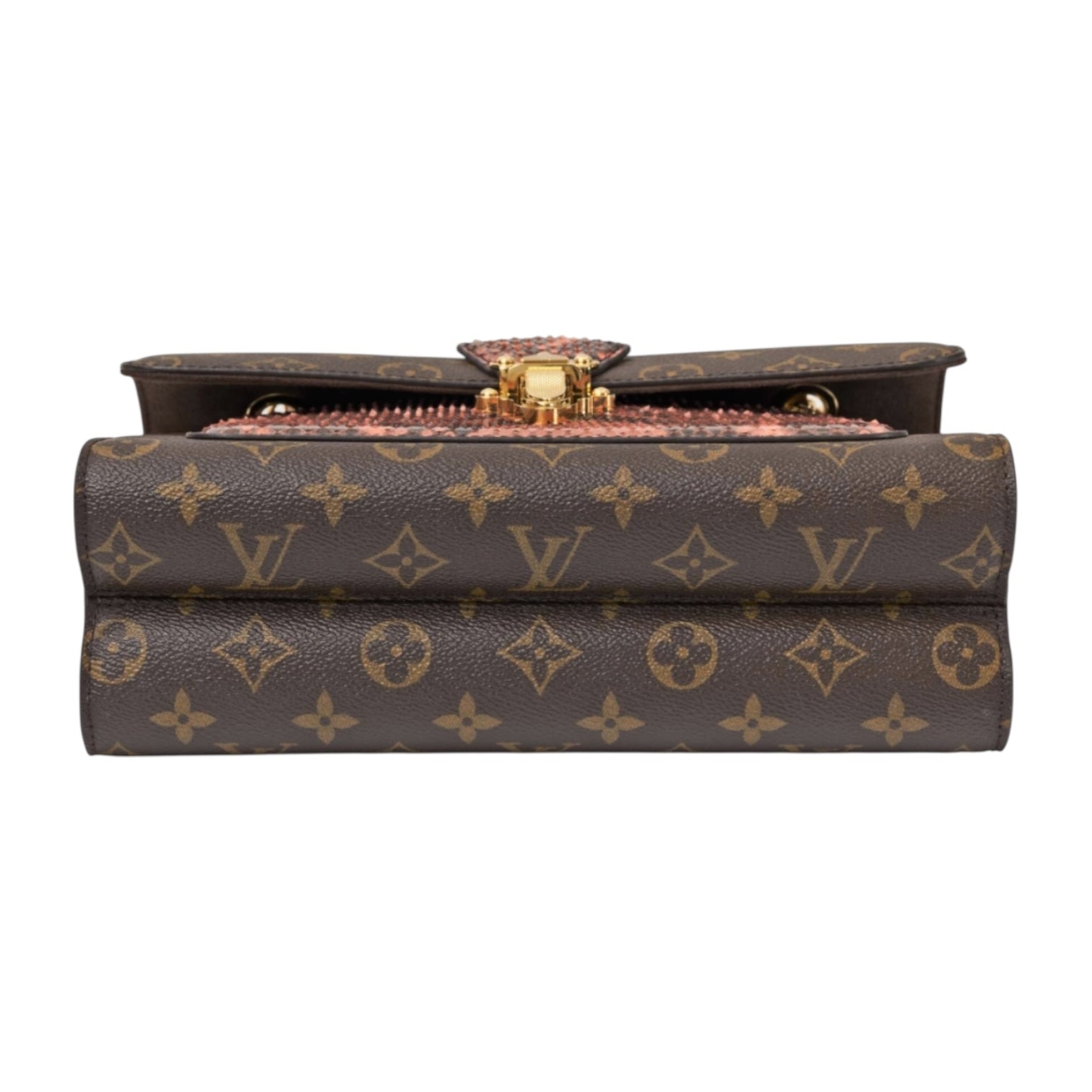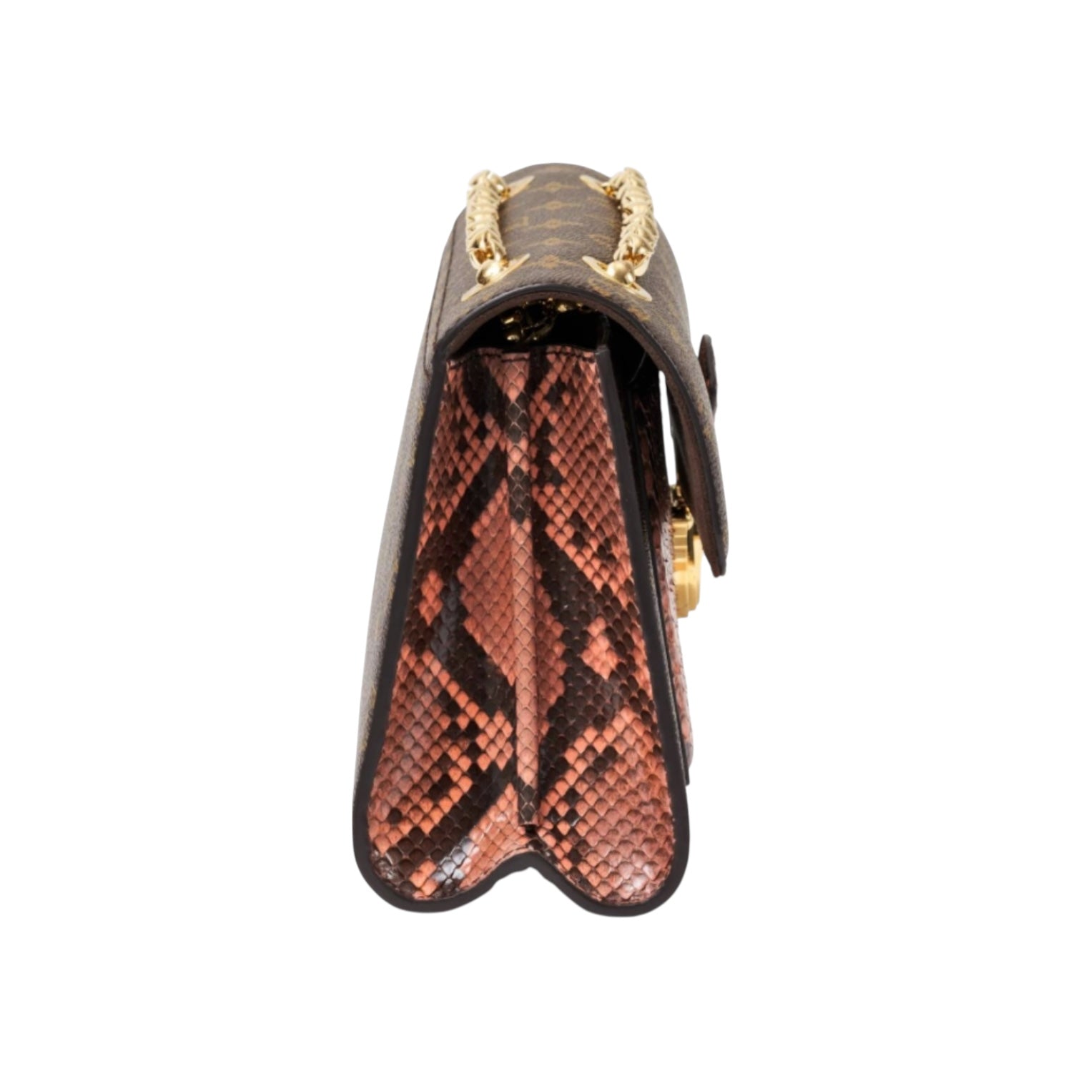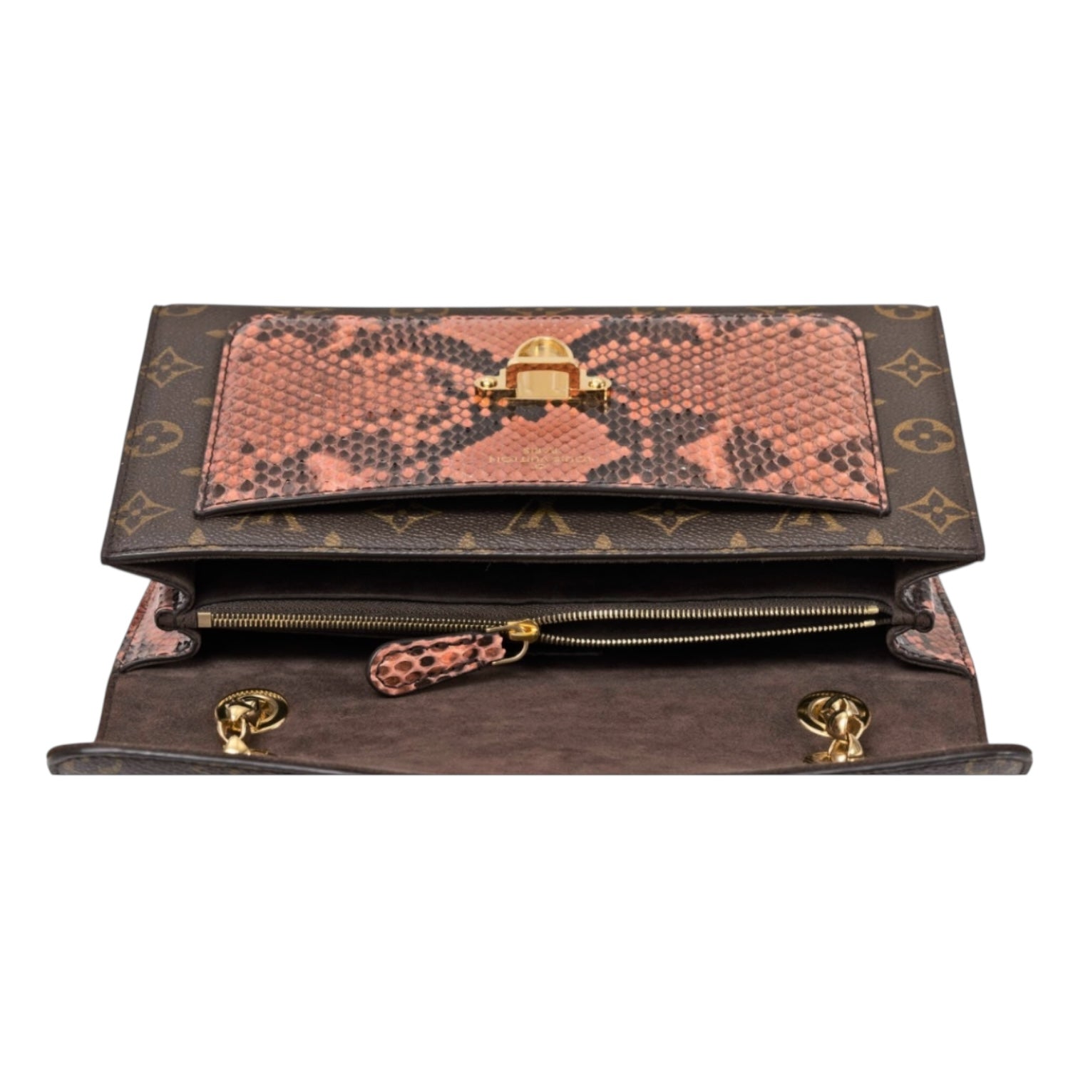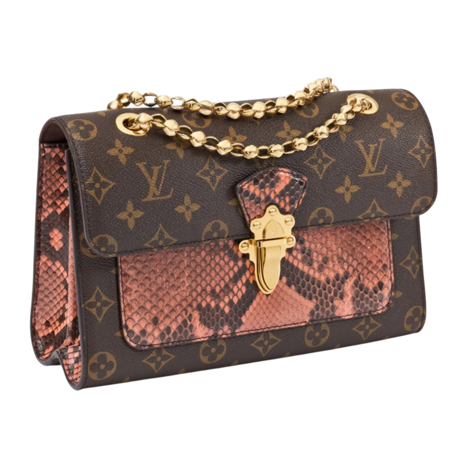 A striking fusion of exotic luxury and classic Louis Vuitton elegance, this Victoire bag features the iconic Monogram coated canvas accented with genuine Rose Bruyère python leather detailing. Finished with gleaming gold-tone hardware, including the signature clasp and chain strap, it exudes sophisticated glamour. The structured silhouette and versatile shoulder or crossbody wear make it a statement piece ideal for both day and evening.
