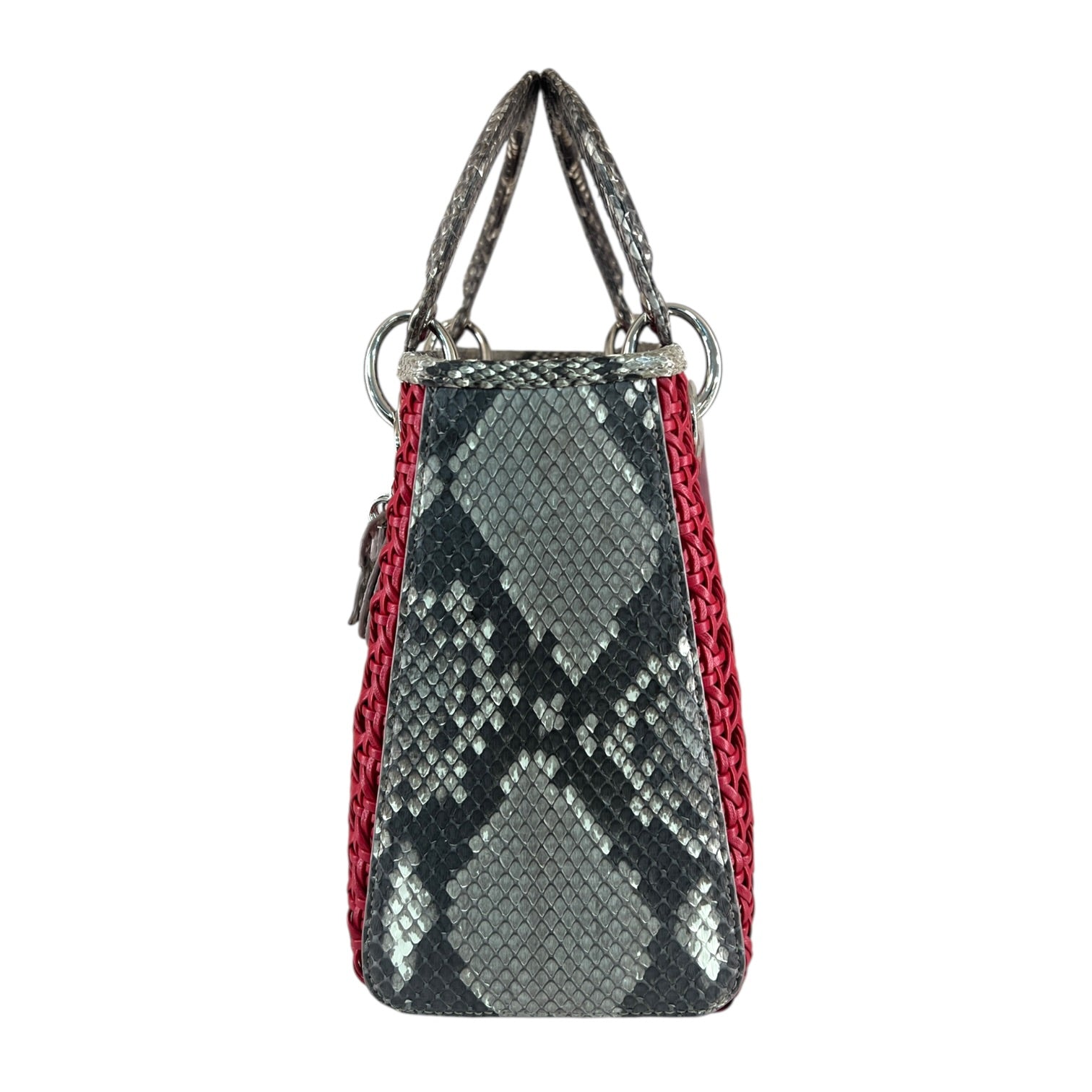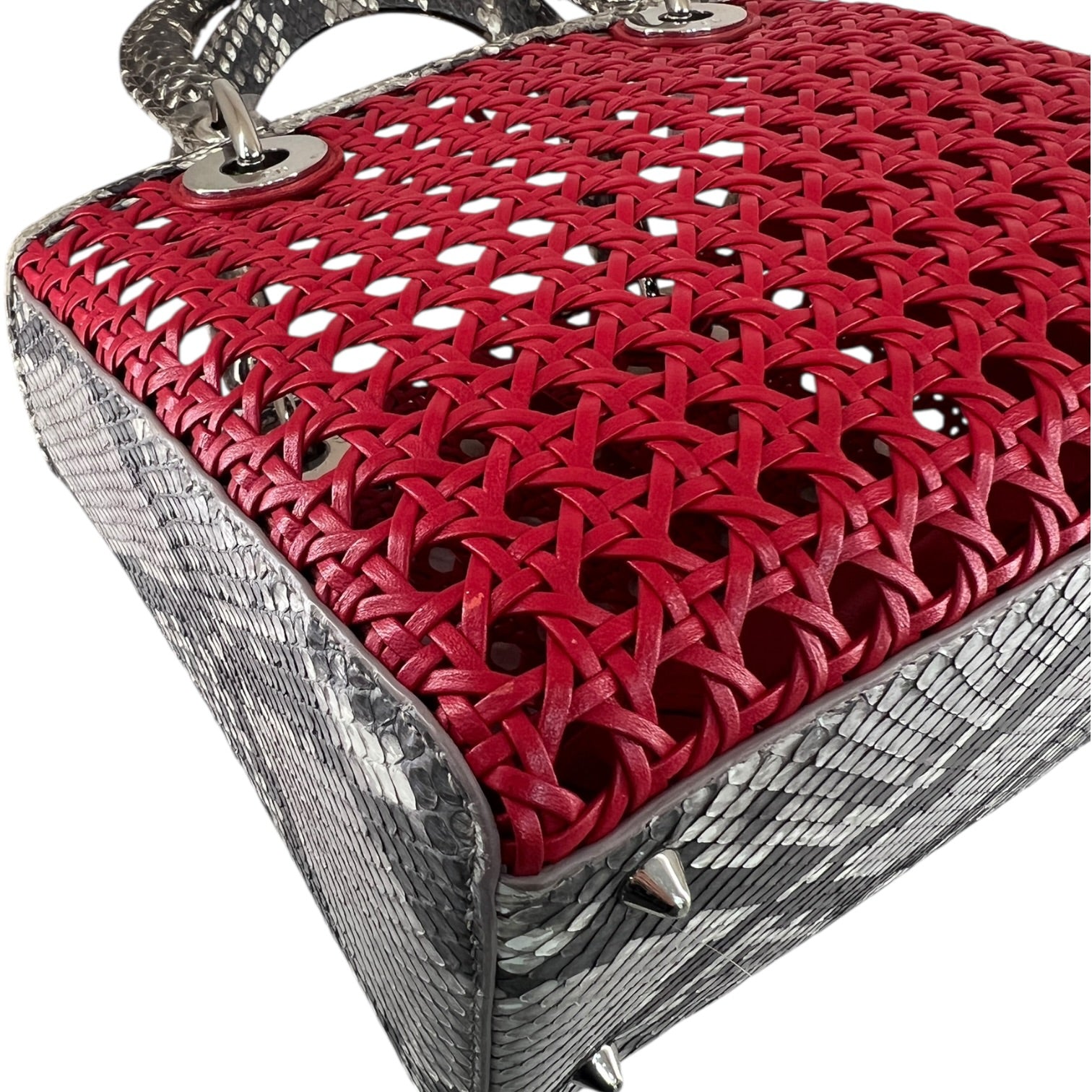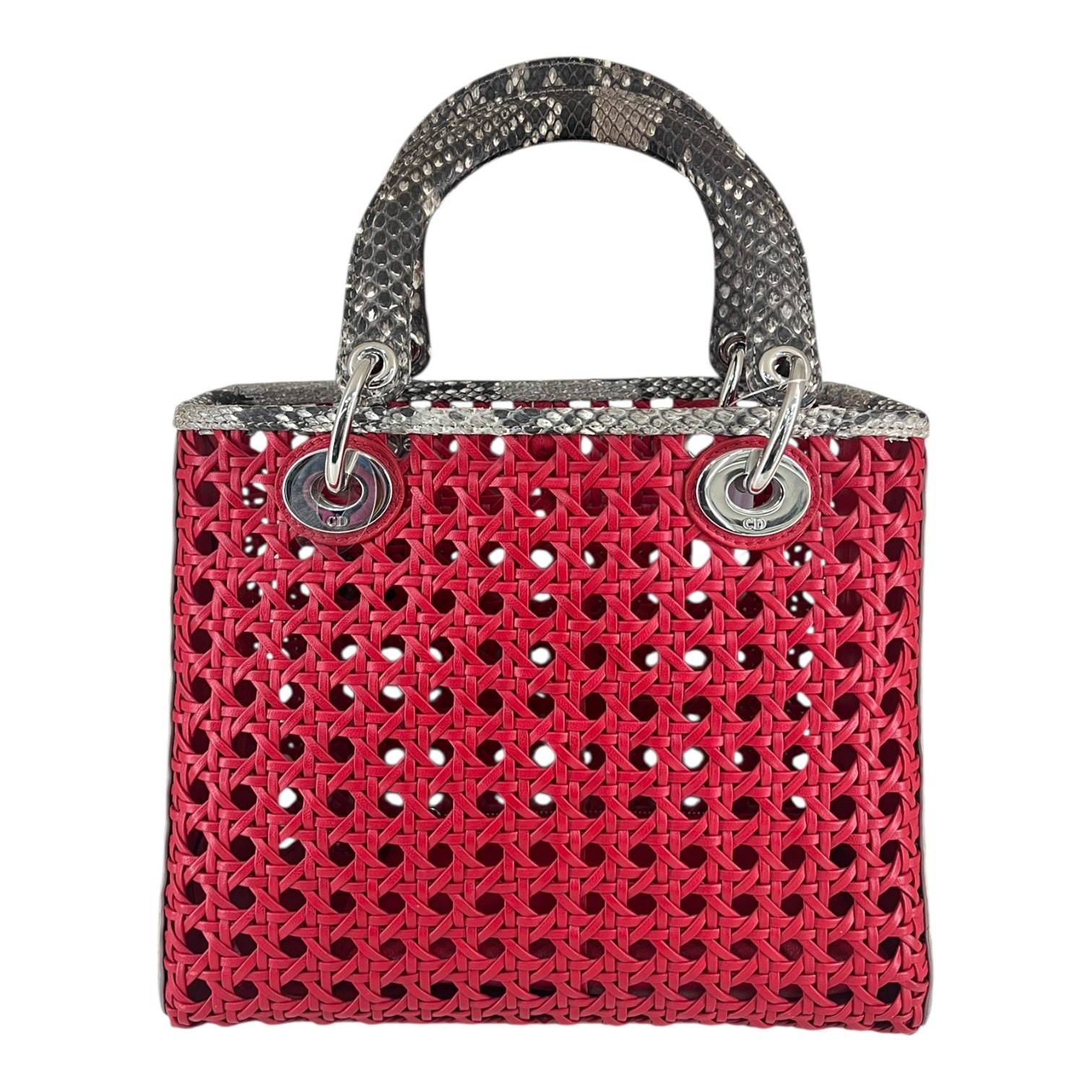A bold interpretation of an iconic silhouette, this Lady Dior tote is crafted in striking red with intricate woven construction, elevated by luxurious python trim. The structured design is accented with signature Dior charm detailing, while the spacious interior offers both elegance and practicality. A standout piece that embodies refined craftsmanship with a modern edge.