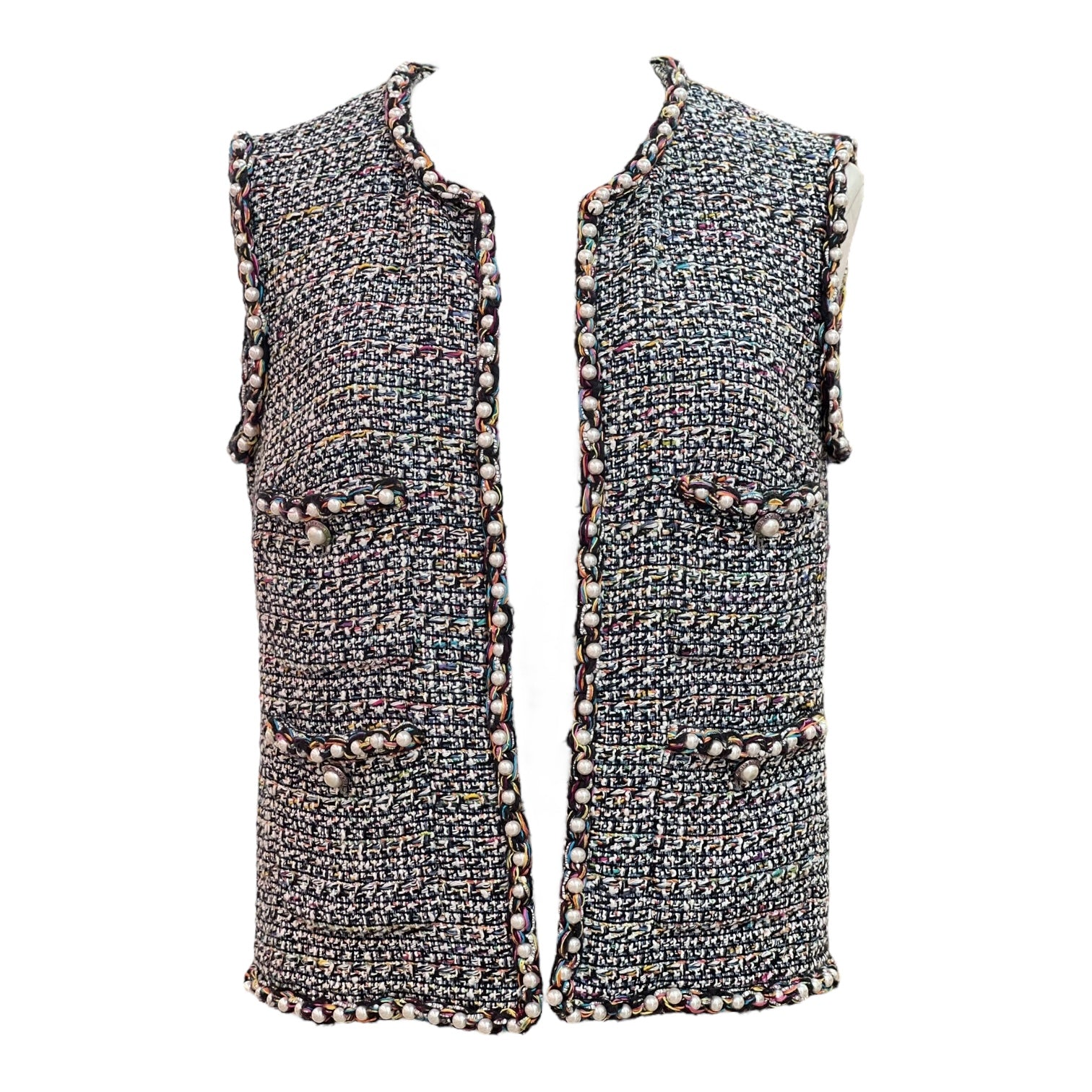 From Chanel’s signature tweed collections, this sleeveless vest jacket is a timeless yet modern layering piece. Crafted in multicolor tweed, it features four front pockets and is beautifully accented with pearl embellishments along the edges and pocket trims. The open-front design makes it versatile for styling, while the intricate detailing showcases Chanel’s impeccable craftsmanship. A refined statement vest perfect for elevating both casual and formal looks.