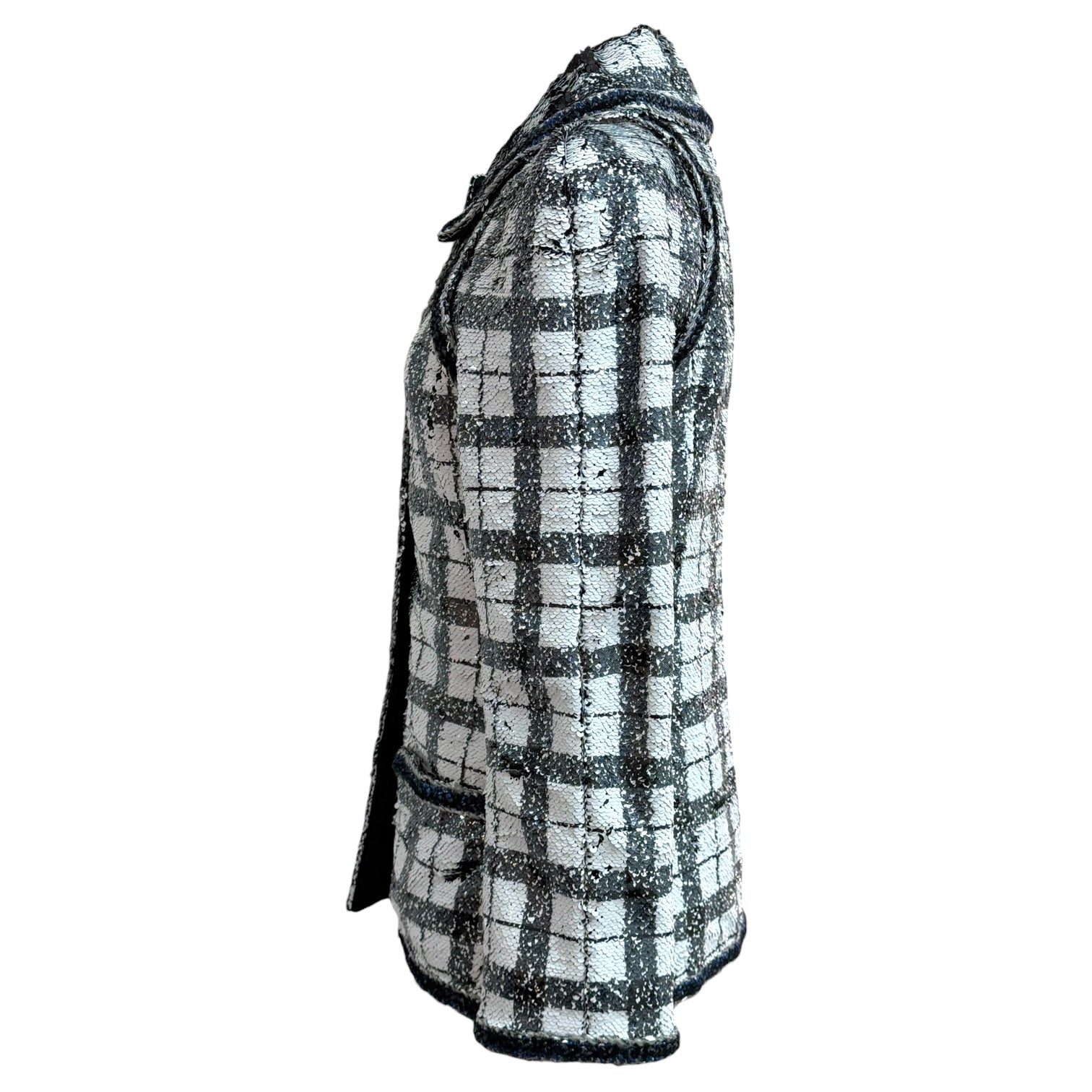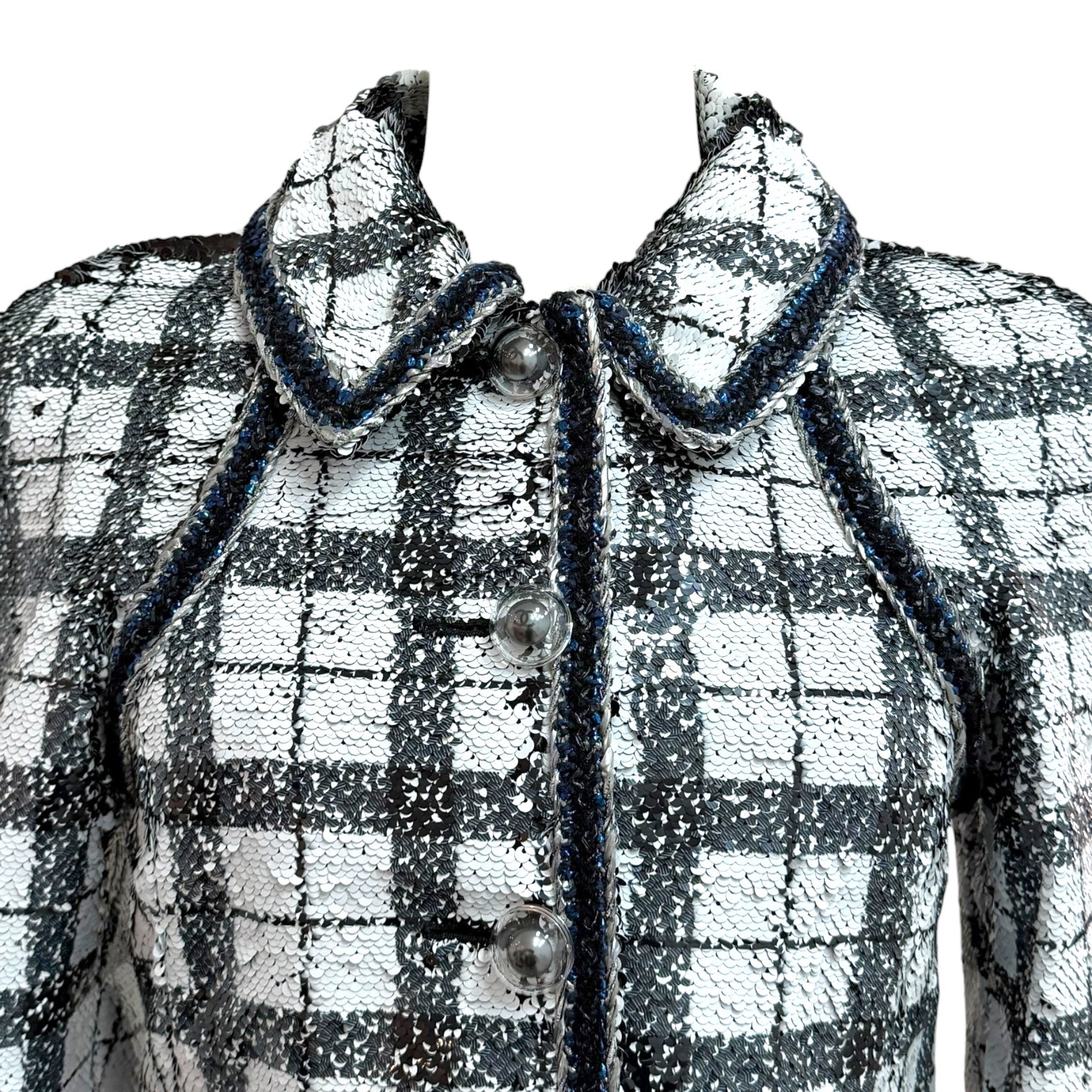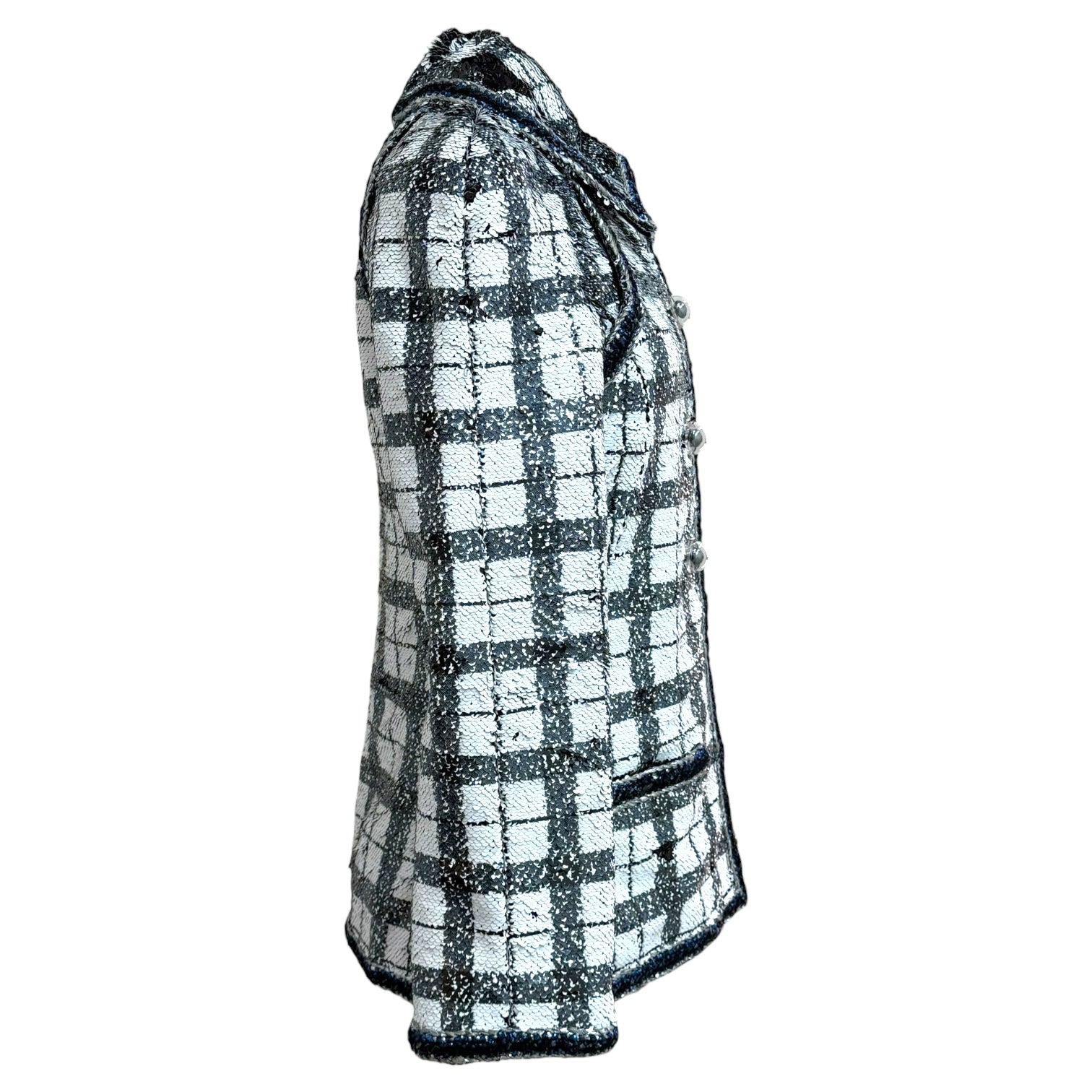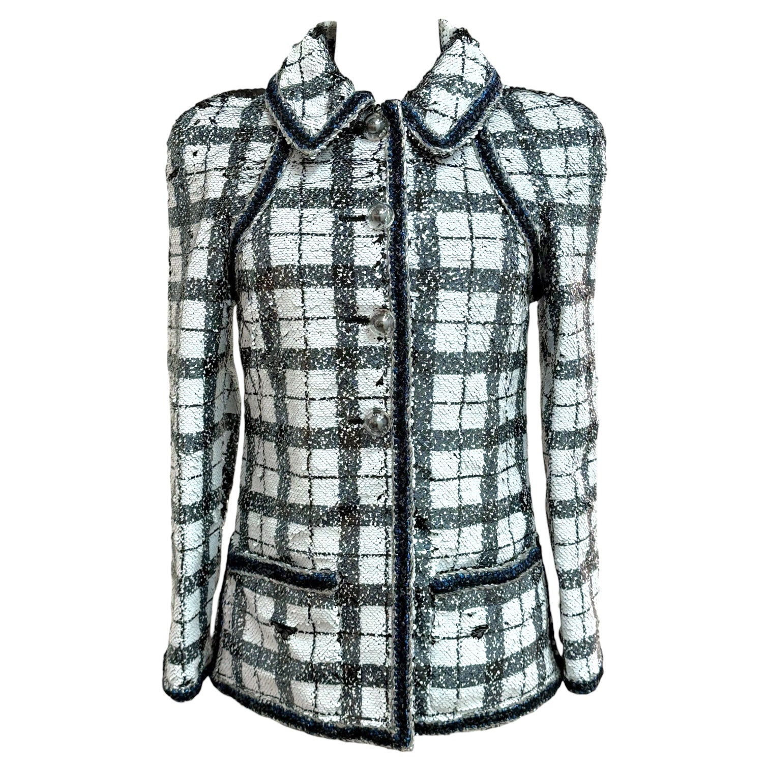 An elegant Chanel jacket crafted in a black and white checked sequin weave, offering a refined interplay of texture and light. Designed with a structured silhouette, this statement piece features a rounded collar with contrast trim, long sleeves, and signature Chanel detailing throughout. The jacket is finished with decorative trim along the front placket, collar, and pockets, creating a polished yet striking look suitable for both day and evening wear.