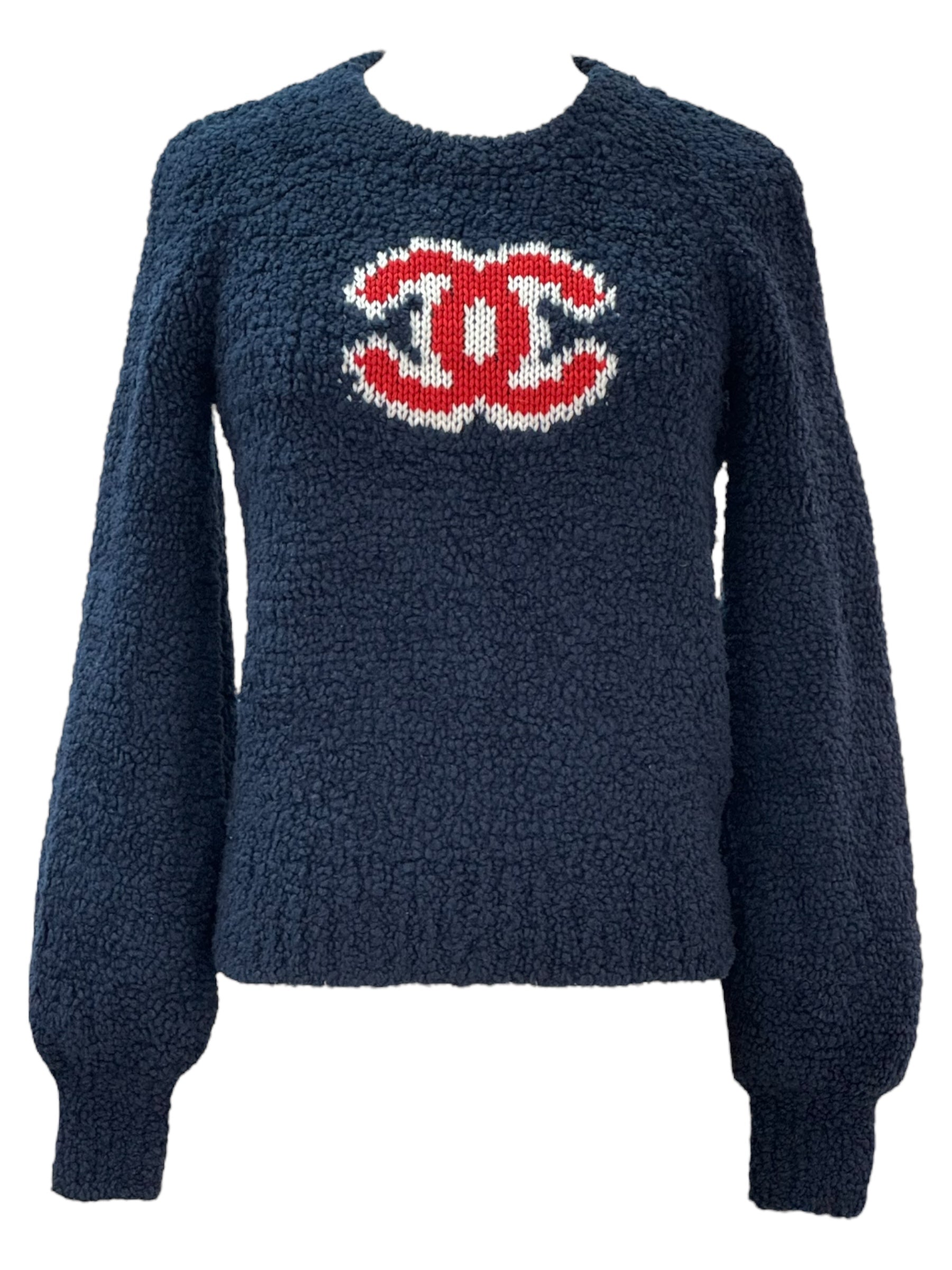 Chanel Navy Bouclé Fleece Knit Pullover with Red Intarsia CC Logo
