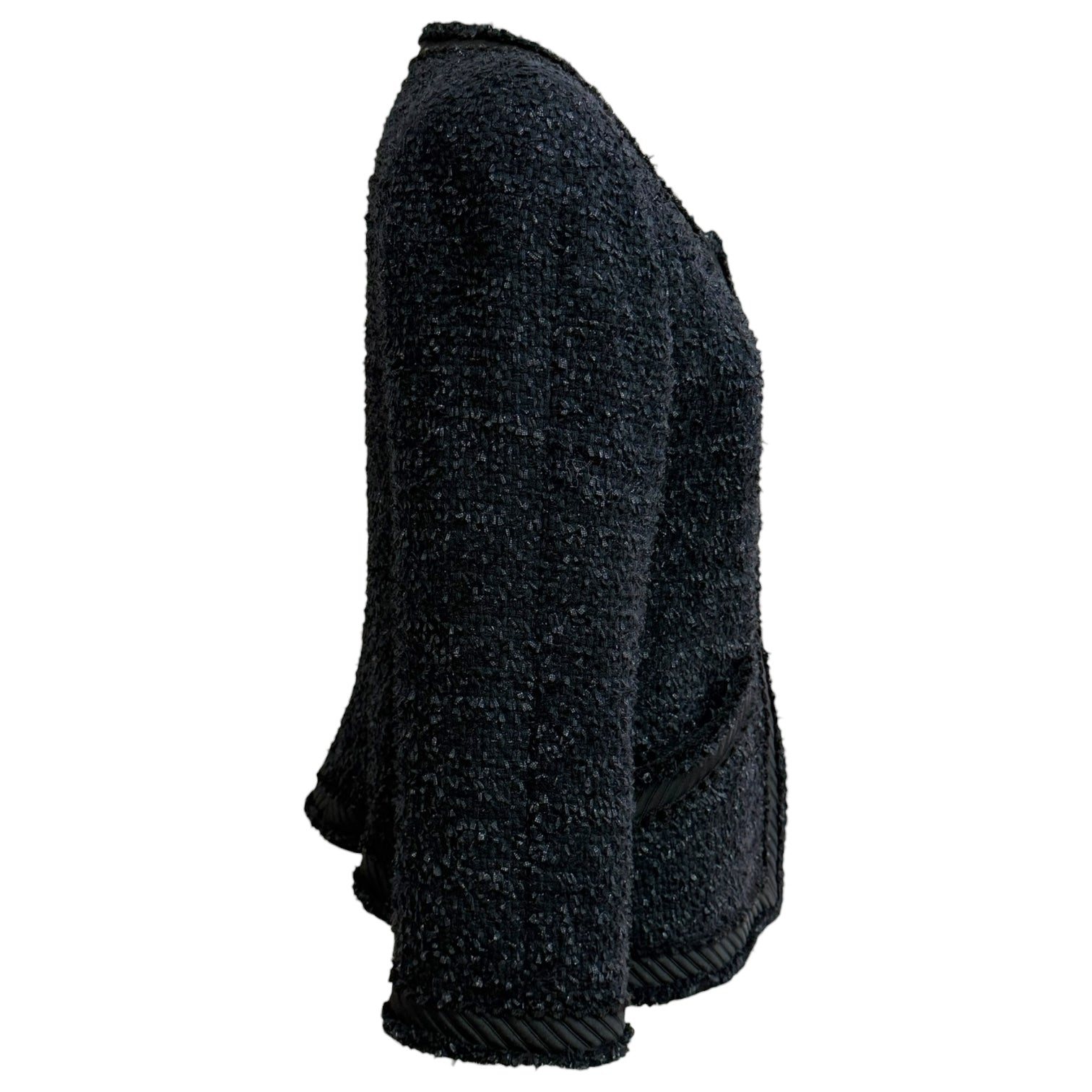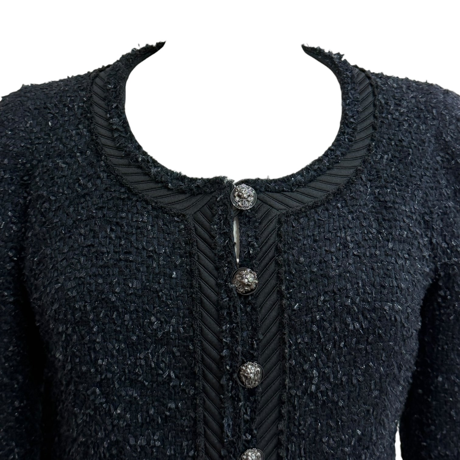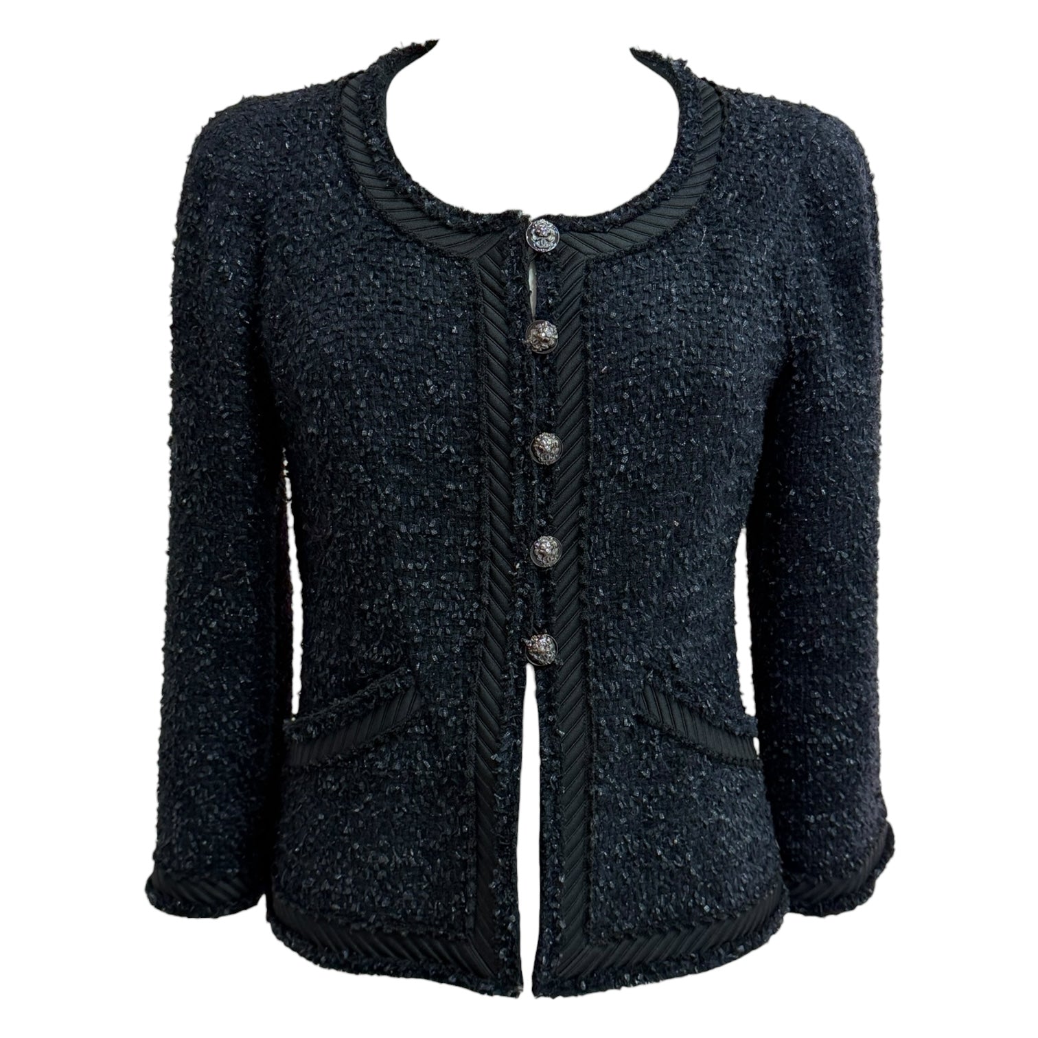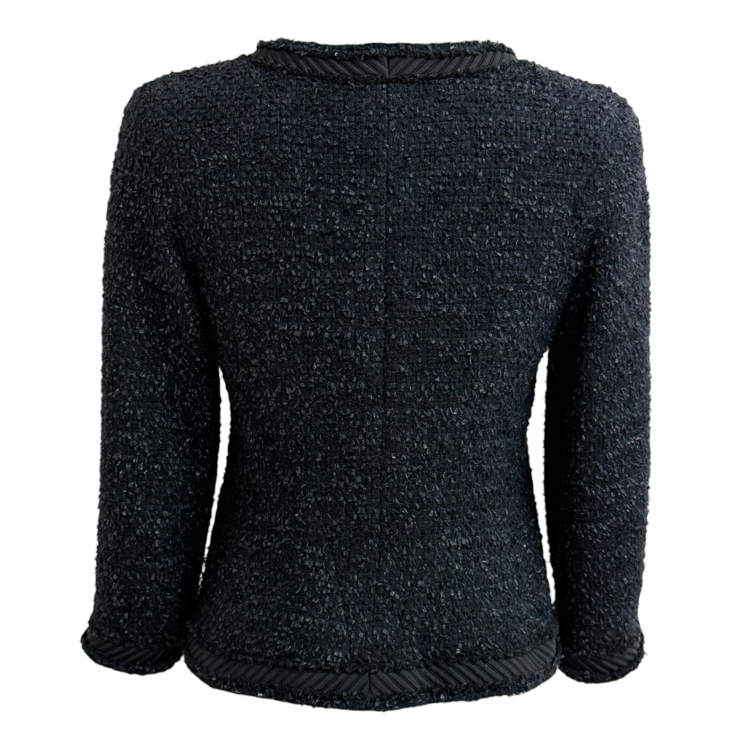 An elegant Chanel knit jacket crafted in a deep navy textured knit, contrasted with signature black braided trim throughout. Designed with a classic round neckline, long sleeves, and a flattering fitted silhouette, this piece features decorative button fastening and front patch pockets. A timeless and versatile Chanel staple, ideal for polished daytime wear or refined evening styling.