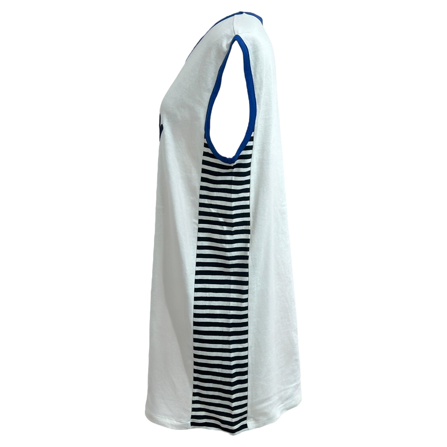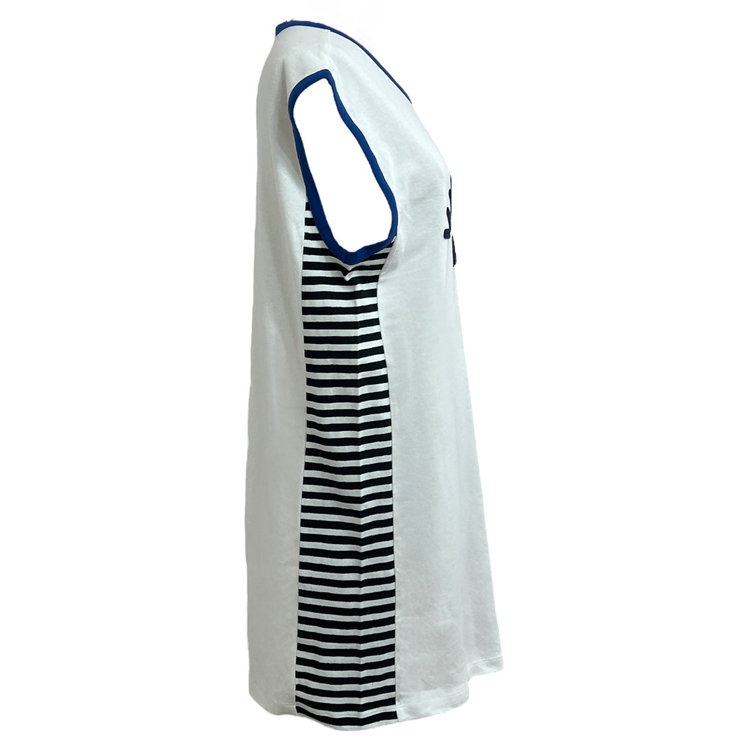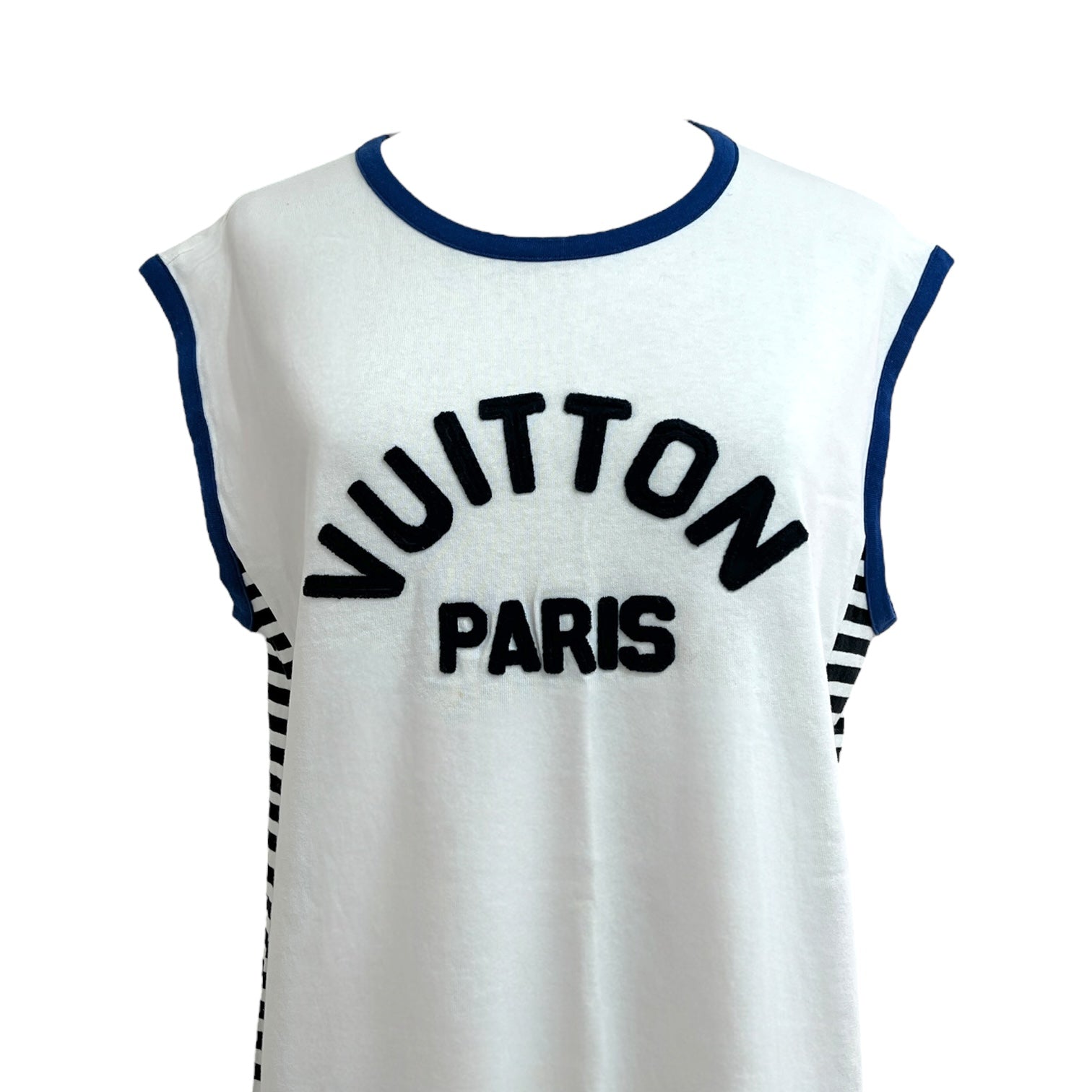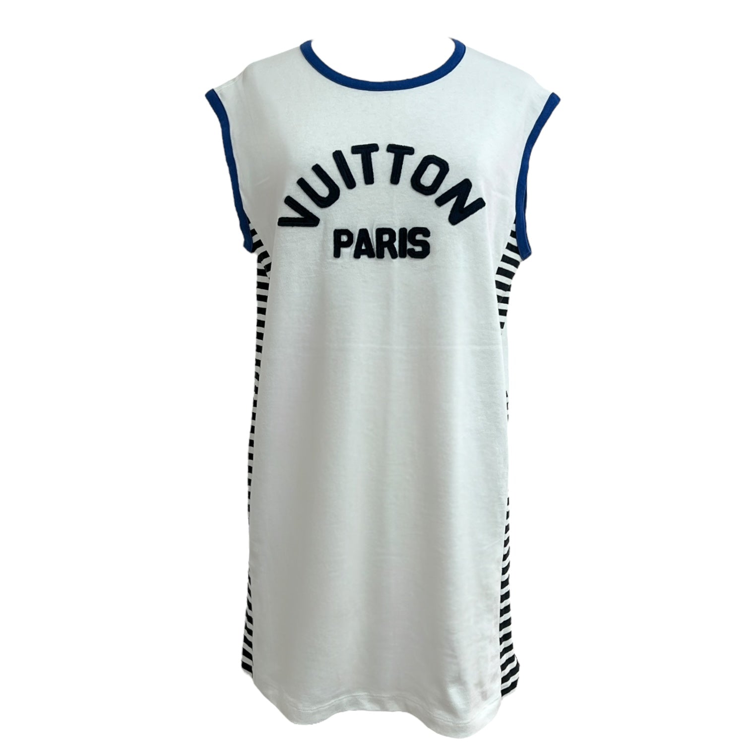 Crafted from soft, breathable cotton, this Louis Vuitton dress combines sporty appeal with Parisian sophistication. The clean white base is accented by bold Vuitton Paris lettering across the chest, with contrast navy trims at the neckline and armholes for a striking finish. Black-and-white striped panels along the sides lend a modern, athletic touch to the relaxed silhouette. A versatile piece, this sleeveless dress can be styled casually with sneakers or elevated with sandals and statement accessories for a polished summer look.