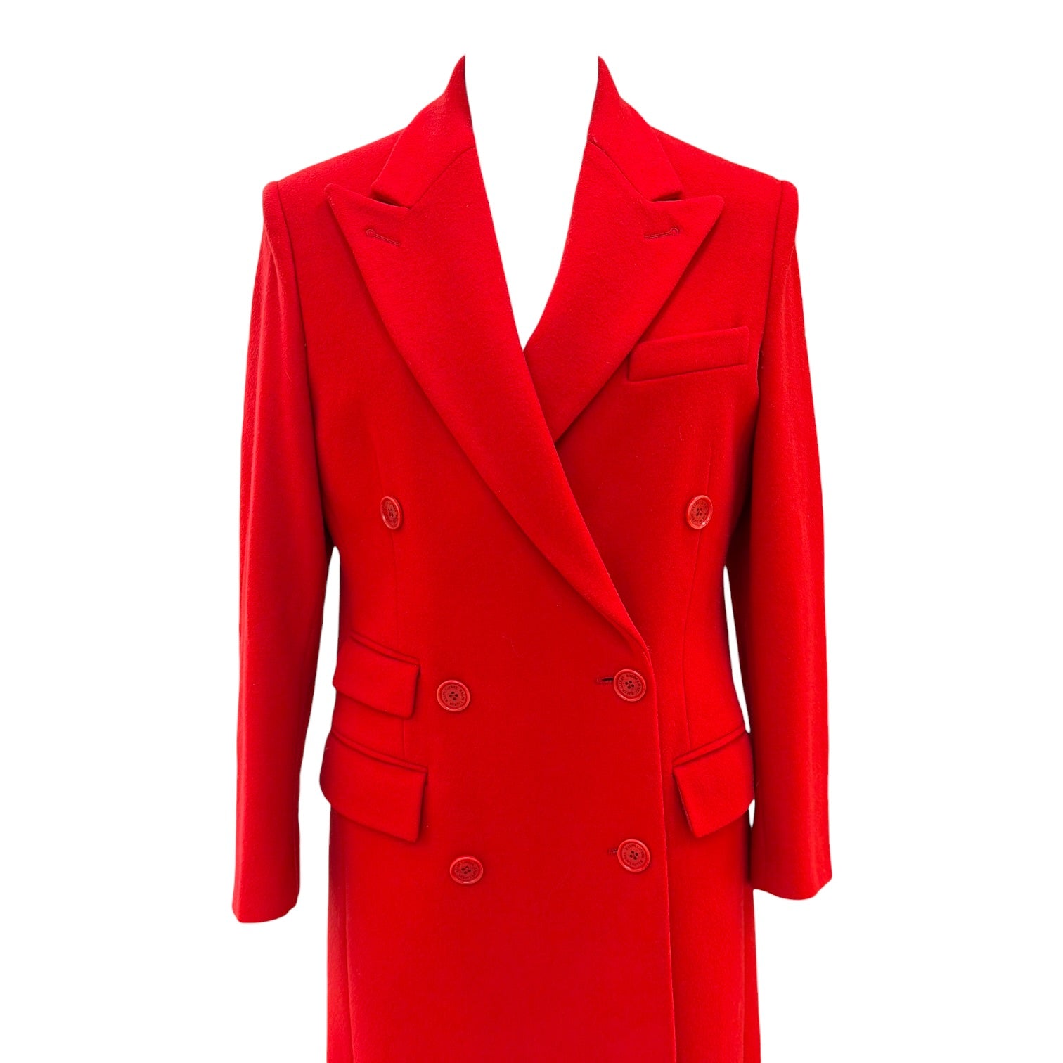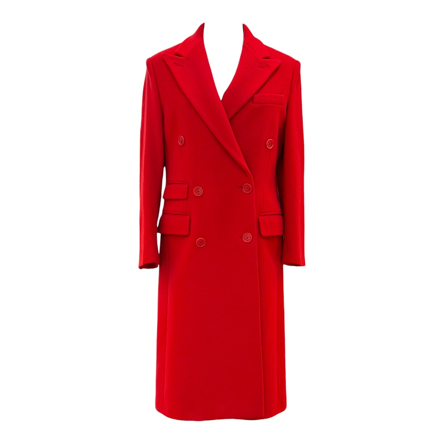 Striking Ralph Lauren coat crafted in a rich red wool, designed in a timeless double-breasted silhouette. Featuring sharp peak lapels and structured tailoring, this piece is elevated with tonal buttons and flap pockets that enhance its refined, polished aesthetic. The clean lines and elongated cut create a powerful yet elegant profile, making it a standout outerwear piece for both day and evening styling.