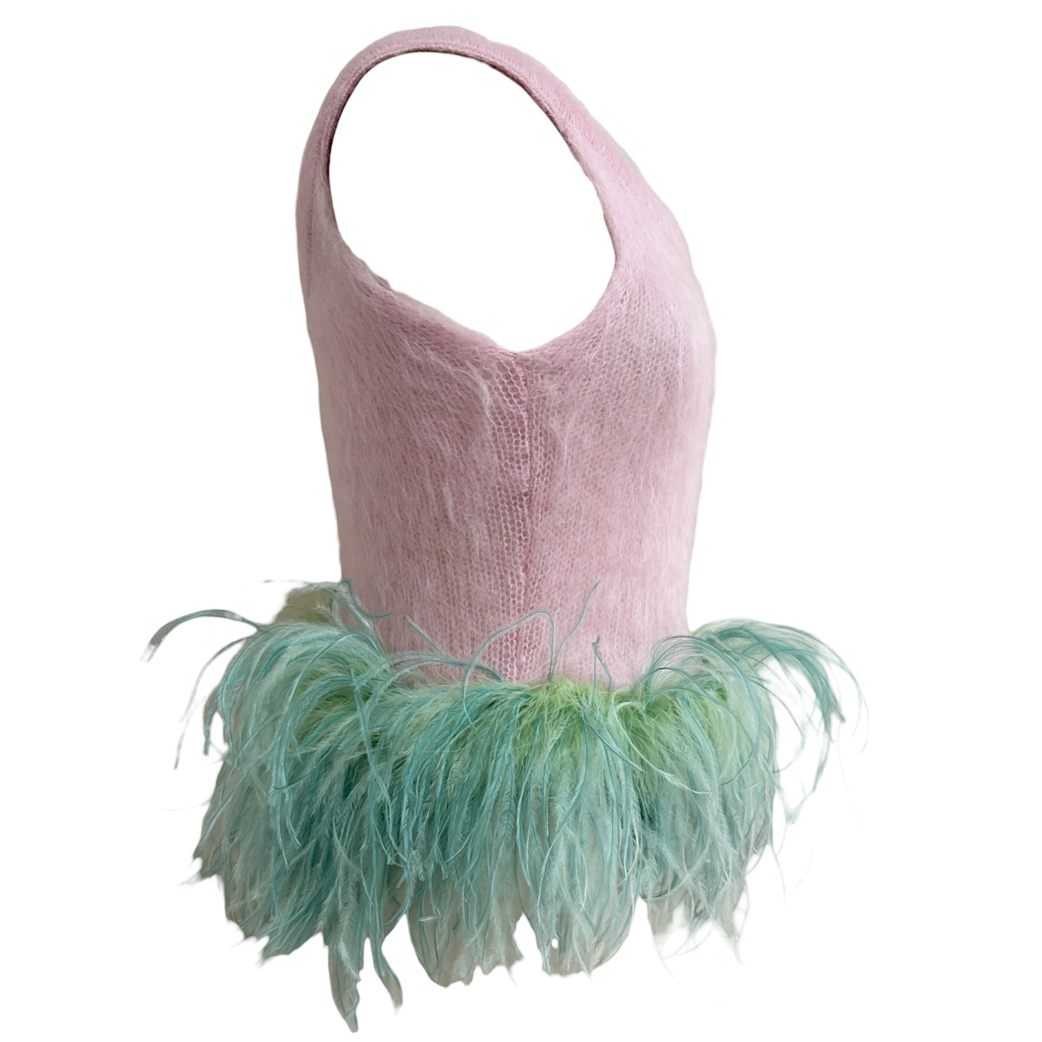 A statement Saint Laurent knit top blending soft femininity with high-fashion allure. Crafted from delicate pink mohair, this sleeveless design features a plush, fuzzy texture and a fitted silhouette. The hem is luxuriously trimmed with ombré green and turquoise feathers, adding a dramatic, couture-inspired finish. Perfect for styling with tailored trousers or a sleek leather skirt for an elevated evening look.