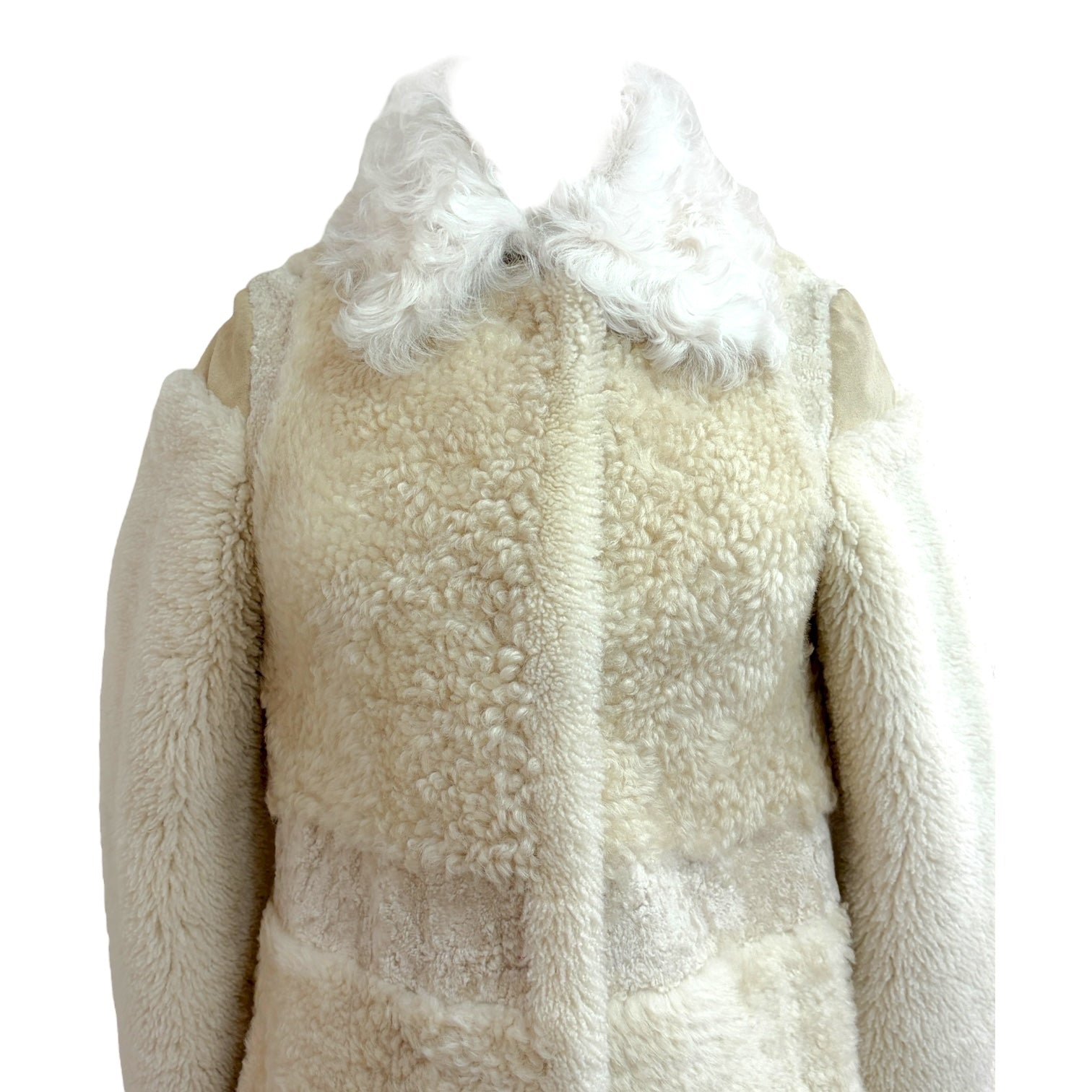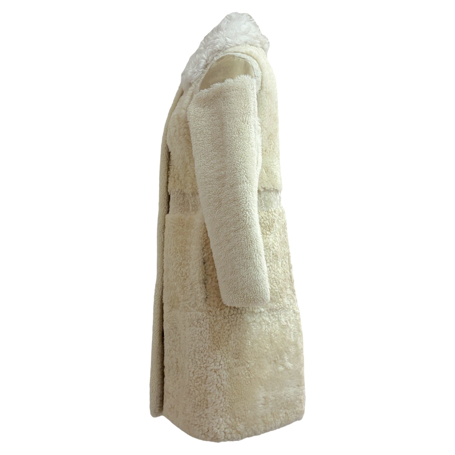 A luxurious winter statement from Burberry, this ivory coat is crafted from plush shearling with a sumptuously soft texture. The design features a structured silhouette enhanced by dropped shoulders and a voluminous curly lamb fur collar, exuding refined British elegance. Fully lined for warmth and comfort, it combines timeless craftsmanship with contemporary edge — an iconic outerwear piece for the modern wardrobe.