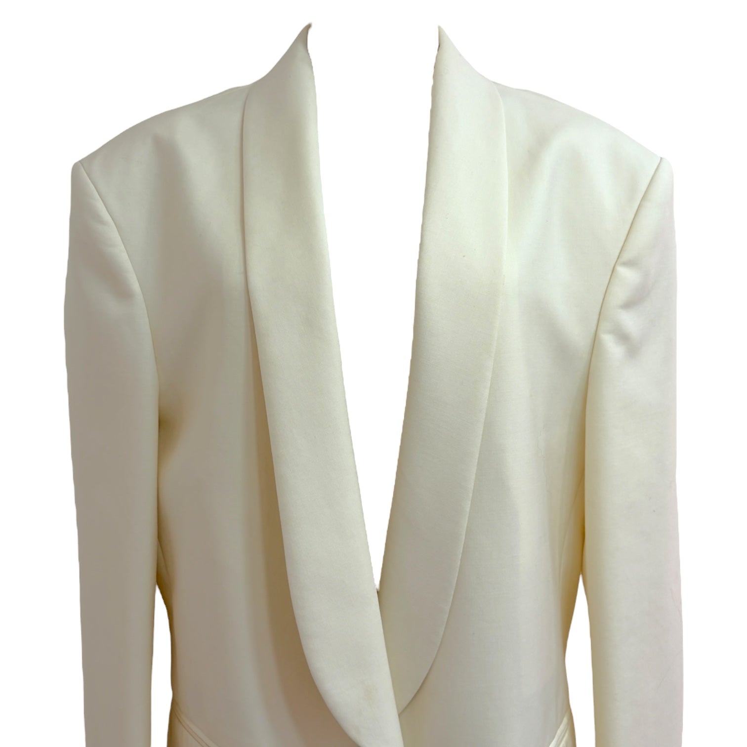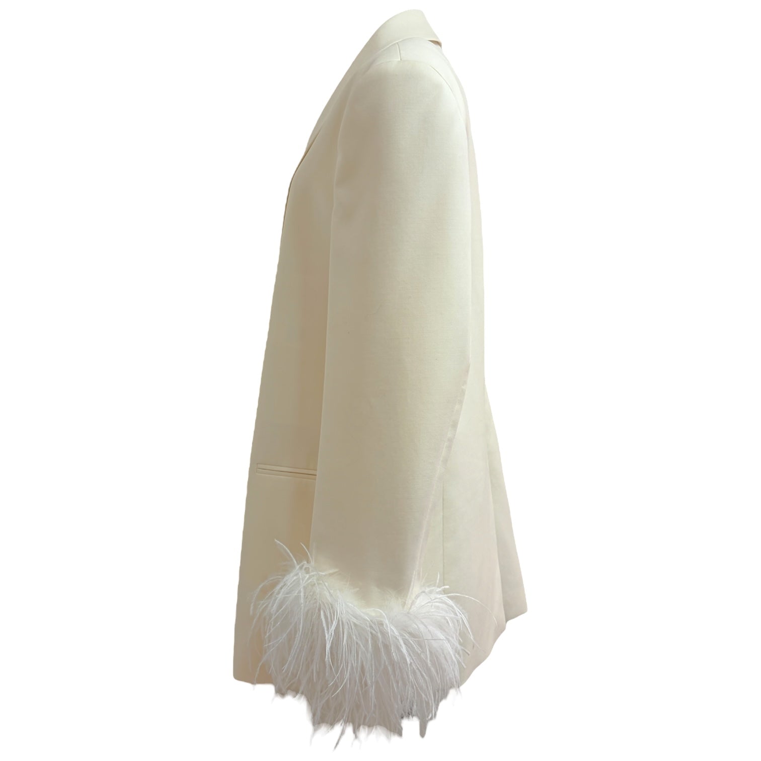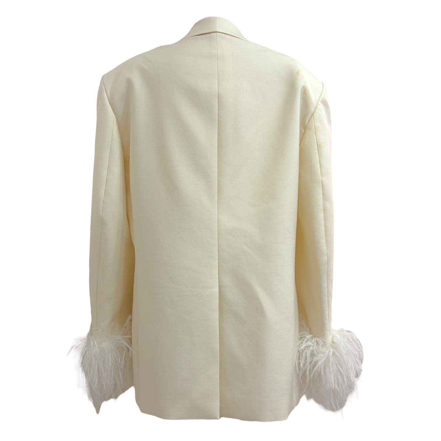 This striking Magda Butrym ivory tuxedo blazer redefines modern femininity with a touch of vintage glamour. Expertly tailored with strong shoulders and a sculpted silhouette, it features satin shawl lapels and luxurious detachable feather-trimmed cuffs for added drama. The smooth, structured fabric creates a refined yet playful contrast against the voluminous feather detailing — a signature of the brand’s bold sophistication.