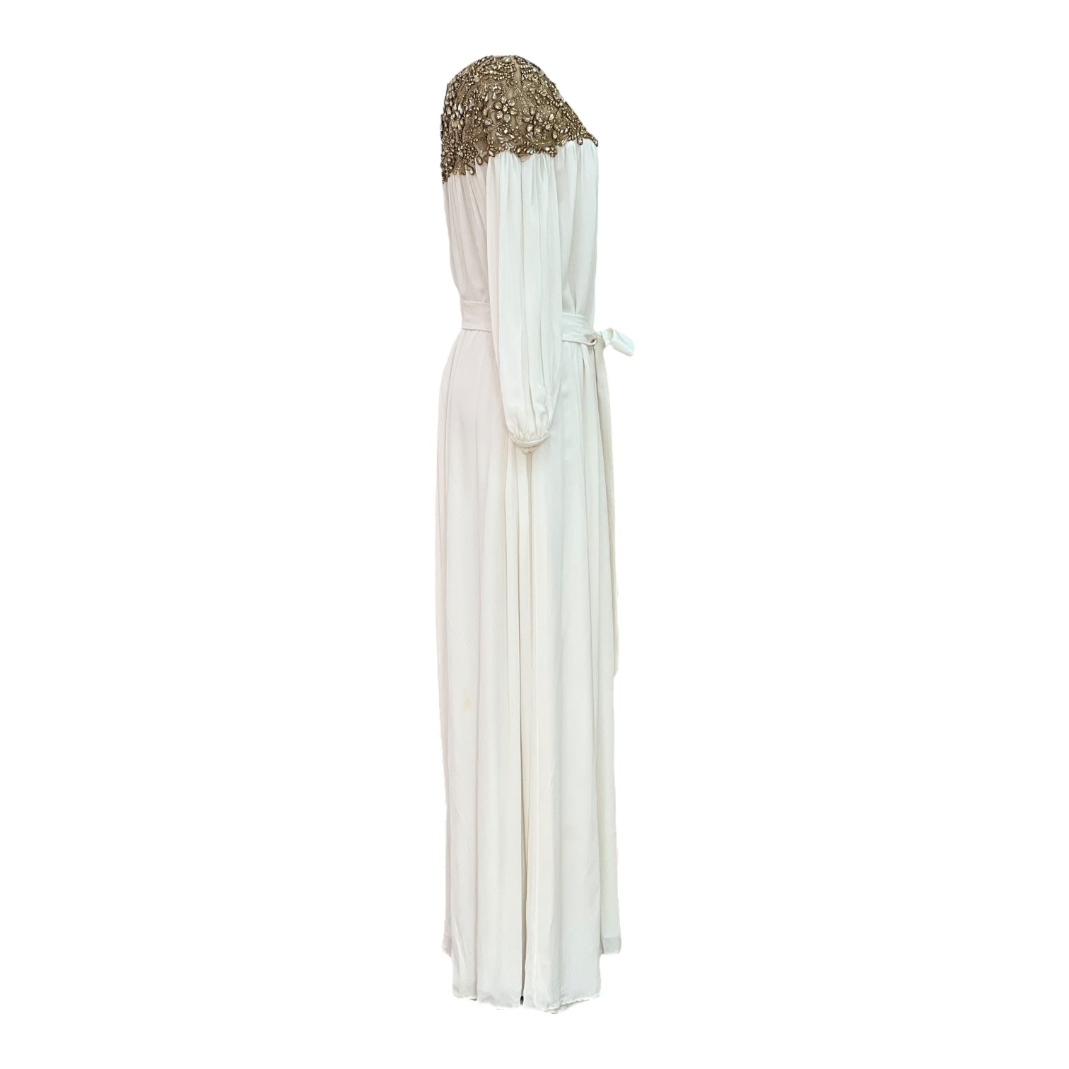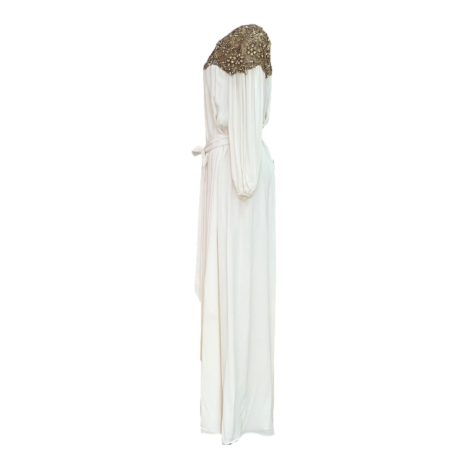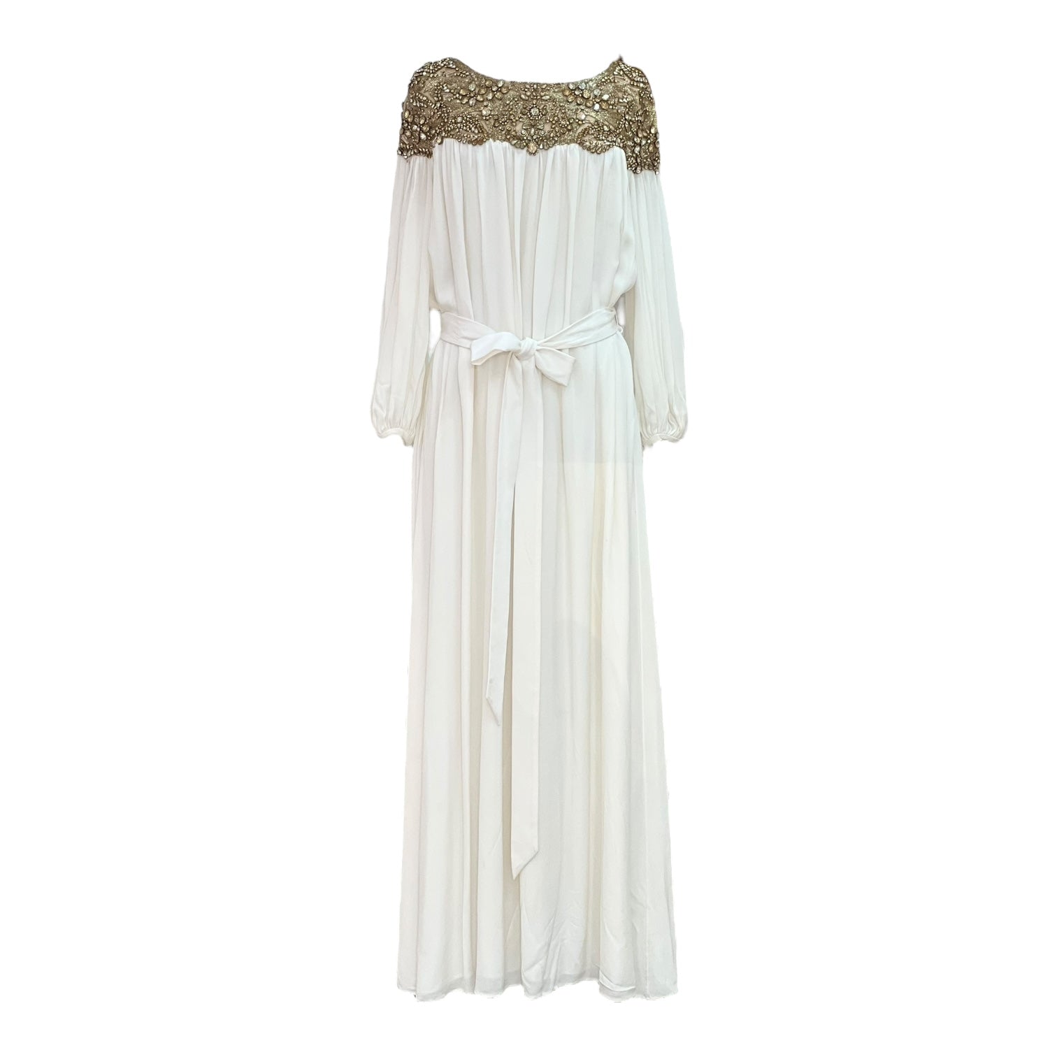 This Marchesa White Embellished Long Sleeve Belted Gown is a breathtaking statement piece that radiates elegance. Crafted from lightweight flowing fabric, it features a relaxed silhouette cinched at the waist with a self-tie belt for graceful definition. The gown is adorned with intricate gold embellishments across the neckline and shoulders, adding a touch of opulence to the ethereal design. Finished with billowed long sleeves and a floor-sweeping hem, it perfectly balances sophistication and glamour—ideal for evening galas, red carpet moments, or formal occasions.