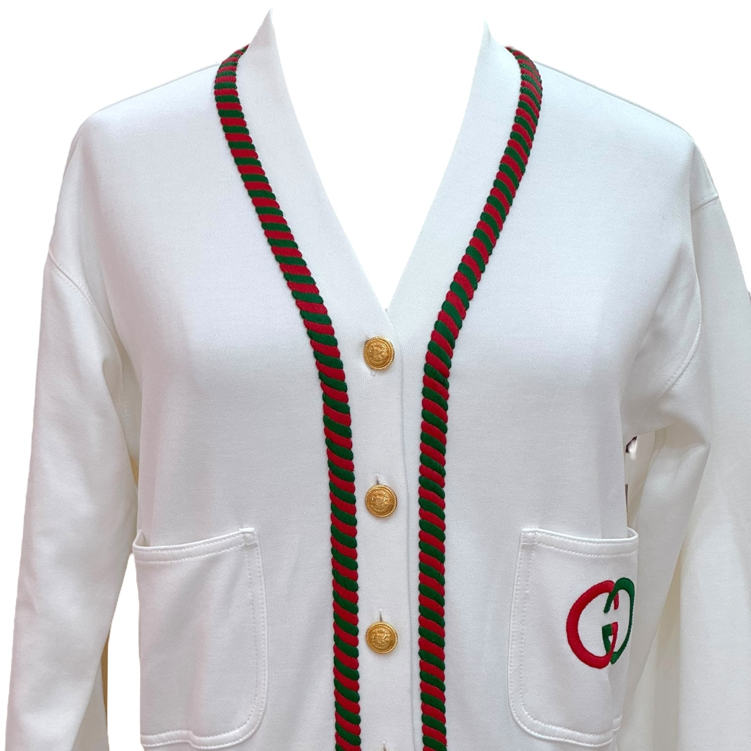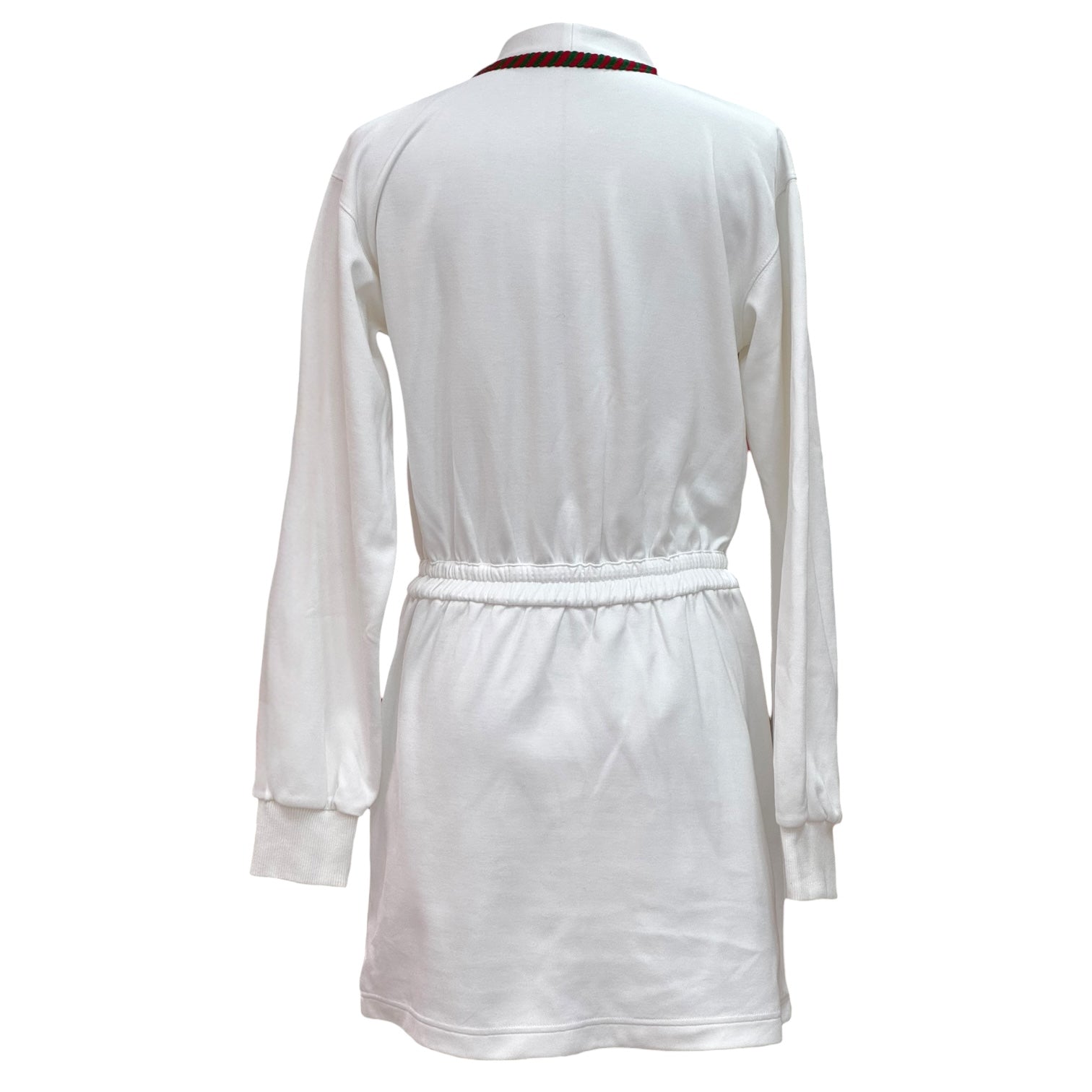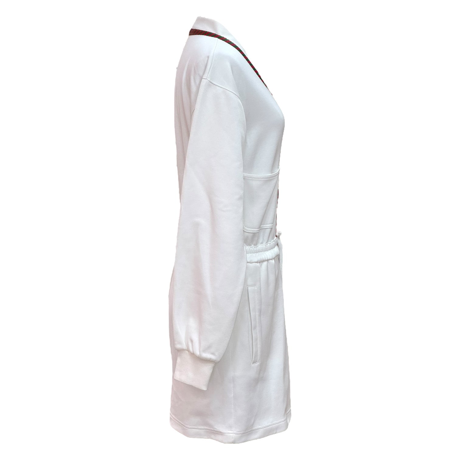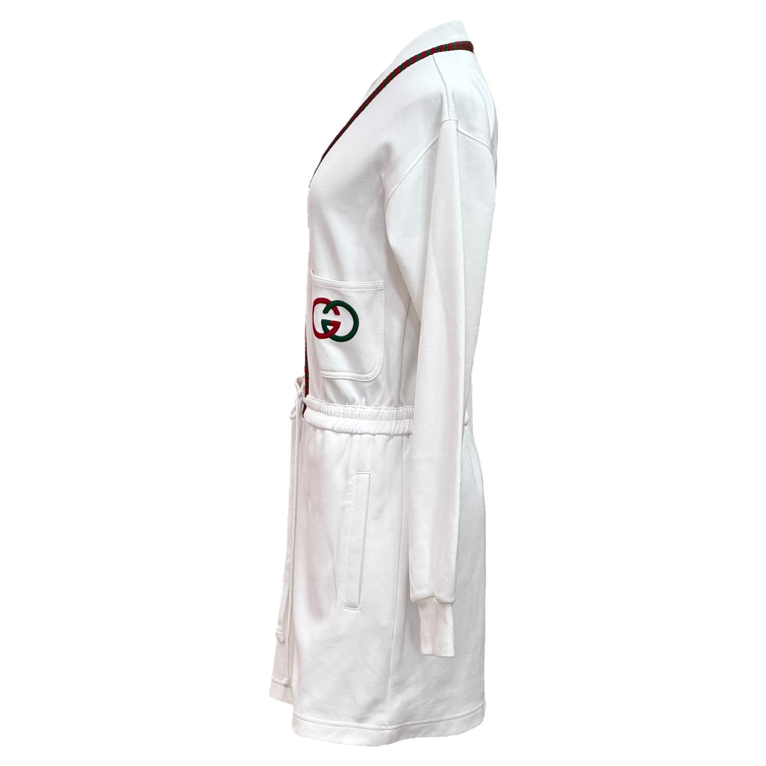 This Gucci white mini dress is tailored in soft cotton, designed with a cinched drawstring waist to create a flattering silhouette. The cardigan-inspired style is detailed with gold-tone GG embossed buttons, signature green and red web trim, and an embroidered GG logo patch, reflecting the house’s iconic heritage with contemporary elegance.