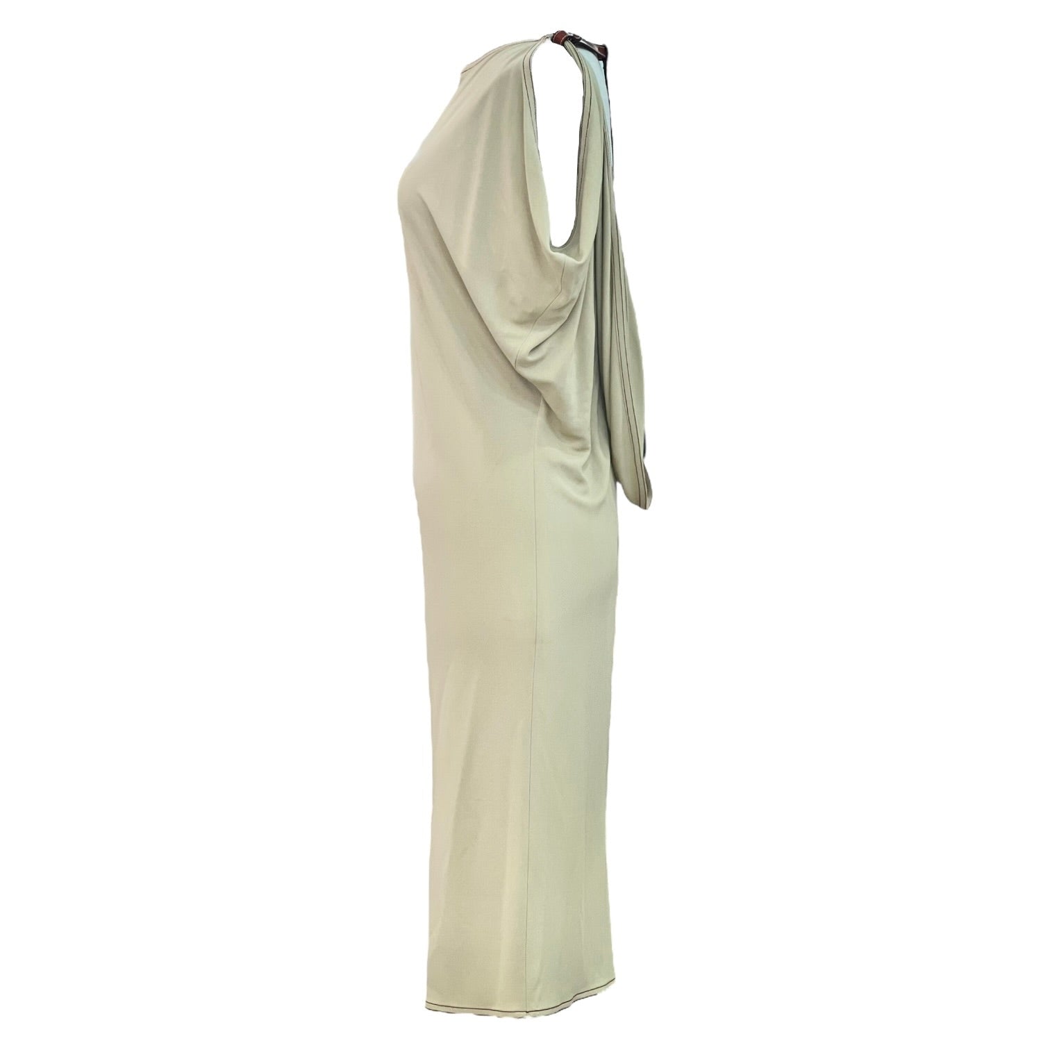 The Hermes Beige Draped Back Dress features elegant fabric flow and a bold brown leather T-strap detail, creating a timeless yet striking look that commands attention at any event.