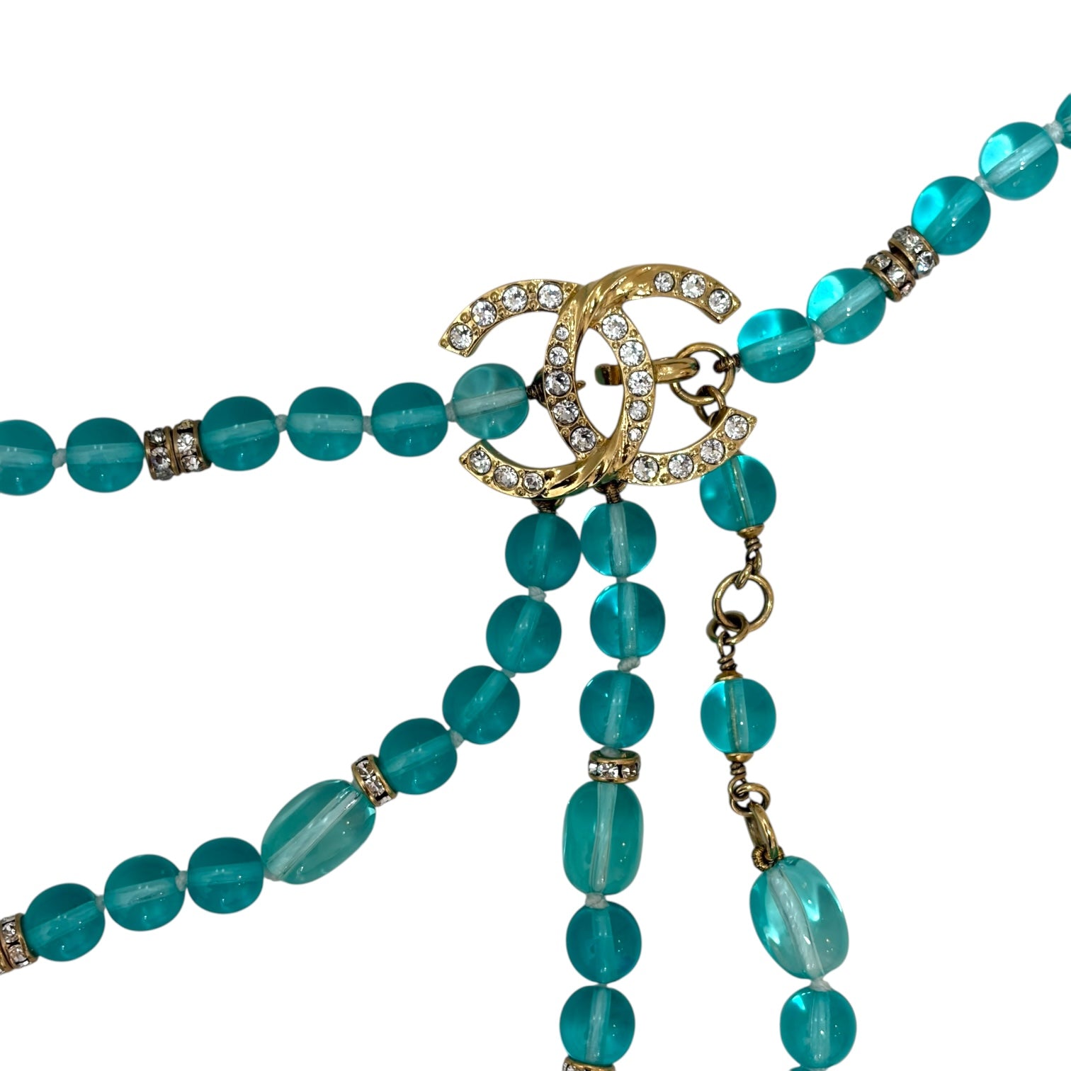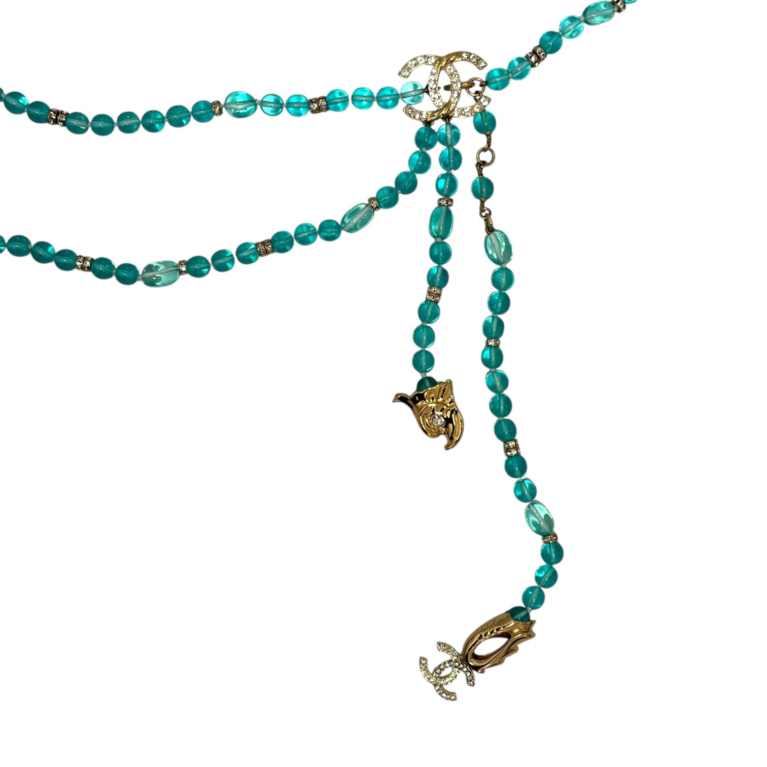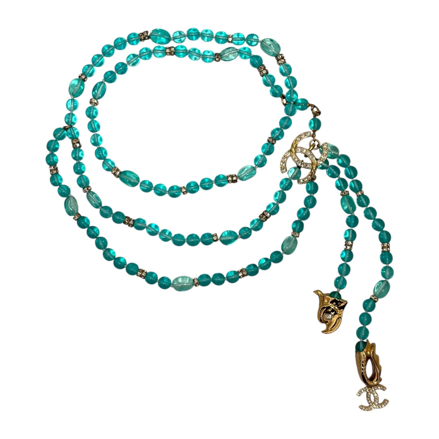 Chanel Turquoise Glass Bead & Crystal CC Logo Multi-Strand Chain Belt With Charms