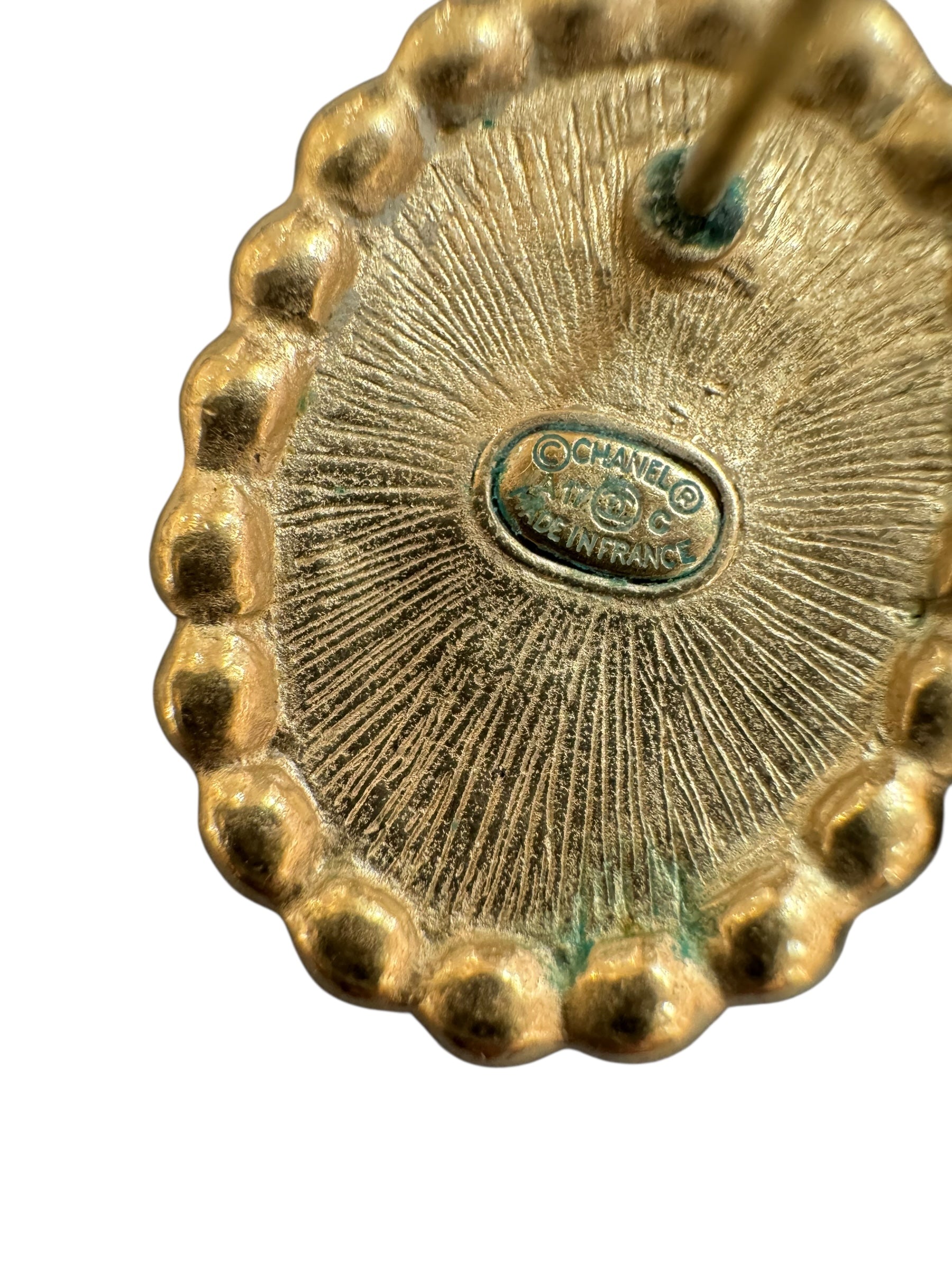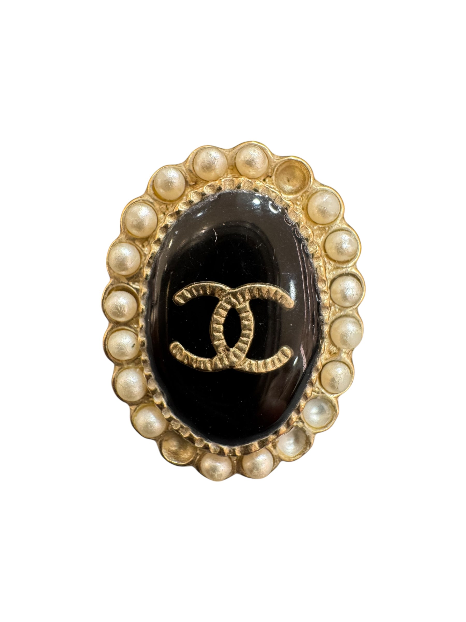 Chanel Oval Black Enamel Stud Earrings with Pearl Trim and Gold CC Logo
