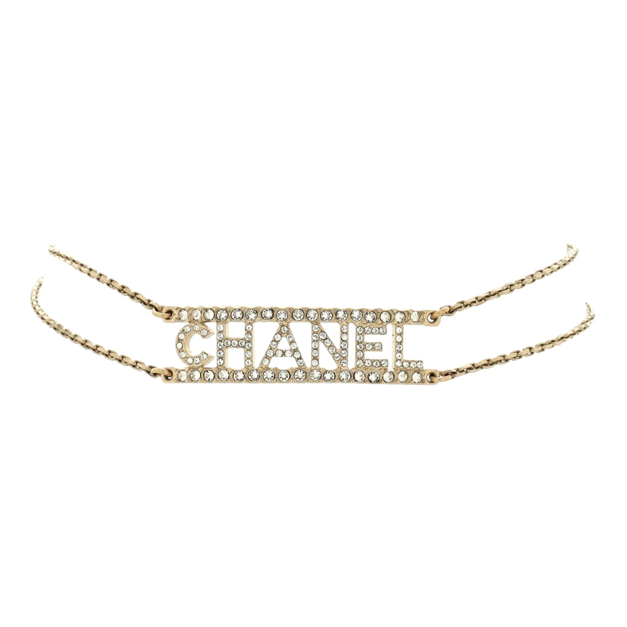 Chanel Gold Metal Crystal Logo Choker Necklace