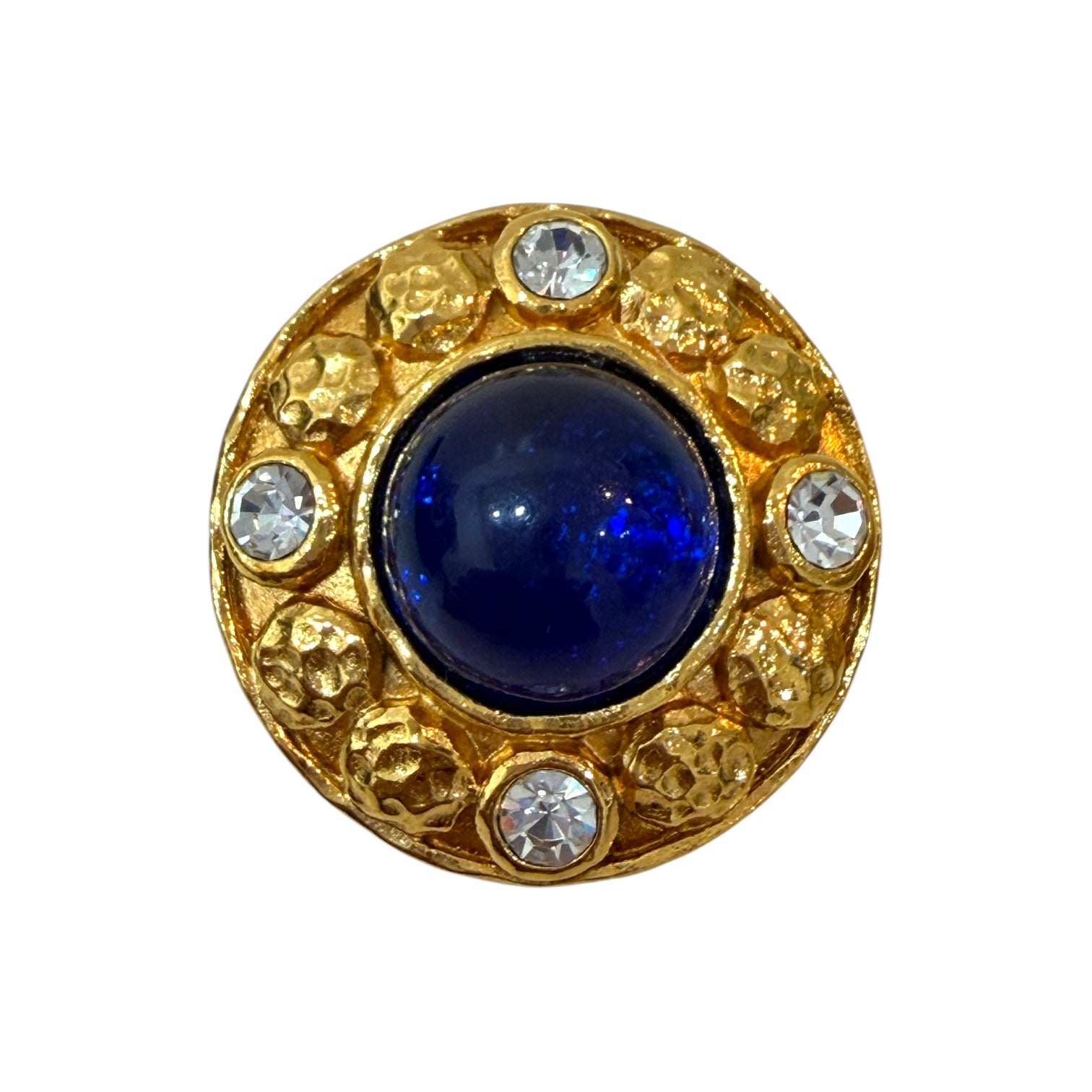 Elegant vintage Chanel clip-on earrings showcasing the Maison’s timeless craftsmanship. Each earring features a richly textured gold-tone round base adorned with a striking cobalt blue Gripoix glass cabochon at the center, framed by sparkling clear crystal rhinestones. The hammered finish adds depth and dimension, while the secure clip-on backing ensures comfortable wear. A statement piece from Chanel’s iconic costume jewellery collections, perfect for adding a touch of Parisian sophistication to any ensemble.