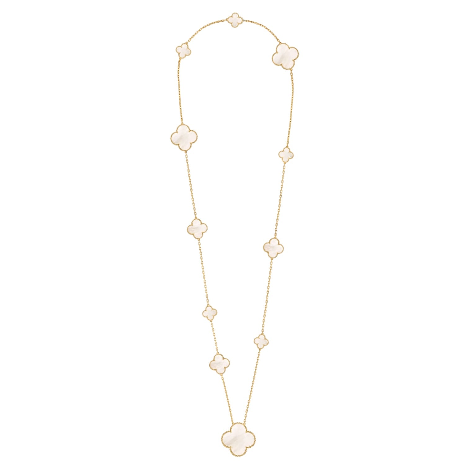 Radiating timeless elegance, this Van Cleef & Arpels Magic Alhambra long necklace is beautifully crafted in 18K yellow gold and adorned with 11 luminous mother-of-pearl motifs in varying sizes. The delicate play of proportions enhances the Maison’s signature four-leaf clover design, a universal emblem of luck, harmony, and beauty.
