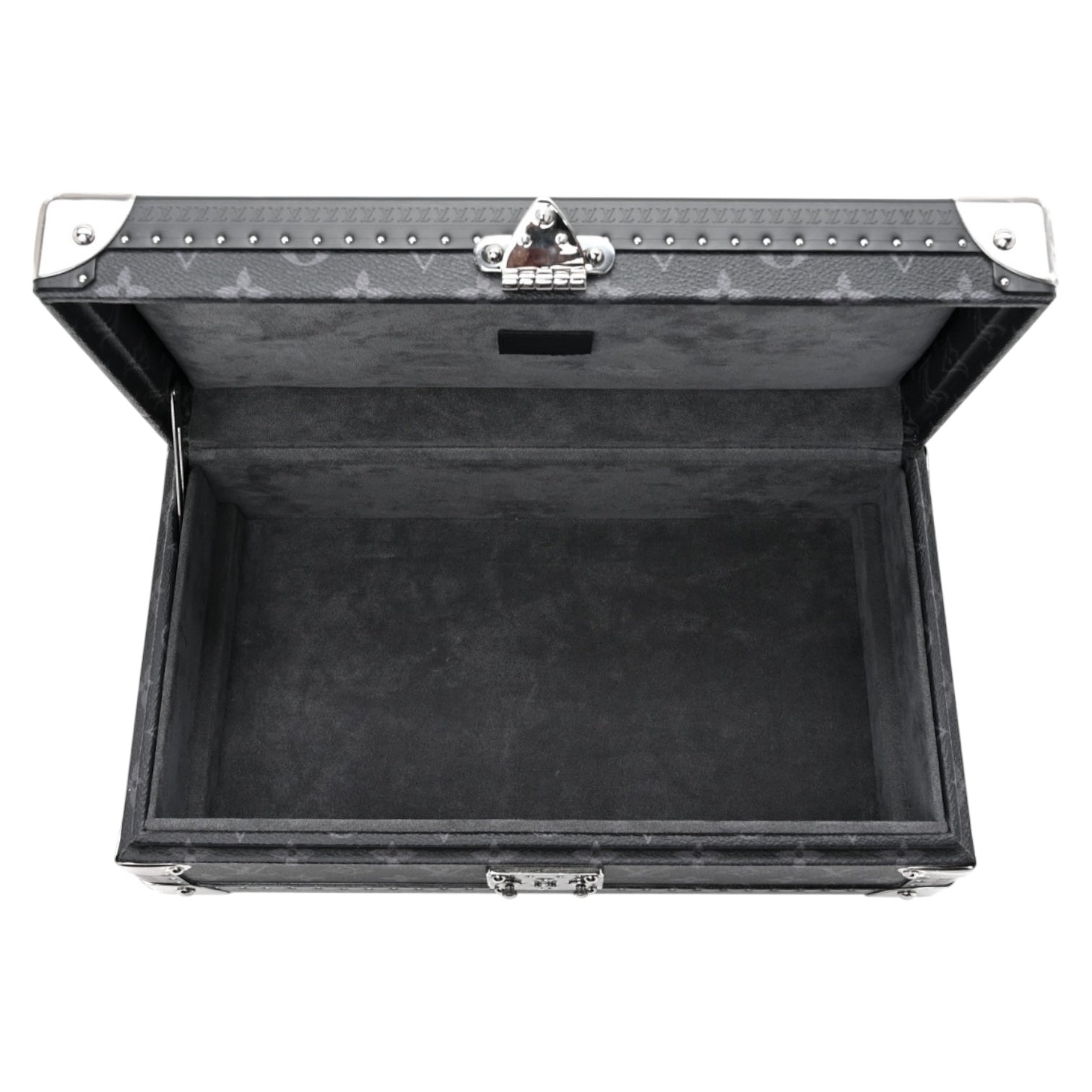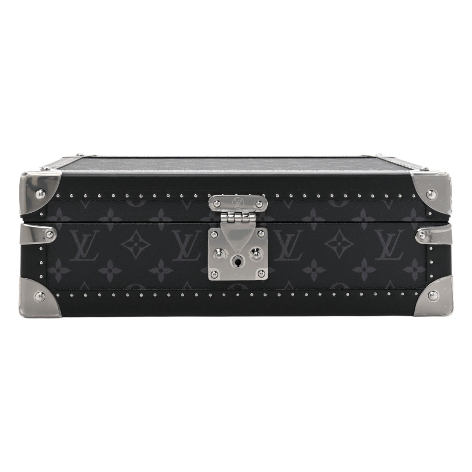 Crafted for the discerning collector, the Louis Vuitton Monogram Eclipse Coffret 8 Watch Case combines the Maison’s timeless heritage with functional luxury. Featuring the signature Monogram Eclipse canvas with sleek black and grey tones, this elegant trunk-style case is finished with reinforced silver-tone hardware and meticulous rivet detailing.
