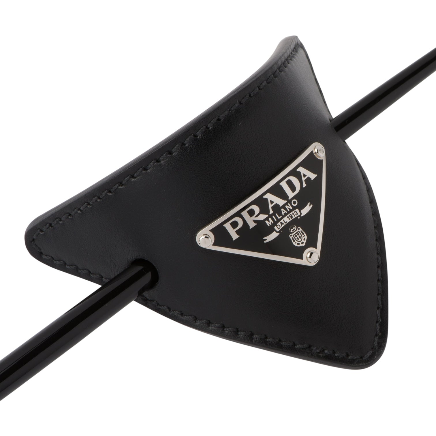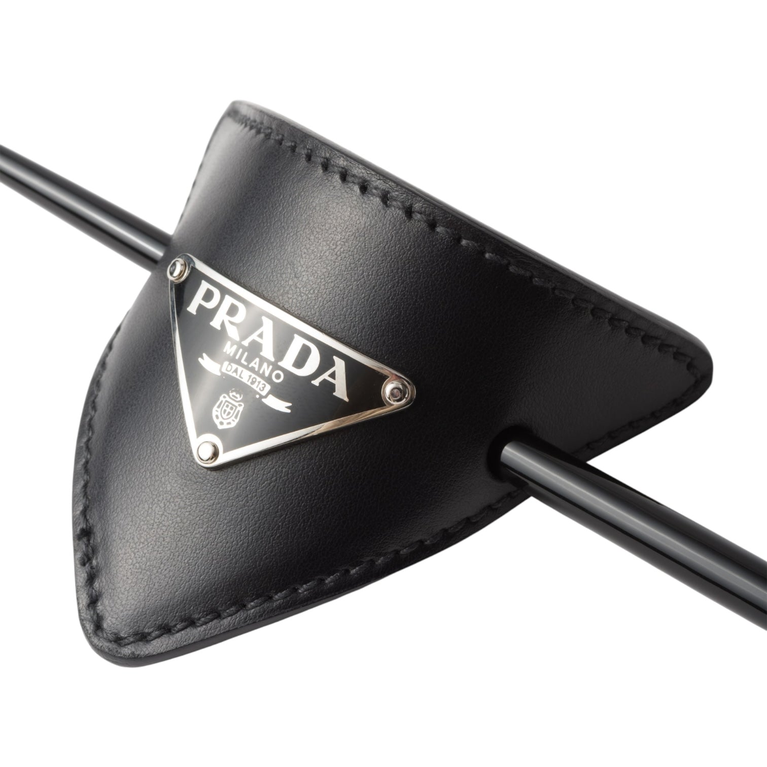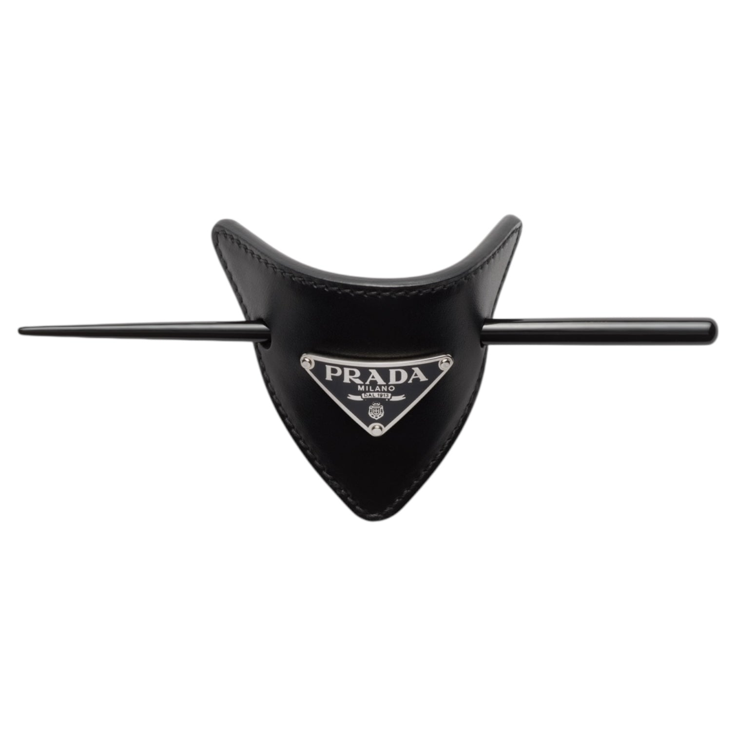 Elevate your hairstyle with Prada’s unique blend of innovation and sophistication. This hair clip is crafted from smooth black leather and adorned with the house’s iconic enamel triangle logo plaque in silver-tone hardware for an instantly recognizable touch of luxury. Designed in a sleek chopstick silhouette, it adds a modern, avant-garde edge to any look while maintaining timeless Prada elegance. A versatile accessory that transitions effortlessly from casual chic to statement-making evening style.