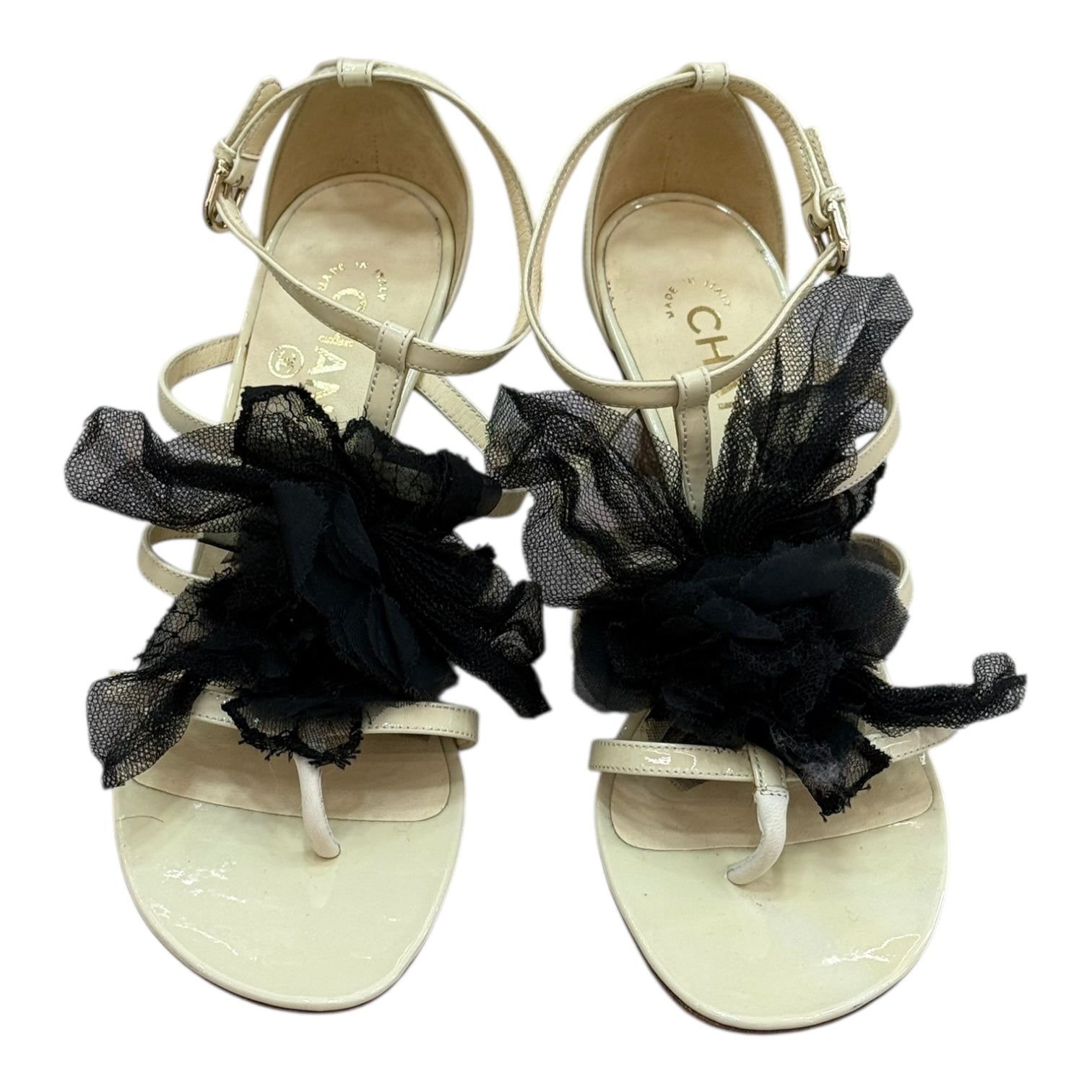 Chanel Beige Patent Leather Sandals with Black Tulle Camellia