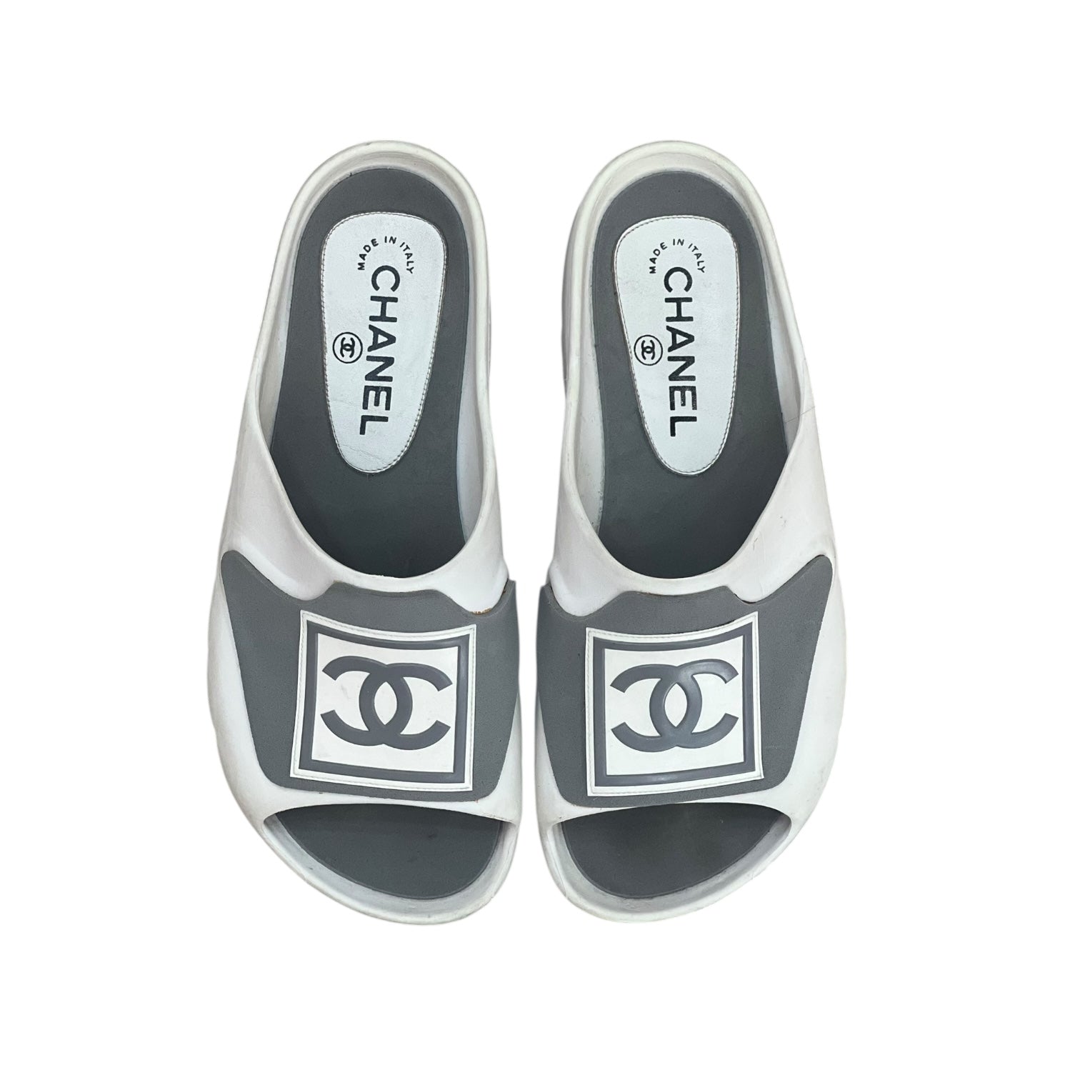 Chanel White & Grey Rubber CC Slide Sandals