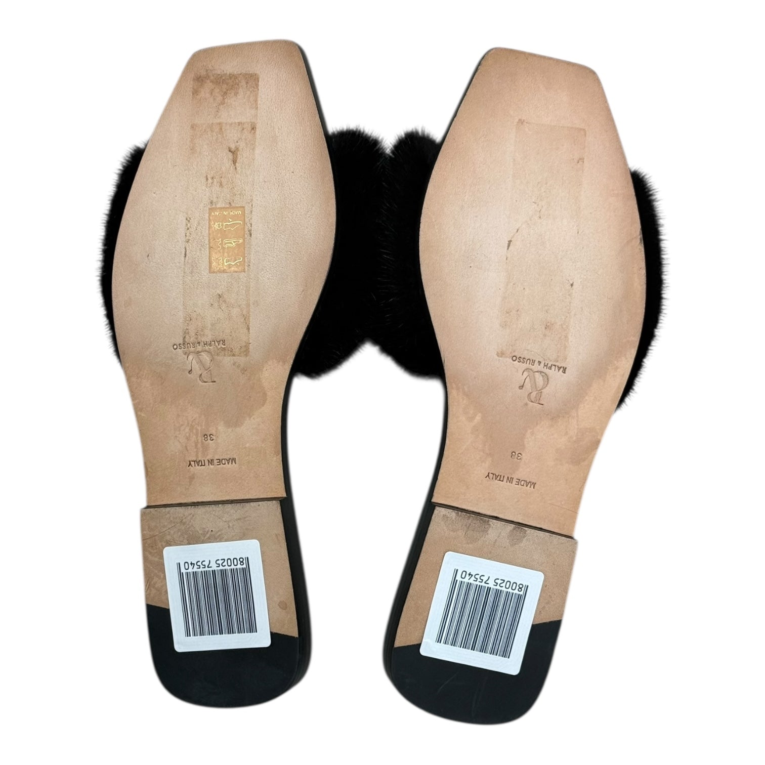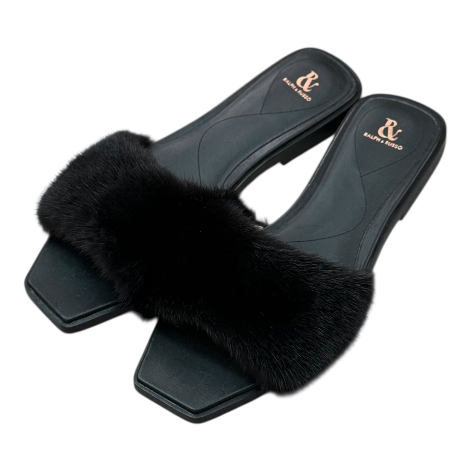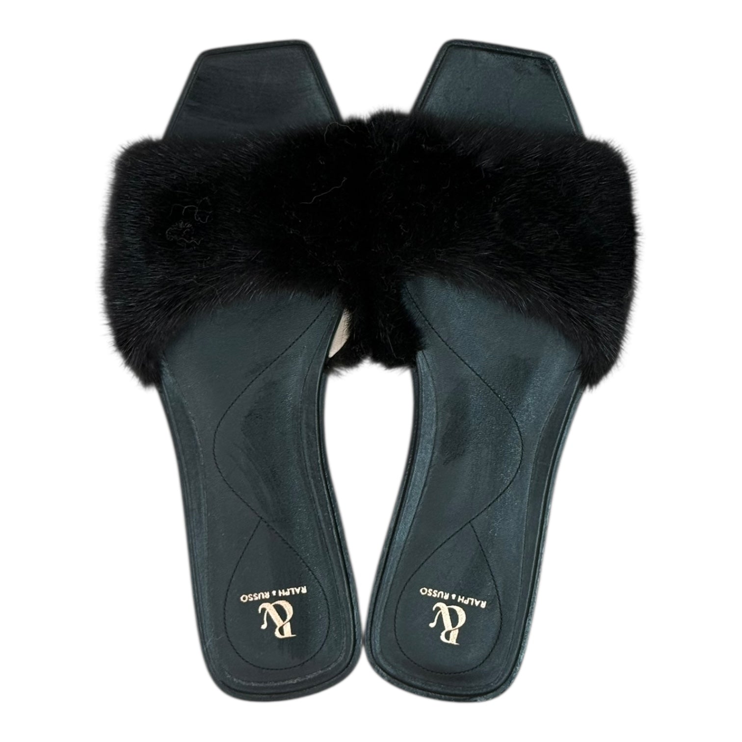 Elegant and luxurious, these Ralph & Russo slides feature a sleek black silhouette topped with a plush fur strap for refined texture and comfort. Designed with a modern square toe and smooth sole, they offer effortless sophistication—perfect for chic lounge looks or relaxed evening styling.