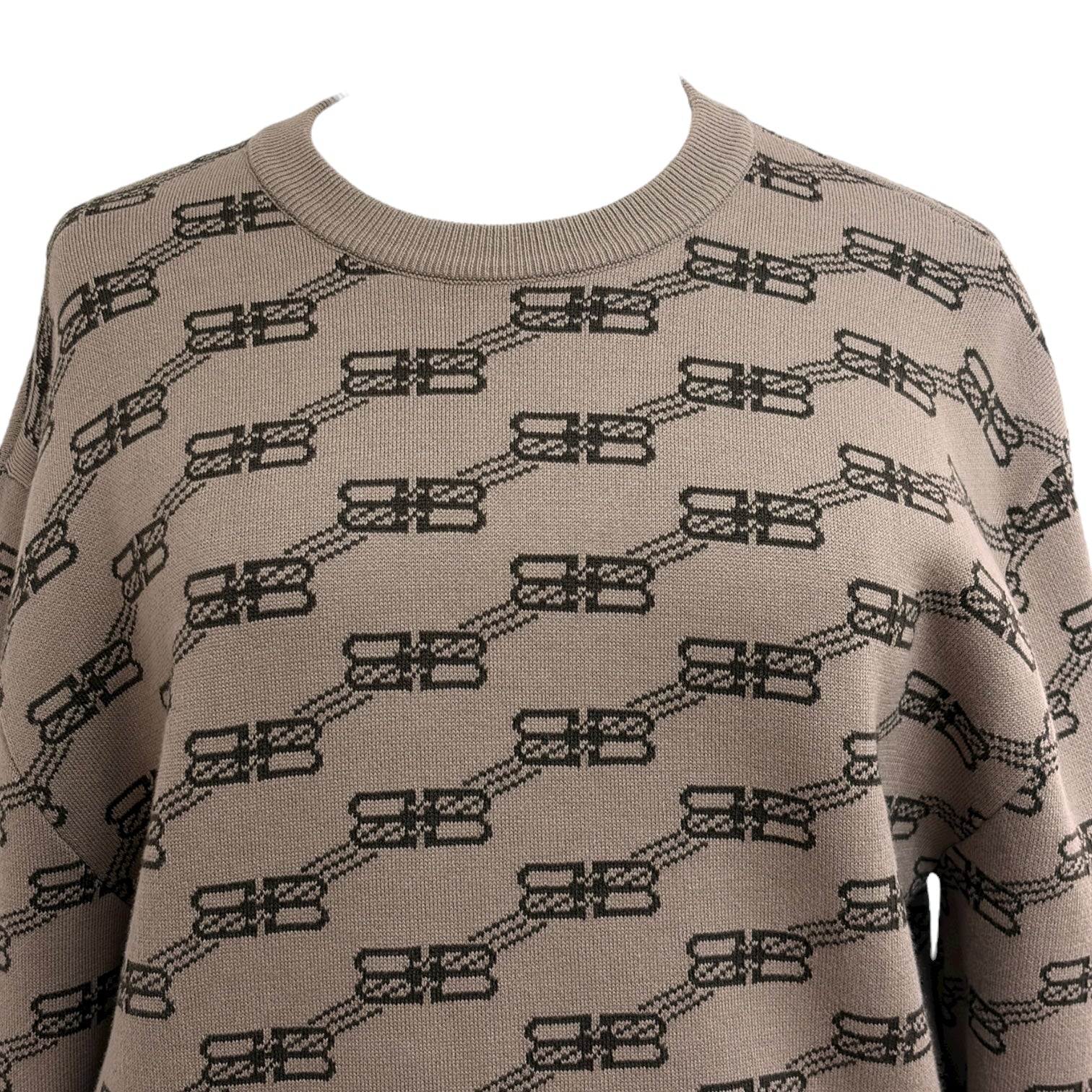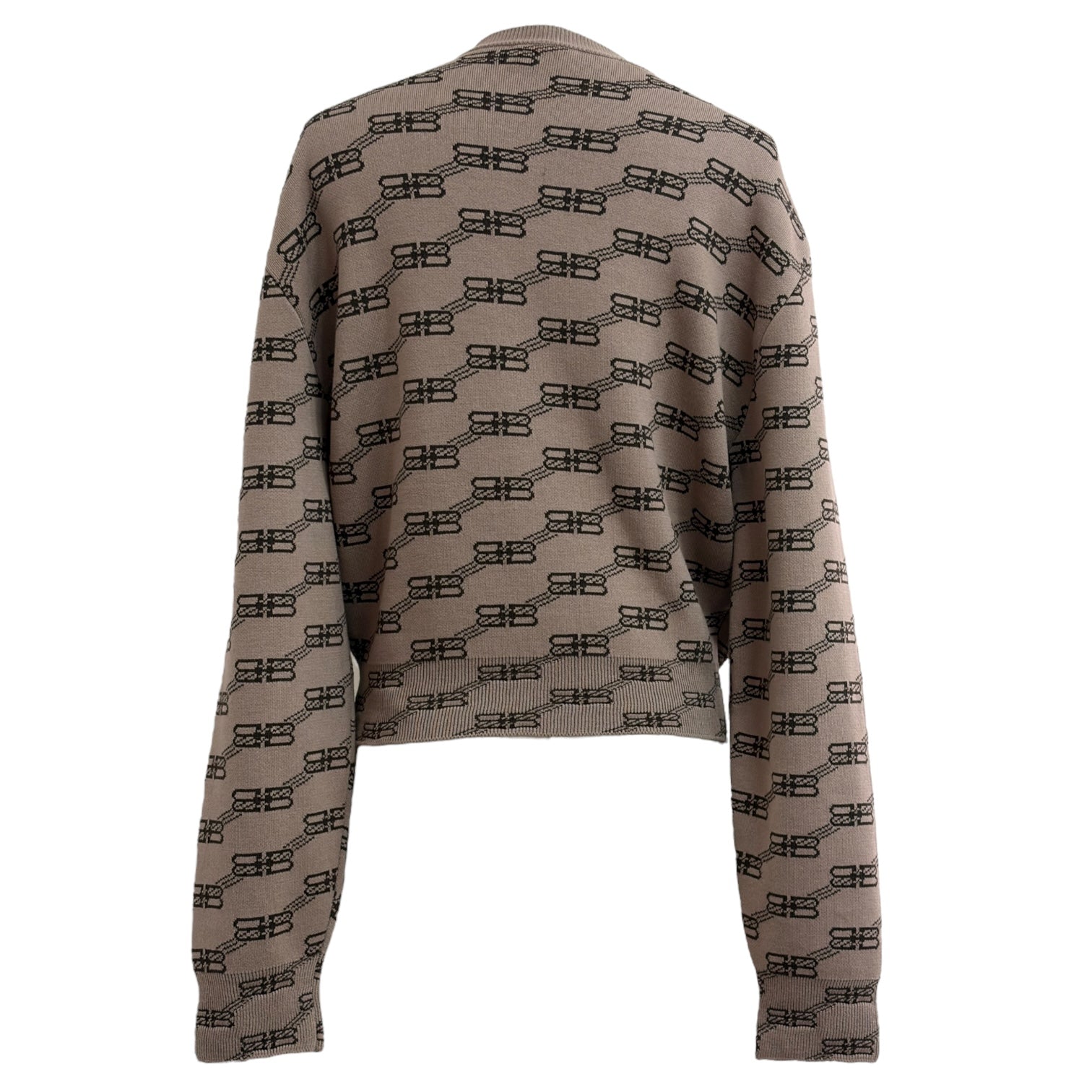 This Balenciaga taupe sweater embodies the brand’s modern minimalist aesthetic with an all-over interlinked chain logo motif in contrasting black. Crafted from a soft, mid-weight knit, it features a relaxed silhouette with dropped shoulders, a ribbed crew neckline, cuffs, and hem for a clean, structured finish. Perfect for layering or standalone wear, this versatile piece combines everyday comfort with Balenciaga’s bold graphic identity — an effortless staple for contemporary wardrobes.
