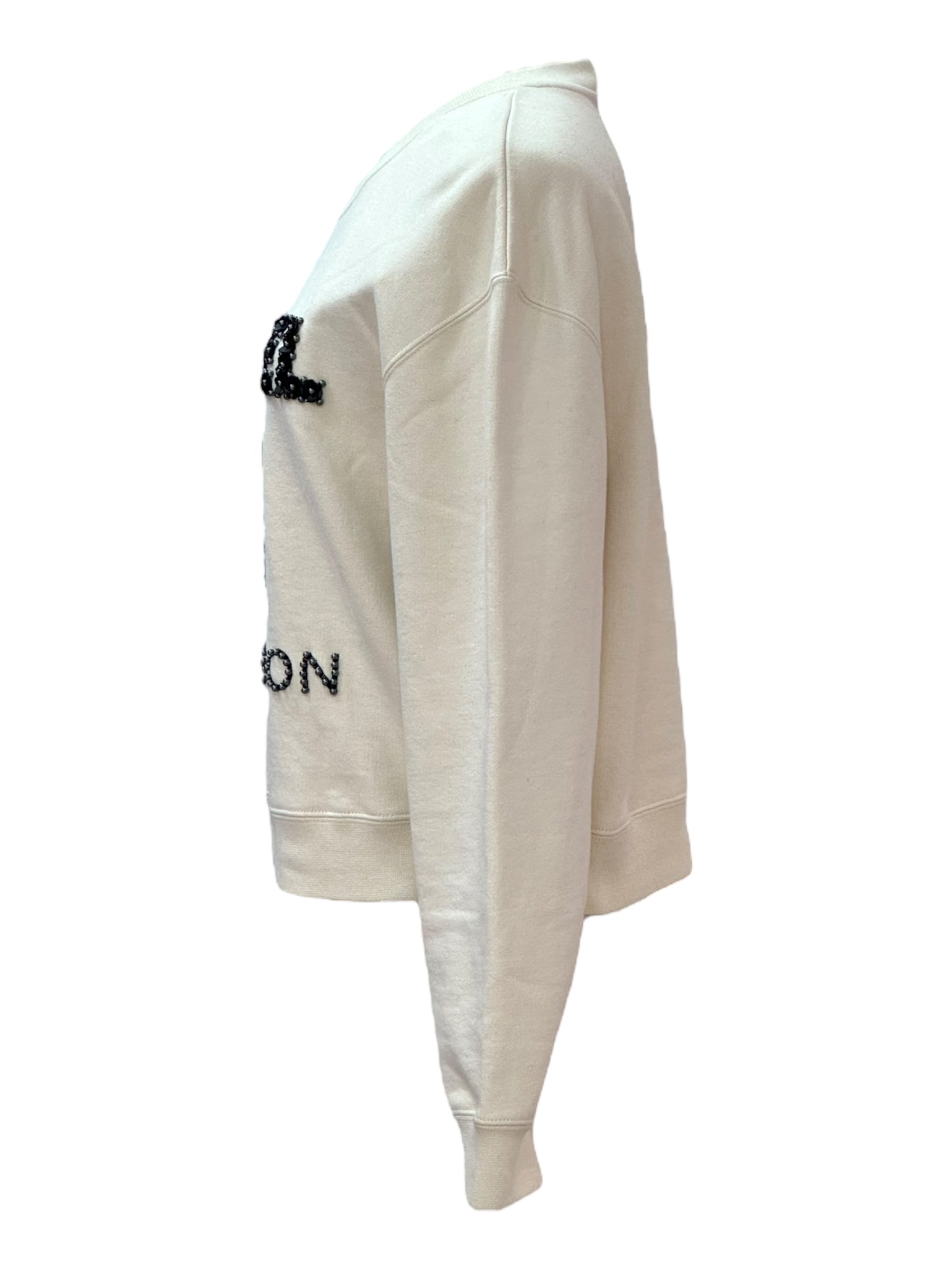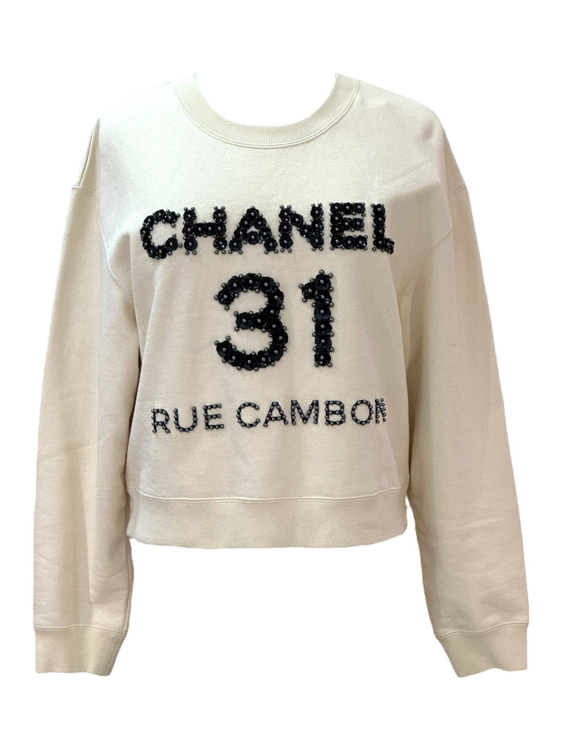 This Chanel ivory sweatshirt celebrates the Maison’s legendary address, 31 Rue Cambon. Crafted in soft cotton, it features bold black lettering embellished with sequins and camellia appliqué for a signature couture touch. A relaxed silhouette combines everyday comfort with timeless Chanel sophistication.