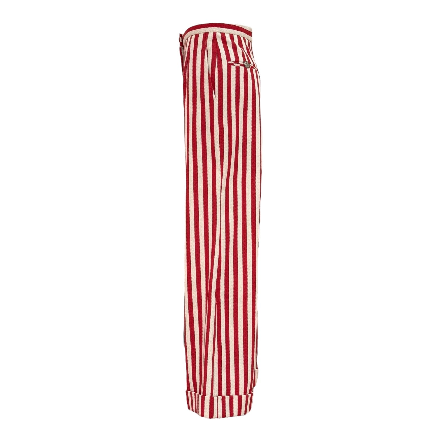 These Chanel Red & White Striped Wide Leg Pants bring bold sophistication with a playful twist. Designed with a high-rise waist and a flattering flared silhouette, they feature vertical stripes that elongate the figure and subtle back pockets for added detail. Perfect for pairing with a crisp blouse or fitted knit, these pants are a statement piece that combines vintage-inspired charm with modern elegance.